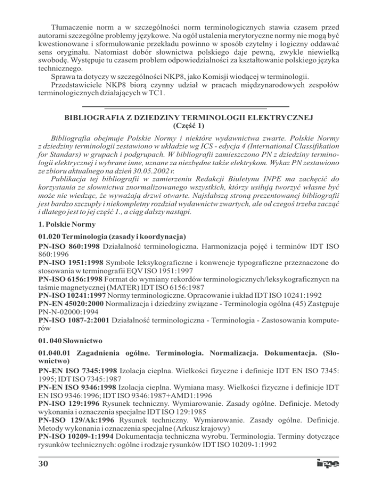 Tłumaczenie norm a w szczególności norm terminologicznych stawia czasem przed autorami szczególne problemy językowe. Na ogół ustalenia merytoryczne normy nie mogą być kwestionowane i sformułowanie przekładu powinno w sposób czytelny i logiczny oddawać sens oryginału. Natomiast dobór słownictwa polskiego daje pewną, zwykle niewielką swobodę. Występuje tu czasem problem odpowiedzialności za kształtowanie polskiego języka technicznego. Sprawa ta dotyczy w szczególności NKP8, jako Komisji wiodącej w terminologii. Przedstawiciele NKP8 biorą czynny udział w pracach międzynarodowych zespołów terminologicznych działających w TC1. BIBLIOGRAFIA Z DZIEDZINY TERMINOLOGII ELEKTRYCZNEJ (Część 1) Bibliografia obejmuje Polskie Normy i niektóre wydawnictwa zwarte. Polskie Normy z dziedziny terminologii zestawiono w układzie wg ICS - edycja 4 (International Classifikation for Standars) w grupach i podgrupach. W bibliografii zamieszczono PN z dziedziny terminologii elektrycznej i wybrane inne, uznane za niezbędne także elektrykom. Wykaz PN zestawiono ze zbioru aktualnego na dzień 30.05.2002 r. Publikacja tej bibliografii w zamierzeniu Redakcji Biuletynu INPE ma zachęcić do korzystania ze słownictwa znormalizowanego wszystkich, którzy usiłują tworzyć własne być może nie wiedząc, że wyważają drzwi otwarte. Najsłabszą stroną prezentowanej bibliografii jest bardzo szczupły i niekompletny rozdział wydawnictw zwartych, ale od czegoś trzeba zacząć i dlatego jest to jej część 1., a ciąg dalszy nastąpi. 1. Polskie Normy 01.020 Terminologia (zasady i koordynacja) PN-ISO 860:1998 Działalność terminologiczna. Harmonizacja pojęć i terminów IDT ISO 860:1996 PN-ISO 1951:1998 Symbole leksykograficzne i konwencje typograficzne przeznaczone do stosowania w terminografii EQV ISO 1951:1997 PN-ISO 6156:1998 Format do wymiany rekordów terminologicznych/leksykograficznycn na taśmie magnetycznej (MATER) IDT ISO 6156:1987 PN-ISO 10241:1997 Normy terminologiczne. Opracowanie i układ IDT ISO 10241:1992 PN-EN 45020:2000 Normalizacja i dziedziny związane - Terminologia ogólna (45) Zastępuje PN-N-02000:1994 PN-ISO 1087-2:2001 Działalność terminologiczna - Terminologia - Zastosowania komputerów 01. 040 Słownictwo 01.040.01 Zagadnienia ogólne. Terminologia. Normalizacja. Dokumentacja. (Słownictwo) PN-EN ISO 7345:1998 Izolacja cieplna. Wielkości fizyczne i definicje IDT EN ISO 7345: 1995; IDT ISO 7345:1987 PN-EN ISO 9346:1998 Izolacja cieplna. Wymiana masy. Wielkości fizyczne i definicje IDT EN ISO 9346:1996; IDT ISO 9346:1987+AMD1:1996 PN-ISO 129:1996 Rysunek techniczny. Wymiarowanie. Zasady ogólne. Definicje. Metody wykonania i oznaczenia specjalne IDT ISO 129:1985 PN-ISO 129/Ak:1996 Rysunek techniczny. Wymiarowanie. Zasady ogólne. Definicje. Metody wykonania i oznaczenia specjalne (Arkusz krajowy) PN-ISO 10209-1:1994 Dokumentacja techniczna wyrobu. Terminologia. Terminy dotyczące rysunków technicznych: ogólne i rodzaje rysunków IDT ISO 10209-1:1992 30 PN-89/N-01224 Bibliotekarstwo i bibliografia. Opracowywanie zbiorów informacji o dokumentach. Terminologia PN-89/N-01225 Bibliotekarstwo i bibliografia. Rodzaje i części składowe bibliografii. Terminologia PN-91/N-01226 Bibliotekarstwo i bibliografia. Rodzaje i działalność bibliotek. Terminologia PN-92/N-01227 Bibliotekarstwo i bibliografia. Typologia dokumentów. Terminologia PN-89/N-01605 Rysunek techniczny. Wykonywanie rysunków. Terminologia PN-90/N-01611 Rysunek techniczny. Wykonywanie dokumentów. Terminologia PN-N-02000:1994 Podstawy działalności normalizacyjnej. Normalizacja i dziedziny związane. Terminologia IDT ISO/IEC GUIDE 2:1991 PN-87/N-09127 Informacja naukowa. Zagadnienia organizacyjne i prawne. Terminologia PN-92/N-99901 Znaki graficzne. Terminologia PN-66/P-55301 Formularze. Podstawowe nazwy i określenia 01.040.03 Socjologia. Usługi. Organizacja i zarządzanie. Administracja. Transport (Słownictwo) PN-ISO 3534-2:1994 Statystyka. Statystyczne sterowanie jakością. Terminologia i symbole IDT ISO 3534-2:1993 PN-ISO 8402:1996 Zarządzanie jakością i zapewnienie jakości. Terminologia IDT ISO 8402:1994 PN-90/N-01051 Rachunek prawdopodobieństwa i statystyka matematyczna. Terminologia EQV ISO/DIS 3534-1:1990 PN-82/N-04001 Eksploatacja obiektów technicznych. Terminologia ogólna PN-90/N-04002 Diagnostyka techniczna. Terminologia ogólna 01.040.07 Matematyka. Nauki przyrodnicze. (Słownictwo) PN-IEC 60050-111:1999 Międzynarodowy słownik terminologiczny elektryki. Fizyka i chemia EQV IEC 60050-111:1996 PN-90/N-02214 Teledetekcja. Terminologia PN-86/N-02207 Geodezja. Terminologia PN-IEC 60050 101:2000 Międzynarodowy słownik terminologiczny elektryki. Matematyka EQV IEC 60050-101:1998 PN-N-02211:2000 Geodezja. Geodezyjne wyznaczanie przemieszczeń. Terminologia podstawowa. Zastępuje: PN-74/N-02211 PN-N-93310:2000 Geodezja. Pomiary realizacyjne. Terminologia. Zastępuje: PN-73/N-99310 PN-EN ISO 8044:2002 Korozja metali i stopów - Podstawowe terminy i definicje Zastępuje PN-69/H-04609 PN-ISO 3534-1:2002 Statystyka - Terminologia i symbole - Część l: Ogólne terminy z zakresu rachunku prawdopodobieństwa i statystyki. Zastępuje PN-90/N-01051 01.040.13 Środowisko. Ochrona zdrowia. Bezpieczeństwo (Słownictwo) PN-ISO 14050:2000 Zarządzanie środowiskowe Terminologia PN-EN 614-1:1999 Maszyny. Bezpieczeństwo. Ergonomiczne zasady projektowania. Terminologia i wytyczne ogólne IDT EN 614-1:1995 PN-IEC 743:1994 Narzędzia i sprzęt stosowany przy pracach pod napięciem. Terminologia. IDT IEC 743:1983 PN-ISO 4225:1999 Jakość powietrza. Zagadnienia ogólne. Terminologia IDT ISO 4225:1994 PN-ISO 4225/Ak 999 Jakość powietrza. Zagadnienia ogólne. Terminologia (Arkusz krajowy) PN-ISO 6107-1:1994 Jakość wody. Terminologia. Lista 1 IDT ISO 6107-1:1986 PN-ISO 8421-1:1997 Ochrona przeciwpożarowa. Terminologia. Terminy ogólne i dotyczące zjawiska pożaru IDT ISO 8421-1