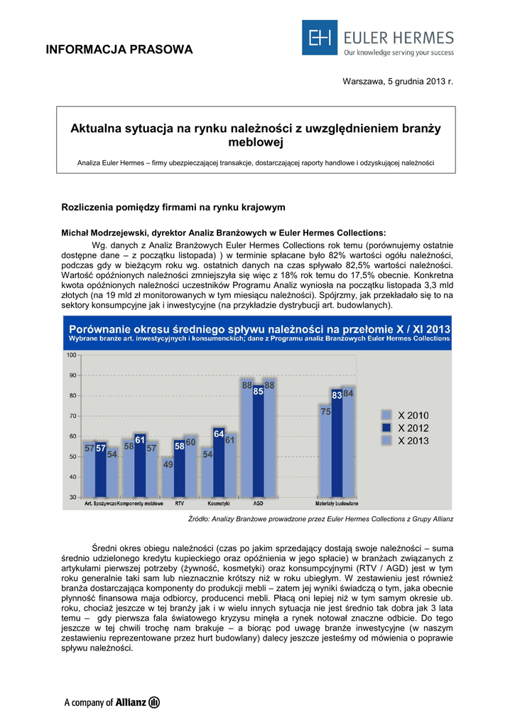 INFORMACJA PRASOWA Warszawa, 5 grudnia 2013 r. Aktualna sytuacja na rynku należności z uwzględnieniem branży meblowej Analiza Euler Hermes – firmy ubezpieczającej transakcje, dostarczającej raporty handlowe i odzyskującej należności Rozliczenia pomiędzy firmami na rynku krajowym Michał Modrzejewski, dyrektor Analiz Branżowych w Euler Hermes Collections: Wg. danych z Analiz Branżowych Euler Hermes Collections rok temu (porównujemy ostatnie dostępne dane – z początku listopada) ) w terminie spłacane było 82% wartości ogółu należności, podczas gdy w bieżącym roku wg. ostatnich danych na czas spływało 82,5% wartości należności. Wartość opóźnionych należności zmniejszyła się więc z 18% rok temu do 17,5% obecnie. Konkretna kwota opóźnionych należności uczestników Programu Analiz wyniosła na początku listopada 3,3 mld złotych (na 19 mld zł monitorowanych w tym miesiącu należności). Spójrzmy, jak przekładało się to na sektory konsumpcyjne jak i inwestycyjne (na przykładzie dystrybucji art. budowlanych). Źródło: Analizy Branżowe prowadzone przez Euler Hermes Collections z Grupy Allianz Średni okres obiegu należności (czas po jakim sprzedający dostają swoje należności – suma średnio udzielonego kredytu kupieckiego oraz opóźnienia w jego spłacie) w branżach związanych z artykułami pierwszej potrzeby (żywność, kosmetyki) oraz konsumpcyjnymi (RTV / AGD) jest w tym roku generalnie taki sam lub nieznacznie krótszy niż w roku ubiegłym. W zestawieniu jest również branża dostarczająca komponenty do produkcji mebli – zatem jej wyniki świadczą o tym, jaka obecnie płynność finansowa maja odbiorcy, producenci mebli. Płacą oni lepiej niż w tym samym okresie ub. roku, chociaż jeszcze w tej branży jak i w wielu innych sytuacja nie jest średnio tak dobra jak 3 lata temu – gdy pierwsza fala światowego kryzysu minęła a rynek notował znaczne odbicie. Do tego jeszcze w tej chwili trochę nam brakuje – a biorąc pod uwagę branże inwestycyjne (w naszym zestawieniu reprezentowane przez hurt budowlany) dalecy jeszcze jesteśmy od mówienia o poprawie spływu należności. Warto także spojrzeć nie tylko na terminy, ale także wartość należności, które trafiają do sprzedających w danych branżach w terminie, jak również te znacznie, bo ponad 4 miesiące opóźnione (tzw. trudne długi, gdyż po takim przeterminowaniu oznaczać mogą straty). Porównując te obydwa źródła danych widać, iż w wielu branżach mamy do czynienia z pewna polaryzacją kontrahentów – spora ich część radzi sobie (i spłaca swoje zobowiązania) stosunkowo lepiej, ale ci którzy nie płacą, zalegają z terminami i kwotami coraz bardziej. Najbardziej widoczne jest to w branżach związanych z inwestycjami – i jest to w dużym stopniu (ale nie tylko) pochodna sytuacji, w jakiej znajduje się branża budowlana. Na szczęście branża meblowa płaci lepiej, niż w tym samym okresie roku ubiegłego – widać więc wyraźnie jak wzrost eksportu odbija się in plus na jej kondycji płatniczej. Spojrzenie na branżę meblarska w szerszej perspektywie Tomasz Starus, Dyrektor Biura Oceny Ryzyka w Euler Hermes Sprzedaż mebli rozwija się dynamicznie głównie dzięki eksportowi, również przy wykorzystaniu ubezpieczenia transakcji – gdyż wszystkie główne rynki tego eksportu to nasze „rodzime rynki”, tzn. mamy tam oddziały, znamy je dobrze i dzięki temu pomagamy eksporterom weryfikować rynek i ograniczać ewentualne straty. Notujemy w tym roku od ubezpieczonych z branży meblowej klientów przeszło 30% wzrost ilości jak i wartości składanych nam zapytań o ocenę odbiorców z zagranicy. Trzeba jednocześnie zaznaczyć, że ilość zgłaszanych nam problemów z odzyskaniem zapłaty jest wciąż na poziomie z lat ubiegłych – co nie dziwi, ponieważ prawdopodobieństwo wystąpienia szkód ponoszonych w eksporcie w porównaniu do sprzedaży na rynku krajowym jest z reguły większa (w stosunku do realizowanego obrotu). Wyższa jest więc rentowność, ale także ryzyko – chociaż zapewne w wielu wypadkach decydujący jest po prostu popyt na polskie meble za granicą. Rynek krajowy jest pod tym względem tradycyjnie za mały w stosunku do mocy produkcyjnych branży, a ponadto w roku bieżącym dodatkowo skurczył się popyt konsumencki. Świadczą o tym upadłości dystrybutorów mebli i artykułów wyposażenia wnętrz – kilka takich przypadków ma miejsce każdego miesiąca. To, iż w tej statystyce rzadziej pojawiają się producenci mebli wynika właśnie z odwrócenia trendu w eksporcie, z czego skutecznie korzystają, oraz – mam takie przekonanie także z naszego udziału w jego zabezpieczaniu. Odzyskiwanie należności Tomasz Delman, Dyrektor Sprzedaży w Euler Hermes Collections Biorąc pod uwagę rok bieżący możemy stwierdzić, że nie ma dużej dynamiki zleceń, natomiast rynek odzyskiwania należności na pewno zmienia się. Większa jest liczba zleceń windykacyjnych, natomiast nieznacznie mniejsza jest średnia wartość zleceń – jest to odbicie spowolnienia gospodarczego, z jakim mieliśmy do czynienia w ubiegłych kwartałach (pamiętajmy, iż zlecenia windykacyjne trafiają do nas z pewnym opóźnieniem po samej transakcji). To właśnie rosnące przeterminowanie zleceń windykacyjnych jest kolejnym charakterystycznym dla chwili obecnej zjawiskiem w odzyskiwaniu należności. Klienci tłumaczą to troską o dobre relacje z odbiorcami, pozostawieniem sobie dłuższego czasu na własne negocjacje – chcą bowiem przygotować sobie dobre relacje, większe zamówienia przed spodziewanym (lub już zachodzącym) odbiciem na rynku. Z pewnością obiektywnie na to patrząc utrudnia to działania windykacyjne, jednak ich skuteczność nie pogorszyła, a dodatkowo polepszyła się w roku bieżącym. Jest to efekt zrewidowania i dostosowania naszych procesów windykacyjnych do obecnej sytuacji