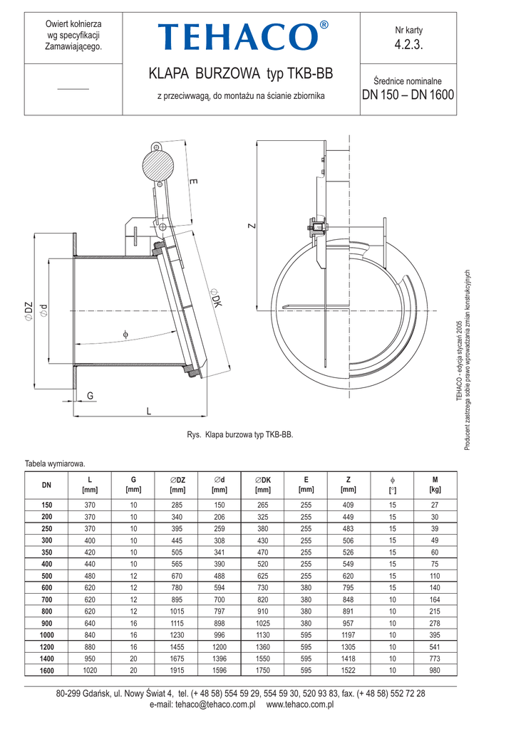Owiert ko³nierza wg specyfikacji Zamawiaj¹cego. Nr karty 4.2.3. KLAPA BURZOWA typ TKB-BB Œrednice nominalne z przeciwwag¹, do monta¿u na œcianie zbiornika DN 150 – DN 1600 DZ d DK TEHACO - edycja styczeñ 2005 Producent zastrzega sobie prawo wprowadzania zmian konstrukcyjnych Z E f G L Rys. Klapa burzowa typ TKB-BB. Tabela wymiarowa. DN L [mm] G [mm] ÆDZ [mm] Æd [mm] ÆDK [mm] E [mm] Z [mm] f [°] M [kg] 150 370 10 285 150 265 255 409 15 27 200 370 10 340 206 325 255 449 15 30 250 370 10 395 259 380 255 483 15 39 300 400 10 445 308 430 255 506 15 49 350 420 10 505 341 470 255 526 15 60 400 440 10 565 390 520 255 549 15 75 500 480 12 670 488 625 255 620 15 110 600 620 12 780 594 730 380 795 15 140 700 620 12 895 700 820 380 848 10 164 800 620 12 1015 797 910 380 891 10 215 900 640 16 1115 898 1025 380 957 10 278 1000 840 16 1230 996 1130 595 1197 10 395 1200 880 16 1455 1200 1360 595 1305 10 541 1400 950 20 1675 1396 1550 595 1418 10 773 1600 1020 20 1915 1596 1750 595 1522 10 980 80-299 Gdañsk, ul. Nowy Œwiat 4, tel. (+ 48 58) 554 59 29, 554 59 30, 520 93 83, fax. (+ 48 58) 552 72 28 e-mail: [email protected] www.tehaco.com.pl