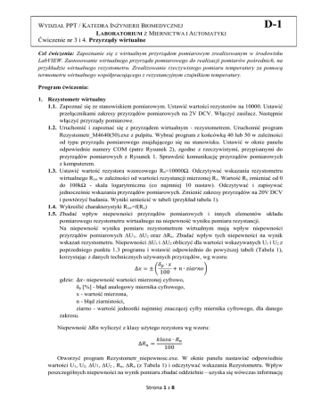 WYDZIAŁ PPT / KATEDRA INŻYNIERII BIOMEDYCZNEJ LABORATORIUM Z MIERNICTWA I AUTOMATYKI Ćwiczenie nr 3 i 4. Przyrządy wirtualne D-1 Cel ćwiczenia: Zapoznanie się z wirtualnym przyrządem pomiarowym zrealizowanym w środowisku LabVIEW. Zastosowanie wirtualnego przyrządu pomiarowego do realizacji pomiarów pośrednich, na przykładzie wirtualnego rezystometru. Zrealizowanie rzeczywistego pomiaru temperatury za pomocą termometru wirtualnego współpracującego z rezystancyjnym czujnikiem temperatury. Program ćwiczenia: 1. Rezystometr wirtualny 1.1. Zapoznać się ze stanowiskiem pomiarowym. Ustawić wartości rezystorów na 10000. Ustawić przełącznikami zakresy przyrządów pomiarowych na 2V DCV. Włączyć zasilacz. Następnie włączyć przyrządy pomiarowe. 1.2. Uruchomić i zapoznać się z przyrządem wirtualnym - rezystometrem. Uruchomić program Rezystometr_M4640(50).exe z pulpitu. Wybrać program z końcówką 40 lub 50 w zależności od typu przyrządu pomiarowego znajdującego się na stanowisku. Ustawić w oknie panelu odpowiednie numery COM (patrz Rysunek 2), zgodne z rzeczywistymi, przypisanymi do przyrządów pomiarowych z Rysunek 1. Sprawdzić komunikację przyrządów pomiarowych z komputerem. 1.3. Ustawić wartość rezystora wzorcowego Rn=10000Ω. Odczytywać wskazania rezystometru wirtualnego Rxw w zależności od wartości rezystancji mierzonej Rx. Wartość Rx zmieniać od 0 do 100kΩ - skala logarytmiczna (co najmniej 10 nastaw). Odczytywać i zapisywać jednocześnie wskazania przyrządów pomiarowych. Zmienić zakresy przyrządów na 20V DCV i powtórzyć badania. Wyniki umieścić w tabeli (przykład tabela 1). 1.4. Wykreślić charakterystyki Rxw=f(Rx) 1.5. Zbadać wpływ niepewności przyrządów pomiarowych i innych elementów układu pomiarowego rezystometru wirtualnego na niepewność wyniku pomiaru rezystancji. Na niepewność wyniku pomiaru rezystometrem wirtualnym mają wpływ niepewności przyrządów pomiarowych ∆U1, ∆U2 oraz ∆Rn. Zbadać wpływ tych niepewności na wynik wskazań rezystometru. Niepewności ∆U1 i ∆U2 obliczyć dla wartości wskazywanych U1 i U2 z poprzedniego punktu 1.3 programu i wstawić odpowiednio do powyższej tabeli (Tabela 1), korzystając z danych technicznych używanych przyrządów, wg wzoru: 𝛿𝑝 ∙ 𝑥 ∆𝑥 = ± ( + 𝑛 ∙ 𝑧𝑖𝑎𝑟𝑛𝑜) 100 gdzie: ∆𝑥- niepewność wartości mierzonej cyfrowo, δp [%] - błąd analogowy miernika cyfrowego, x - wartość mierzona, n - błąd ziarnistości, ziarno - wartość jednostki najmniej znaczącej cyfry miernika cyfrowego, dla danego zakresu. Niepewność ∆Rn wyliczyć z klasy użytego rezystora wg wzoru: ∆𝑅𝑛 = 𝑘𝑙𝑎𝑠𝑎 ∙ 𝑅𝑛 100 Otworzyć program Rezystometr_niepewnosc.exe. W oknie panelu nastawiać odpowiednie wartości U1, U2, ∆U1, ∆U2 , Rn, ∆Rn (z Tabela 1) i odczytywać wskazania Rezystometru. Wpływ poszczególnych niepewności na wynik pomiaru zbadać oddzielnie – uzyska się wówczas informację Strona 1 z 8 D-1 WYDZIAŁ PPT / KATEDRA INŻYNIERII BIOMEDYCZNEJ LABORATORIUM Z MIERNICTWA I AUTOMATYKI Ćwiczenie nr 3 i 4. Przyrządy wirtualne o czułości (wrażliwości) wskazań rezystometru na daną niepewność pomiaru bezpośredniego lub elementu składowego (wzór 3). Obliczyć maksymalną oraz średniokwadratową niepewność wskazań rezystometru, pochodzącą od poszczególnych niepewności. Wykonać wykres zależności Rxw = f(Rx) oraz nanieść dla poszczególnych punktów odpowiednie niepewności ∆Rxw. 1.6. Umieścić w sprawozdaniu wnioski na podstawie analizy otrzymanych wyników. 2. Termometr wirtualny 2.1. Zbadać charakterystyką czujnika temperatury R=f(T) Ustawić zakres pomiarowy przyrządów na 2 V DCV. Badany czujnik umieścić w termostacie i końcówki podłączyć do wyjść makiety oznaczonych jako rezystor Rx. Uruchomić program Rezystometr_M4640(50).exe z pulpitu. Ustawić w oknie panelu odpowiednie numery COM (patrz Rysunek 2), zgodne z rzeczywistymi, przypisanymi do przyrządów pomiarowych z Rysunek 1. Sprawdzić komunikację przyrządów pomiarowych z komputerem. Zbadać charakterystykę wybranego czujnika. Wykonać pomiary rezystancji dla temperatur w zakresie 10 – 60°C ze zmianą co 5°C. Wyniki umieścić w tabeli (przykład Tabela 2). 2.2. Sporządzić wykresy funkcji R=f(T) oraz T=f(R) 2.3. Wyznaczyć funkcję odwrotną – T=f(R) 2.4. Wykonać termometr wirtualny z zadanym czujnikiem. Uruchomić program Termometr_M4640(50).exe z pulpitu. Ustawić w oknie panelu odpowiednie numery COM (patrz Rysunek 3), zgodne z rzeczywistymi, przypisanymi do przyrządów pomiarowych (Rysunek 1) Wpisać wartości wyznaczonych współczynników A i B. Sprawdzić komunikację przyrządów pomiarowych z komputerem. 2.5. Zmierzyć temperaturę wybranego obiektu rzeczywistego i określić niepewność pomiaru tej temperatury. 2.6. Zbadać wpływ niepewności przyrządów pomiarowych i innych elementów układu pomiarowego na niepewność wyniku pomiaru temperatury termometrem wirtualnym. 2.7. Umieścić w sprawozdaniu wnioski na podstawie analizy otrzymanych wyników. Przykładowe tabele pomiarowe: Tabela 1. Wyniki pomiaru rezystancji przyrządem wirtualnym (Rn=10kΩ±ΔRn, zakres woltomierzy……DCV) Lp. Rx[Ω] Rx[Ω] δRx[%] Rxw[Ω] Rxw[Ω] δRxw[%] U1[v] U1[v] δU1[%] U2[v] 1 … Tabela 2. Wyniki pomiaru rezystancji w funkcji temperatury przyrządem wirtualnym T [°C] Lp. ΔT [°C] R [Ω] 1 … Strona 2 z 8 ΔR [Ω] δR [%] U2[v] δU2[%] WYDZIAŁ PPT / KATEDRA INŻYNIERII BIOMEDYCZNEJ LABORATORIUM Z MIERNICTWA I AUTOMATYKI Ćwiczenie nr 3 i 4. Przyrządy wirtualne D-1 Wprowadzenie: Pomiar jest procesem uzyskiwania informacji o cechach (parametrach) mierzonego obiektu. Informacja ta przenoszona jest przez sygnały. Sygnały przenoszące informacje ilościową o wielkościach mierzonych w postaci liczb nazywają się sygnałami pomiarowymi. Elementem umożliwiającym odbiór informa