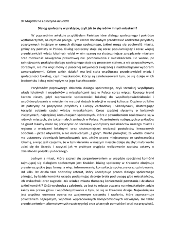 Dr Magdalena Leszczyna-Rzucidło Dialog społeczny w praktyce, czyli jak to się robi w innych miastach? W poprzednim artykule przybliżyłam Państwu idee dialogu społecznego i pokrótce wytłumaczyłam, na czym on polega. Tym razem chciałabym przedstawić konkretne przykłady pozytywnych inicjatyw w ramach dialogu społecznego, jakimi mogą się pochwalić miasta, gminy czy powiaty w Polsce. Dialog społeczny staje się coraz popularniejszy i coraz więcej przedstawicieli władz lokalnych widzi w nim szansę na skuteczniejsze zarządzanie miastem oraz możliwość nawiązania prawdziwej nici porozumienia z mieszkańcami. Co ważne, po zainicjowaniu praktyka dialogu społecznego staje się procesem stałym, a nie przypadkowym, doraźnym, nie ma więc mowy o pozornej aktywności związanej z nadchodzącymi wyborami samorządowymi. Celem takich działań ma być stała współpraca przedstawicieli władz i społeczności lokalnej, czyli mieszkańców, którzy są zainteresowani tym, co się dzieje w ich środowisku i chcą mieć wpływ na jego kształtowanie. Przykładów poprawnego działania dialogu społecznego, czyli szerokiej współpracy władz lokalnych i urzędników z mieszkańcami jest w Polsce coraz więcej. Rosnący trend bardzo cieszy, gdyż zaproszenie społeczności lokalnej do współodpowiedzialności i współdecydowania o mieście nie ma zbyt dużych tradycji w naszej kulturze. Dopiero od kilku lat patrzymy na pozytywne przykłady z Europy Zachodniej i Skandynawii, dostrzegając korzyści oddania części władzy mieszkańcom. Coraz częściej słyszymy o kolejnych inicjatywach, najczęściej konsultacjach społecznych, które z powodzeniem realizowane są w różnych miastach, ale także małych gminach w Polsce. Przeniesienie najlepszych przykładów na grunt lokalny może się przyczynić do szerokiej współpracy mieszkańców naszego miasta i regionu z władzami lokalnymi oraz skuteczniejszej realizacji postulatów kreowanych oddolnie – przez obywateli, a nie narzucanych „z góry”. Warto pamiętać, że władza lokalna ma ustawowy obowiązek konsultowania tzw. aktów prawa miejscowego ze społecznością lokalną, a więc jeśli czujemy, że w tym kierunku w naszym mieście dzieje się zbyt mało warto udać się do Urzędu i zapytać jak w praktyce wygląda realizowanie zapisów ustawy o działalności pożytku publicznego. Jednym z miast, które szczyci się zorganizowaniem w urzędzie specjalnej komórki zajmującej się dialogiem społecznym jest Kraków. Dialog społeczny w Krakowie obejmuje prawie wszystkie jego formy, a więc: informowanie, konsultacje społeczne oraz opiniowanie. Od kilku lat działa tam oddzielny referat, który koordynuje proces dialogu społecznego pilnując, by każda komórka urzędu podejmując decyzje brała pod uwagę głos mieszkańców, ich wskazówki oraz sugestie. Jak władze miasta tłumaczą konieczność powstania i działania takiej komórki? Otóż wychodzą z założenia, ze jest to miasto otwarte na mieszkańców, gdzie każdy ma prawo głosu i współdecydowania o tym, co się w Krakowie dzieje. Najważniejsza jest wspólna rozmowa oparta na wzajemnym szacunku i zaufaniu, która zaprocentuje powstaniem najlepszych, wspólnie wypracowanych kompromisowych rozwiązań, ale także przedstawieniem alternatywnych rozstrzygnięć oraz własnych pomysłów i wizji na przyszłość. Społeczność lokalna zachęcana jest poprzez szerokie kampanie informacyjne do brania udziału w konsultacjach społecznych np. dotyczących zagospodarowania przestrzennego czy cen opłat za śmieci. Kraków stawia na bycie bliżej ludzi – referat kontaktuje się z mieszkańcami za pomocą strony www, punktu konsultacyjnego, organizowane są spotkania w Urzędzie oraz poszczególnych dzielnicach. W trakcie festynów w mieście stoisko dialogu społecznego zachęca do przyjścia i podzielenia się swoją opinią na temat poprawy funkcjonalności czy estetyki otoczenia. Co najważniejsze – inicjatywy podejmowane w Krakowie na stałe wpisały się już w działalność urzędników i powoli stają się niemal warunkiem koniecznym przy podejmowaniu wielu decyzji u urzędzie miasta. Śmiało można powiedzieć, że w zakresie partycypacji społecznej Kraków świeci przykładem, a inne miasta w Polsce powinny naśladować zaangażowanie, jakie wkłada się tam w dialog z mieszkańcami. Niewiele dalej – w Zakopanem powstała niedawno podobna komórka, która swoją pracę rozpoczęła od wyłożenia we wszystkich ważnych punktach w mieście (urzędy pocztowe, apteki, urząd miasta itp.) ankiety, w której prosi się mieszkańców o wskazanie miejsc trudnodostępnych dla osób starszych oraz z ograniczona mobilnością. Po zebraniu opinii zostaną one w dokumencie zbiorczym przekazane do zarządu dróg i zieleni, który postara się poprawić dostępność tych miejsc w ramach swoich obowiązków. Podobną mapę miejsc tworzyli niedawno seniorzy w Sopocie – miasto otrzymało od nich zaznaczone na mapie punkty, które sprawiają kłopot. Za wysoki krawężnik przy przychodni, brak świateł na ruchliwej ulicy, zbyt mała ilość ławek w parku – wszystkie te problemy mieszkańcy zgłaszają władzy lokalnej w ramach dialogu i konsultacji otrzymując reakcję zwrotną w postaci poprawy infrastruktury, która jest dla nich szczególnie ważna. Zasada jest prosta – urzędnik zza biurka nie ma możliwości wskazać wszystkich miejsc wymagających zmian lub poprawy, jeśli nie dostanie informacji od nas – użytkowników. Dlatego im więcej mieszkańców przyłącza się do takich akcji, tym więcej barier w naszym otoczeniu znika, a miasto staje się przyjaźniejsze mieszkańcom. Kolejnym dobrym przykładem jest Poznań, który dba o wszystkie grupy społeczne zamieszkujące miasto. Przykładowo w trakcie przeprowadzania spotkań konsultacyjnych nt. dokumentu Strategii Rozwoju Poznania do roku 2030 zaproponowano między innymi spotkania z 