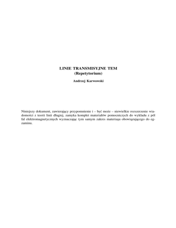 LINIE TRANSMISYJNE TEM (Repetytorium) Andrzej Karwowski Niniejszy dokument, zawierający przypomnienie i – być może – niewielkie rozszerzenie wiadomości z teorii linii długiej, zamyka komplet materiałów pomocniczych do wykładu z pól fal elektromagnetycznych wyznaczając tym samym zakres materiaşu obowiązującego do egzaminu. Spis treści 1 Wprowadzenie 3 2 Elementy teorii linii TEM 2.1 Równania wiążące prąd i napięcie. Parametry jednostkowe linii 2.2 Ogólne rozwiązania równań opisujących linię . . . . . . . . . . 2.3 Fale w linii. Parametry falowe . . . . . . . . . . . . . . . . . . 2.4 Zjawiska falowe w linii o skończonej długości . . . . . . . . . 2.4.1 Współczynnik odbicia. Dopasowanie falowe linii . . . . 2.4.2 Rozkłady prądu i napięcia . . . . . . . . . . . . . . . . 2.4.3 Fala stojąca. Współczynnik fali stojącej . . . . . . . . . 2.4.4 Impedancja wejściowa linii . . . . . . . . . . . . . . . 2 . . . . . . . . . . . . . . . . . . . . . . . . . . . . . . . . . . . . . . . . . . . . . . . . . . . . . . . . . . . . . . . . 4 4 5 6 9 9 10 11 13 Rozdział 1 Wprowadzenie Rzeczywisty obwód elektryczny można uznać za obwód o stałych skupionych, jeżeli prędkość zmian dowolnej wielkości elektrycznej w obwodzie jest na tyle mała, że zmiana tej wielkości w czasie rozchodzenia się fali elektromagnetycznej w dowolnym kierunku obwodu jest dostatecznie mała w porównaniu z całkowitą zmianą tej wielkości w warunkach analizy. W przypadku periodycznych przebiegów elektrycznych oznacza to, że fala elektromagnetyczna zdąży przebiec wzdłuż całego obwodu w czasie znacznie krótszym od okresu przebiegu. Tego rodzaju procesy periodyczne nazywa się procesami kwazistacjonarnymi. Przebiegi elektryczne w obwodzie można uważać za kwazistacjonarne, gdy największy wymiar liniowy obwodu jest znacznie mniejszy od długości fali elektromagnetycznej rozchodzącej się w ośrodku, w którym znajduje się obwód. W praktyce zwykle przyjmuje się, że przebieg periodyczny jest kwazistacjonarny w obwodzie, którego największy wymiar liniowy jest mniejszy od 0.1λ, gdzie λ oznacza długośc fali. Jeśli warunek ten nie jest spełniony, to obwód nie może być traktowany jako obwód o parametrach skupionych, w analizie zaś trzeba uwzględniać fakt, że parametry elektryczne obwodu (pojemność, indukcyjność, itd.) są rozłożone wzdłuż obwodu. Inaczej mówiąc analizę obwodu można prowadzić tylko metodami teorii pola elektromagnetycznego. Zauważmy, że wraz ze wzrostem częstotliwości warunek kwazistacjonarności jest, praktycznie rzecz biorąc, coraz trudniej spełnić. Przykładowo, obwód, którego największy wymiar liniowy wynosi 10 cm, spełnia warunek kwazistacjonarności w zakresie częstotliwości aż do około 300 MHz. Natomiast w pasmie 12 GHz (telewizja satelitarna) warunek ten spełniają obwody, których największy wymiar jest nie większy niż 2.5 mm. W zastosowaniach ważną rolę odgrywają struktury, dla których warunek kwasistacjonarności nie jest spełniony tylko w odniesieniu do jednego wymiaru liniowego, tj. długości. Oczywiście, należy je – ogólnie – traktować jako struktury o parametrach rozłożonych ze wszystkimi tego konsekwencjami. Można jednak przyjąć, że parametry są rozłożone tylko w jednym kierunku, tzn. wzdłuż struktury, co pozwala prowadzić analizę metodami teorii obwodów. Przykładem takich struktur są linie kablowe o torach współosiowych lub symetrycznych wykorzystywane w telekomunikacji do przesyłania sygnałów ze źródła do odległego odbiornika. Na gruncie teorii pola elektromagnetycznego można wykazać, że fala elektromagnetyczna rozchodząca się w torach bezstratnych jest falą TEM. Z tego powodu struktury, o których mowa wyżej, będziemy dalej nazywać liniami TEM albo – nawiązując do terminologii przyjętej w teorii obwodów – liniami długimi. 3 Rozdział 2 Elementy teorii linii TEM 2.1 Równania wiążące prąd i napięcie. Parametry jednostkowe linii Równania wiążące zespolone amplitudy U (z) i I(z) napięcia i prądu, odpowiednio, w dowolnym przekroju linii (patrz Rys. 2.1) w stanie ustalonym przy pobudzeniu sinusoidalnym mają postać dU (z) = (R + jωL)I(z) (2.1) dz dI(z) − = (G + jωC)U (z) (2.2) dz Występujące w równaniach (2.1) parametry R, L, G i C nazywane są parametrami jednostkowymi linii − - jednostkowa rezystancja R (Ω/m) - jednostkowa indukcyjność L (H/m), - jednostkowa konduktancja (upływność) (S/m), - jednostkowa pojemność (F/m) Obrazowo rzecz ujmując parametry jednostkowe określają gęstość, z jaką rezystancja, indukcyjność, upływność i pojemność są rozłożone wzdłuż linii. Wartości tych parametrów zależą od geometrii linii i od właściwości elektrycznych ośrodka zapełniającego przestrzeń między przewodami linii. Można wykazać, że parametry jednostkowe linii wypełnionej materiałem o przenikalności elektrycznej , przenikalności magnetycznej µ i konduktywności σ są powiązane zależnościami G σ = C LC = µ Rys. 2.1. Schemat odcinka linii obciążonej impedancją Z L 4 (2.3) (2.4) Zależności te są bardzo ważne i użyteczne. Z jednej strony, wiążą one jednostkowe parametry linii z parametrami wypełniającego ją ośrodka, z drugiej zaś – umożliwiają wyznaczenie jednostkowej indukcyjności i konduktancji linii, gdy znana jest jej pojemność jednostkowa. Jest to pożyteczne spostrzeżenie, ponieważ obliczanie pojemności jest zazwyczaj łatwiejsze niż obliczanie indukcyjności. 2.2 Ogólne rozwiązania równań opisujących linię Różniczkując względem zmiennej z pierwsze równanie układu (2.1) i podstawiając do otrzymanego wyniku drugie równanie otrzymujemy d2 U (z) − (R + jωL)(G + jωC)U (z) = 0 . dz 2 (2.5) Z kolei eliminując w analogiczny sposób z układu (2.1) napięcie U (z) dochodzimy do równania d2 I(z) − (R + jωL)(G + jωC)I(z) = 0 . (2.6) d