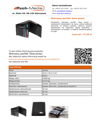 Dane kontaktowe tel. +48 22 122 13 00 , fax. +48 22 122 13 01 email: [email protected] ul. Złota 59, 00-120 Warszawa www: www.tech-media.pl Skórzany portfel 'Dow Jones' Oryginalny skórzany portfel "Dow Jones" z wsuwanymi kieszeniami na karty, jedną siatkową kieszenią na dowód osobisty, dwiema dużymi kieszeniami na banknoty, jedną kieszenią z zatrzaskiem na monety i z owalną metalową płytką na logo. Cena od : 27,58 zł To jest ulotka informacyjna produktu: Skórzany portfel 'Dow Jones' , aby zobaczyć pełną informację wejdź na: www.tech-media.pl/skrzany,portfel,primedow,jones,prime,06490.html lub zeskanuj kod QR. Specyfikacja Kolor czarny Rozmiar 12,5 x 10 x 2 cm Materiał Skóra Waga netto 0,090 kg. Waga brutto 0,113 kg. Znakowanie grawer laserowy, tampondruk Rozmiar znakowania grawer:20x7mm, tampondruk:20x5mm Opakowanie jednostkowe 10 szt. Opakowanie zbiorcze 40 szt. Minimalne zamówienie 20 szt.