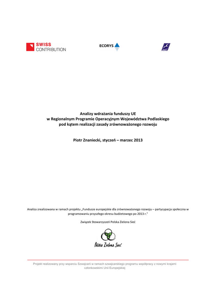 Analizy wdrażania funduszy UE w Regionalnym Programie Operacyjnym Województwa Podlaskiego pod kątem realizacji zasady zrównoważonego rozwoju Piotr Znaniecki, styczeń – marzec 2013 Analiza zrealizowana w ramach projektu „Fundusze europejskie dla zrównoważonego rozwoju – partycypacja społeczna w programowaniu przyszłego okresu budżetowego po 2013 r.” Związek Stowarzyszeń Polska Zielona Sieć Projekt realizowany przy wsparciu Szwajcarii w ramach szwajcarskiego programu współpracy z nowymi krajami członkowskimi Unii Europejskiej 1. Wprowadzenie: Cele regionalnego programu operacyjnego i strategia ich wdrażania ……………….. 3 2. Zrównoważony rozwój w założeniach regionalnego programu operacyjnego …………………………….. 5 3. Zrównoważony rozwój w szczegółowym opisie priorytetów i działań regionalnego programu operacyjnego: priorytety i działania mogące wspierać ochronę przyrody i edukację ekologiczną, transport przyjazny środowisku (kolejowy, miejski, rowerowy), efektywność energetyczną, odnawialne źródła energii, gospodarkę ściekową, gospodarkę odpadami ………………………………………………………….. 7 4. Kryteria wyboru projektów a zasada zrównoważonego rozwoju ………………………………………………….. 10 5. Projekty kluczowe a zrównoważony rozwój ………………………………………………………………………………… 15 6. Alokacje środków finansowych a zrównoważony rozwój …………………………………………………………….. 17 7. Stan wdrażania, ocena barier i rzeczywistej dostępności wsparcia dla obszarów: ochrony przyrody i edukacji ekologicznej, transportu przyjaznego środowisku (kolejowy, miejski), efektywności energetycznej i odnawialnych źródeł energii oraz działań wspierających zrównoważony rozwój ……. 22 8. Podsumowanie i wnioski do programowania na lata 2014-2020 ………………………………………………… 29 1. Wprowadzenie: Cele regionalnego programu operacyjnego i strategia ich wdrażania Województwo podlaskie, z powodu nieefektywnej struktury gospodarki, jest jednym z najbiedniejszych regionów Unii Europejskiej. We wprowadzeniu do RPOWP stwierdzono że jego realizacja ma na celu zmniejszenie różnic w poziomie rozwoju województwa podlaskiego w stosunku do reszty kraju. Sens tego zdania jednoznacznie wskazuje że priorytetowo traktowana jest ekonomia, gdyż walory przyrodnicze woj. podlaskiego plasują się w ścisłej krajowej czołówce, czego nie można powiedzieć o gospodarce. Dlatego też w dalszej części wprowadzenia pojawia się informacja że zapisy zawarte w RPO umożliwią realizację projektów infrastrukturalnych, a także projektów ukierunkowanych na wspieranie sektora MSP, które będą przygotowywane i realizowane przez jednostki samorządu terytorialnego, organizacje pozarządowe, organizacje otoczenia biznesu oraz administrację rządową. Pojęcie ochrony przyrody, ekologii czy zrównoważonego rozwoju na tym etapie nie pojawia się. Natomiast w kolejnym pkt. II. Diagnoza sytuacji społeczno – gospodarczej województwa podlaskiego walory przyrodnicze województwa są określone jako ponadprzeciętne. Regionalny Program Operacyjny Województwa Podlaskiego na lata 2007-2013 wskazuje cele rozwoju wypływające bezpośrednio ze Strategii Rozwoju Województwa Podlaskiego do 2020 roku skorelowane z założeniami strategicznych dokumentów szczebla krajowego i wspólnotowego. Dokument deklaruje że: „wpływ programu na zasadę zrównoważonego rozwoju był przedmiotem strategicznej oceny oddziaływania na środowisko i konsultacji społecznych, a szereg rekomendacji z tym związanych zostało w nim ujętych” oraz że „10% śródków przeznaczono na rozwój infrastruktury ochrony środowiska. Województwo posiada czyste środowisko, które nie wymaga dużych interwencji poprawiających jego stan. Działania ukierunkowane będą głownie na poprawę i rozbudowę sieci kanalizacyjnej oraz rozwój gospodarki wodno-ściekowej. Dodatkowo realizowane będą inwestycje z zakresu odnawialnych źródeł energii. Ich realizacja wpłynie na poprawę warunków życia mieszkańców regionu oraz zwiększy dostępność terenów atrakcyjnych turystycznie”. Cel główny RPO WP: Zwiększenie tempa wzrostu gospodarczego i tworzenie nowych pozarolniczych miejsc pracy przy poszanowaniu i zachowaniu dziedzictwa przyrodniczego i kulturowego regionu (w obszarach: inwestycje, turystyka, przedsiębiorcy). Cele szczegółowe RPO WP: 1. Podniesienie atrakcyjności inwestycyjnej województwa. 2. Podniesienie konkurencyjności podlaskich firm w aspekcie krajowym i międzynarodowym. 3. Rozwój turystyki z wykorzystaniem walorów przyrodniczych i dziedzictwa kulturowego. Ambicją regionu jest osiągnięcie celu głównego poprzez uzyskanie wzrostu poziomu PKB na mieszkańca do wysokości 45, 5% według parytetu siły nabywczej w stosunku do średniej UE27, a także uzyskanie poprawy wartości podstawowych wskaźników społeczno-gospodarczych, szczególnie istotnych z punktu widzenia realizacji Strategii Lizbońskiej. Cel główny Programu wskazuje zatem na konieczność przyspieszenia rozwoju gospodarki województwa poprzez tworzenie nowych, pozarolniczych miejsc pracy (wzrost inwestycji zewnętrznych). RPOWP wskazuje trzy obszary o wysokiej efektywności i dużym potencjale innowacyjnym, ktorych wsparcie daje szansę na utworzenie nowych miejsc pracy: inwestycje (wzrost inwestycji zewnętrznych) i przedsiębiorcy jako najistotniejsze czynniki wzrostu społecznogospodarczego regionu (wzrost inwestycji wewnętrznych) oraz turystyka jako dziedzina gospodarki, dla rozwoju której województwo posiada znaczny, nie w pełni wykorzystany potencjał inwestycyjny oparty na walorach przyrodniczo – krajobrazowo – kulturowych. 3 Realizacja celu głównego odbywać się będzie poprzez osiąg