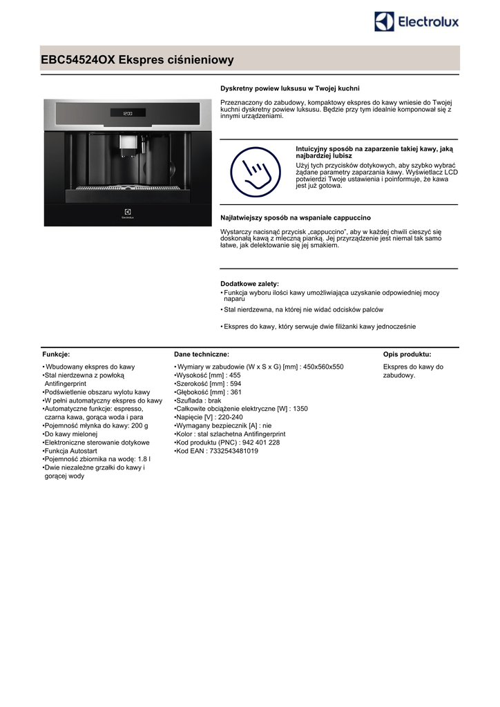 EBC54524OX Ekspres ciśnieniowy Dyskretny powiew luksusu w Twojej kuchni Przeznaczony do zabudowy, kompaktowy ekspres do kawy wniesie do Twojej kuchni dyskretny powiew luksusu. Będzie przy tym idealnie komponował się z innymi urządzeniami. Intuicyjny sposób na zaparzenie takiej kawy, jaką najbardziej lubisz Użyj tych przycisków dotykowych, aby szybko wybrać żądane parametry zaparzania kawy. Wyświetlacz LCD potwierdzi Twoje ustawienia i poinformuje, że kawa jest już gotowa. Najłatwiejszy sposób na wspaniałe cappuccino Wystarczy nacisnąć przycisk „cappuccino”, aby w każdej chwili cieszyć się doskonałą kawą z mleczną pianką. Jej przyrządzenie jest niemal tak samo łatwe, jak delektowanie się jej smakiem. Dodatkowe zalety: • Funkcja wyboru ilości kawy umożliwiająca uzyskanie odpowiedniej mocy naparu • Stal nierdzewna, na której nie widać odcisków palców • Ekspres do kawy, który serwuje dwie filiżanki kawy jednocześnie Funkcje: Dane techniczne: Opis produktu: • Wbudowany ekspres do kawy •Stal nierdzewna z powłoką Antifingerprint •Podświetlenie obszaru wylotu kawy •W pełni automatyczny ekspres do kawy •Automatyczne funkcje: espresso, czarna kawa, gorąca woda i para •Pojemność młynka do kawy: 200 g •Do kawy mielonej •Elektroniczne sterowanie dotykowe •Funkcja Autostart •Pojemność zbiornika na wodę: 1.8 l •Dwie niezależne grzałki do kawy i gorącej wody • Wymiary w zabudowie (W x S x G) [mm] : 450x560x550 •Wysokość [mm] : 455 •Szerokość [mm] : 594 •Głębokość [mm] : 361 •Szuflada : brak •Całkowite obciążenie elektryczne [W] : 1350 •Napięcie [V] : 220-240 •Wymagany bezpiecznik [A] : nie •Kolor : stal szlachetna Antifingerprint •Kod produktu (PNC) : 942 401 228 •Kod EAN : 7332543481019 Ekspres do kawy do zabudowy. EBC54524OX Ekspres ciśnieniowy