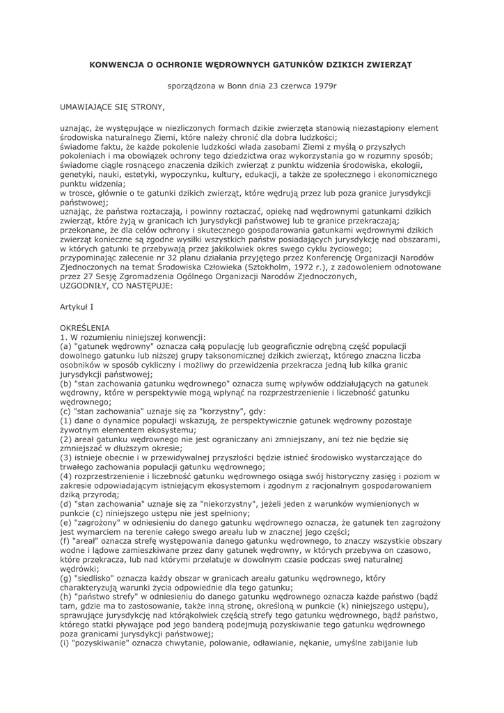 KONWENCJA O OCHRONIE WĘDROWNYCH GATUNKÓW DZIKICH ZWIERZĄT sporządzona w Bonn dnia 23 czerwca 1979r UMAWIAJĄCE SIĘ STRONY, uznając, że występujące w niezliczonych formach dzikie zwierzęta stanowią niezastąpiony element środowiska naturalnego Ziemi, które należy chronić dla dobra ludzkości; świadome faktu, że każde pokolenie ludzkości włada zasobami Ziemi z myślą o przyszłych pokoleniach i ma obowiązek ochrony tego dziedzictwa oraz wykorzystania go w rozumny sposób; świadome ciągle rosnącego znaczenia dzikich zwierząt z punktu widzenia środowiska, ekologii, genetyki, nauki, estetyki, wypoczynku, kultury, edukacji, a także ze społecznego i ekonomicznego punktu widzenia; w trosce, głównie o te gatunki dzikich zwierząt, które wędrują przez lub poza granice jurysdykcji państwowej; uznając, że państwa roztaczają, i powinny roztaczać, opiekę nad wędrownymi gatunkami dzikich zwierząt, które żyją w granicach ich jurysdykcji państwowej lub te granice przekraczają; przekonane, że dla celów ochrony i skutecznego gospodarowania gatunkami wędrownymi dzikich zwierząt konieczne są zgodne wysiłki wszystkich państw posiadających jurysdykcję nad obszarami, w których gatunki te przebywają przez jakikolwiek okres swego cyklu życiowego; przypominając zalecenie nr 32 planu działania przyjętego przez Konferencję Organizacji Narodów Zjednoczonych na temat Środowiska Człowieka (Sztokholm, 1972 r.), z zadowoleniem odnotowane przez 27 Sesję Zgromadzenia Ogólnego Organizacji Narodów Zjednoczonych, UZGODNIŁY, CO NASTĘPUJE: Artykuł I OKREŚLENIA 1. W rozumieniu niniejszej konwencji: (a) "gatunek wędrowny" oznacza całą populację lub geograficznie odrębną część populacji dowolnego gatunku lub niższej grupy taksonomicznej dzikich zwierząt, którego znaczna liczba osobników w sposób cykliczny i możliwy do przewidzenia przekracza jedną lub kilka granic jurysdykcji państwowej; (b) "stan zachowania gatunku wędrownego" oznacza sumę wpływów oddziałujących na gatunek wędrowny, które w perspektywie mogą wpłynąć na rozprzestrzenienie i liczebność gatunku wędrownego; (c) "stan zachowania" uznaje się za "korzystny", gdy: (1) dane o dynamice populacji wskazują, że perspektywicznie gatunek wędrowny pozostaje żywotnym elementem ekosystemu; (2) areał gatunku wędrownego nie jest ograniczany ani zmniejszany, ani też nie będzie się zmniejszać w dłuższym okresie; (3) istnieje obecnie i w przewidywalnej przyszłości będzie istnieć środowisko wystarczające do trwałego zachowania populacji gatunku wędrownego; (4) rozprzestrzenienie i liczebność gatunku wędrownego osiąga swój historyczny zasięg i poziom w zakresie odpowiadającym istniejącym ekosystemom i zgodnym z racjonalnym gospodarowaniem dziką przyrodą; (d) "stan zachowania" uznaje się za "niekorzystny", jeżeli jeden z warunków wymienionych w punkcie (c) niniejszego ustępu nie jest spełniony; (e) "zagrożony" w odniesieniu do danego gatunku wędrownego oznacza, że gatunek ten zagrożony jest wymarciem na terenie całego swego areału lub w znacznej jego części; (f) "areał" oznacza strefę występowania danego gatunku wędrownego, to znaczy wszystkie obszary wodne i lądowe zamieszkiwane przez dany gatunek wędrowny, w których przebywa on czasowo, które przekracza, lub nad którymi przelatuje w dowolnym czasie podczas swej naturalnej wędrówki; (g) "siedlisko" oznacza każdy obszar w granicach areału gatunku wędrownego, który charakteryzują warunki życia odpowiednie dla tego gatunku; (h) "państwo strefy" w odniesieniu do danego gatunku wędrownego oznacza każde państwo (bądź tam, gdzie ma to zastosowanie, także inną stronę, określoną w punkcie (k) niniejszego ustępu), sprawujące jurysdykcję nad którąkolwiek częścią strefy tego gatunku wędrownego, bądź państwo, którego statki pływające pod jego banderą podejmują pozyskiwanie tego gatunku wędrownego poza granicami jurysdykcji państwowej; (i) "pozyskiwanie" oznacza chwytanie, polowanie, odławianie, nękanie, umyślne zabijanie lub usiłowanie takich działań; (j)"porozumienie" oznacza porozumienie międzynarodowe dotyczące ochrony jednego lub wielu gatunków wędrownych, o których mowa w artykułach IV i V niniejszej konwencji; (k) "strona" oznacza państwo lub jakąkolwiek organizację regionalnej integracji gospodarczej utworzoną przez suwerenne państwa, posiadającą uprawnienia do negocjowania, zawierania i stosowania porozumień międzynarodowych w sprawach objętych niniejszą konwencją, dla których niniejsza konwencja weszła w życie. 2. Organizacje regionalnej integracji gospodarczej będące stronami niniejszej konwencji we własnym imieniu w sprawach należących do ich kompetencji korzystają z praw i obowiązków, które niniejsza konwencja nakłada na ich państwa członkowskie. W takich wypadkach państwa członkowskie tych organizacji nie mogą samodzielnie korzystać z tych praw. 3. Jeżeli niniejsza konwencja stanowi, że decyzja ma być podjęta większością dwóch trzecich ,"obecnych i głosujących stron" lub w sposób jednomyślny, oznacza to "strony obecne i oddające głosy za lub przeciw". Przy ustalaniu większości, do "stron obecnych i głosujących" nie zalicza się stron wstrzymujących się od głosu. Artykuł II PODSTAWOWE ZASADY 1. Strony uznają wagę ochrony gatunków wędrownych i zgody państw strefy na podjęcie działań w celu ochrony tych gatunków wszędzie tam, gdzie jest to możliwe i stosowne. W działaniach tych szczególnie uwzględnione być powinny te gatunki zwierząt wędrownych, których stan zachowania jest niekorzystny. W celu ochrony tych gatunków i ich siedlisk właściwe i niezbędne kroki powinny być podejmowane indywidualnie lub we współpracy z innymi państwami strefy tych gatunków. 2. Strony uznają potrzebę podjęcia działań w celu uniknięcia zagrożenia jakiegokolwiek gatunku węd