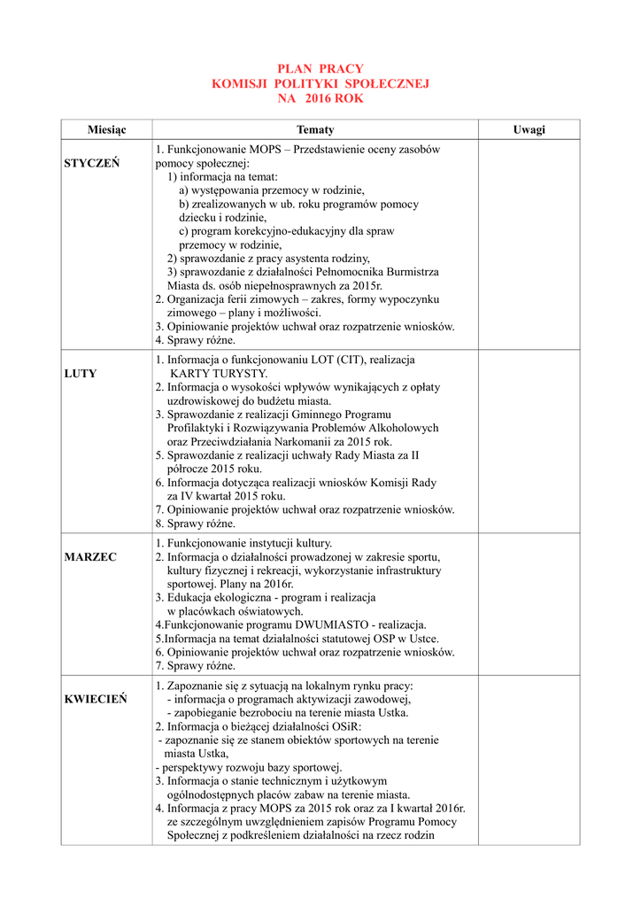 PLAN PRACY KOMISJI POLITYKI SPOŁECZNEJ NA 2016 ROK Miesiąc STYCZEŃ LUTY MARZEC KWIECIEŃ Tematy 1. Funkcjonowanie MOPS – Przedstawienie oceny zasobów pomocy społecznej: 1) informacja na temat: a) występowania przemocy w rodzinie, b) zrealizowanych w ub. roku programów pomocy dziecku i rodzinie, c) program korekcyjno-edukacyjny dla spraw przemocy w rodzinie, 2) sprawozdanie z pracy asystenta rodziny, 3) sprawozdanie z działalności Pełnomocnika Burmistrza Miasta ds. osób niepełnosprawnych za 2015r. 2. Organizacja ferii zimowych – zakres, formy wypoczynku zimowego – plany i możliwości. 3. Opiniowanie projektów uchwał oraz rozpatrzenie wniosków. 4. Sprawy różne. 1. Informacja o funkcjonowaniu LOT (CIT), realizacja KARTY TURYSTY. 2. Informacja o wysokości wpływów wynikających z opłaty uzdrowiskowej do budżetu miasta. 3. Sprawozdanie z realizacji Gminnego Programu Profilaktyki i Rozwiązywania Problemów Alkoholowych oraz Przeciwdziałania Narkomanii za 2015 rok. 5. Sprawozdanie z realizacji uchwały Rady Miasta za II półrocze 2015 roku. 6. Informacja dotycząca realizacji wniosków Komisji Rady za IV kwartał 2015 roku. 7. Opiniowanie projektów uchwał oraz rozpatrzenie wniosków. 8. Sprawy różne. 1. Funkcjonowanie instytucji kultury. 2. Informacja o działalności prowadzonej w zakresie sportu, kultury fizycznej i rekreacji, wykorzystanie infrastruktury sportowej. Plany na 2016r. 3. Edukacja ekologiczna - program i realizacja w placówkach oświatowych. 4.Funkcjonowanie programu DWUMIASTO - realizacja. 5.Informacja na temat działalności statutowej OSP w Ustce. 6. Opiniowanie projektów uchwał oraz rozpatrzenie wniosków. 7. Sprawy różne. 1. Zapoznanie się z sytuacją na lokalnym rynku pracy: - informacja o programach aktywizacji zawodowej, - zapobieganie bezrobociu na terenie miasta Ustka. 2. Informacja o bieżącej działalności OSiR: - zapoznanie się ze stanem obiektów sportowych na terenie miasta Ustka, - perspektywy rozwoju bazy sportowej. 3. Informacja o stanie technicznym i użytkowym ogólnodostępnych placów zabaw na terenie miasta. 4. Informacja z pracy MOPS za 2015 rok oraz za I kwartał 2016r. ze szczególnym uwzględnieniem zapisów Programu Pomocy Społecznej z podkreśleniem działalności na rzecz rodzin Uwagi potrzebujących wsparcia. 5. Informacja o o realizacji wniosków Komisji stałych za I kwartał 2016r. 6. Opiniowanie projektów uchwał oraz rozpatrzenie wniosków. 7. Sprawy różne. MAJ CZERWIEC LIPIEC 1. Opiniowanie wykonania budżetu miasta za 2015 r. w zakresie tematów dotyczących komisji społecznej. 2. Informacja na temat przygotowania miasta pod kątem turystycznym w okresie sezonu letniego – organizacja i bezpieczeństwo. 3. Informacja na temat programów działania miejskich ośrodków kultury w okresie wakacji. 4. Opieka medyczna: 1) dostęp mieszkańców do lekarza i pierwszej pomocy, 2) informacja o funkcjonowaniu służby zdrowia w mieście - placówek POZ i pozostałych, 3) możliwość przeprowadzania szczepień profilaktycznych i realizacja programów. 4) edukacja zdrowotna. 5. DNI MORZA – Informacja na temat przygotowania do obchodów. 6. Wakacje w mieście – wypoczynek letni dzieci i młodzieży – plany i możliwości. 7. Opiniowanie projektów uchwał oraz rozpatrzenie wniosków. 8. Sprawy różne. 1. Informacja na temat funkcjonowania placówek oświatowych na terenie miasta. 2. Wykorzystanie obiektów szkolnych w okresie wakacji. 3. Edukacja morska – program i realizacja w placówkach oświatowych. 4.Analiza arkuszy organizacyjnych szkół i przedszkoli na rok szkolny 2016/2017. 5. Analiza sytuacji oświatowej w mieście. 6. Sprawozdanie z działalności organizacji pozarządowych: - spotkanie z przedstawicielami organizacji, - oferty organizacji pozarządowych. 7. Opiniowanie projektów uchwał oraz rozpatrzenie wniosków. 8. Sprawy różne. 1. Informacja na temat przebiegu sezonu letniego '2016: - stan sanitarny, - czystość miasta, ulice, plaże, promenada, - bezpieczeństwo → miejsca najbardziej niebezpieczne, - przestrzeganie ustaleń wynikających z miejscowego planu zagospodarowania promenady w okresie sezonu. 2. Omówienie wyników testów uczniów szkół podstawowych i gimnazjum. 3. Wyniki nauczania i osiągnięcia przedmiotowe, sportowe i artystyczne w placówkach szkolnych. 4. Informacja o realizacji wniosków komisji stałych RM za II kwartał 2016r. 5. Sprawozdanie z realizacji Gminnego Programu Opieki nad Zabytkami miasta Ustka za lata 2012- 2015 - stan zabytków w mieście. 6. Opiniowanie projektów uchwał oraz rozpatrzenie wniosków. 7. Sprawy różne. SIERPIEŃ WRZESIEŃ Przerwa wakacyjna. 1. Sprawozdanie z realizacji budżetu miasta za I półrocze 2016r. 2. Przygotowanie placówek oświatowych do nowego roku szkolnego: - szkoły, - przedszkola, - żłobek oraz informacja o remontach przeprowadzanych w placówkach w okresie wakacji. 3. Sport masowy – działalność klubów sportowych na terenie miasta. 4. Dyskusja nad założeniami do projektu budżetu na 2017r. propozycje. 5. Zapoznanie się z propozycjami Burmistrza Miasta w spr. kandydatur do nagród dla uczniów za osiągnięcia przedmiotowe, sportowe i artystyczne za rok szkolny 2015/2016. 6. Funkcjonowanie CPD, świetlic środowiskowych i szkolnych na terenie miasta, stan, zapotrzebowanie, organizacja i program działania. 7. Mieszkania komunalne i socjalne, stan bieżący i prognozy – informacja o realizacji przydziału mieszkań komunalnych i socjalnych. 8. Sprawozdanie z realizacji uchwał za I półrocze 2016r. 9. Opiniowanie projektów uchwał oraz rozpatrzenie wniosków. 10. Sprawy różne. PAŹDZIERNIK 1. Informacja o przebiegu sezonu letniego '2016 – omówienie działalności: - Ośrodka Sportu i Rekreacji, - Domu Kultury, - Biblioteki Miejskiej, - Centrum Informacji Turystycznej (LOT) - Wydziału Promocji i Komunikacji Społecznej. 2. Informacja o działalności MOPS : - pomoc niepełnosprawnym, - 