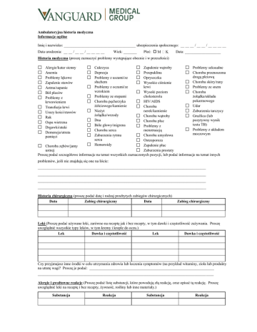 Ambulatoryjna historia medyczna Informacje ogólne Imię i nazwisko: ______________________________________ ubezpieczenia społecznego: __ __ __ / __ __ / __ __ __ __ Data urodzenia: __ __ / __ __ / __ __ __ __ Wiek: _______ Płeć: Data: ___________________ Historia medyczna (proszę zaznaczyć problemy występujące obecnie i w przeszłości) Zapalenie wątroby Problemy seksualne Przepuklina Choroba przenoszona drogą płciową Opryszczka Choroba skóry/rany Wysokie ciśnienie krwi Problemy ze snem Wysoki poziom Choroba cholesterolu żołądka/układu pokarmowego HIV/AIDS Udar Choroba nerek/kamienie Zaburzenia tarczycy Choroba wątroby Gruźlica (lub pozytywny wynik Choroba płuc testu TB) Problemy z Problemy z układem menstruacją moczowym Choroba umysłowa Osteoporoza Zapalenie płuc Choroba zębów/jamy ustnej Zaburzenia prostaty Proszę podać szczegółowe informacje na temat wszystkich zaznaczonych pozycji, lub podać informacje na temat innych Alergie/katar sienny Anemia Problemy lękowe Zapalenie stawów Astma/sapanie Ból pleców Problemy z krwawieniem Transfuzja krwi Urazy kości/stawów Rak Ospa wietrzna Drgawki/ataki Demencja/utrata pamięci Cukrzyca Depresja Problemy z uszami/ze słuchem Problemy z oczami/ze wzrokiem Problemy ze stopami Choroba pęcherzyka żółciowego/kamienie Nieżyt żołądka/wrzody Dna Bóle głowy/migrena Choroba serca Zaburzenia rytmu serca Hemoroidy problemów, jeśli nie znajdują się one na liście: _________________________________________________________________________________________ _________________________________________________________________________________________ _________________________________________________________________________________________ _________________________________________________________________________________________ Historia chirurgiczna (proszę podać datę i rodzaj przebytych zabiegów chirurgicznych) Data Zabieg chirurgiczny Data Zabieg chirurgiczny Leki (Proszę podać używane leki, zarówno na receptę jak i bez recepty, w tym dawki i częstotliwość zażywania. Proszę uwzględnić wszystkie typy leków, w tym kremy i krople do oczu.) Lek Dawka i częstotliwość Lek Dawka i częstotliwość Czy przyjmujesz inne środki w celu utrzymania zdrowia lub leczenia symptomów (na przykład witaminy, zioła lub produkty na utratę wagi? Proszę je podać: __________________________________________________________________ _____________________________________________________________________________________________ Alergie i gwałtowne reakcje (Proszę podać listę substancji, które powodują złą reakcję, oraz opisać tą reakcję. Proszę uwzględnić leki na receptę i bez recepty, żywność, rośliny lub inne materiały.) Substancja Reakcja Substancja Reakcja Historia osobista i przyzwyczajenia (Proszę pamiętać, że mimo iż te pytania są osobiste, udzielone odpowiedzi będą poufne.) Czy jesteś obecnie zatrudniony/a? Jeśli tak, proszę podać zawód: _________________________ Czy jesteś? Czy jesteś aktywny/a seksualnie? Tak Nie Czy masz dzieci? Tak Nie Jeśli tak, proszę o podanie ich wieku? __________________________ Kto mieszka z Tobą w Twoim domu? ____________________________________________________________ Czy w domu potrzebujesz pomocy w poruszaniu się, ubieraniu, kąpaniu, korzystaniu z łazienki, jedzeniu? Jeśli tak, w czym potrzebujesz pomocy? ____________________________________________________________ Czy ćwiczysz? Kiedy ostatnio badałeś/aś zęby? ________________ Kiedy ostatnio badałeś/aś wzrok? _________________ Czy nosisz protezy dentystyczne? Czy ostatnio podróżowałeś/aś lub czy często podróżujesz poza teren USA? ___________________ Bezpieczeństwo Czy w przeciągu ostatnich 6 miesięcy upadłeś/aś? Tak Nie Czy używasz laski, balkoniku lub innego urządzenia pomagającego w przemieszczaniu się? TakNie Czy czujesz się nieswojo lub w jakikolwiek sposób zagrożony/a (w domu, pracy lub w innym miejscu)? Tak Nie Czy byłeś/aś ofiarą przemocy lub nadużycia (w tym seksualnego)? Tak Nie Czy Ty lub członkowie Twojej rodziny posiadają w domu broń? Tak Nie Czy podczas jazdy samochodem zapinasz pasy? Nie Tak Czasami Czy w domu znajdują się wykrywacze dymu? Nie Tak Nie wiem Substancje Czy zażywasz tytoń? Jeśli nie, czy kiedykolwiek zażywałeś/aś tytoń? Jeśli „tak”: Papierosy Liczba i przez jak długo: _______________________________________ Cygara Liczba i przez jak długo: _______________________________________ Tytoń do żucia Ilość i przez jak długo: _______________________________________ Czy w minionym roku kiedykolwiek zażywałeś/aś narkotyki w ilościach większych niż pierwotnie to zakładałeś/a? Tak Nie Czy w minionym roku kiedykolwiek rozważałeś/aś ograniczenie ilości spożywanego alkoholu lub narkotyków? Tak Nie Czy kiedykolwiek zdenerwowałeś/aś się na osobę rozmawiającą z Tobą o Twoim spożyciu alkoholu/zażywaniu narkotyków? Tak Nie Czy kiedykolwiek czułeś/aś się winny/a z powodu spożywania alkoholu/zażywania narkotyków? Tak Nie Czy kiedykolwiek musiałeś/aś z rana wypić „klina” (poranny drink) aby móc rozpocząć dzień? Tak Nie Ile standardowych drinków wypijasz zazwyczaj w ciągu tygodnia? (Standardowy drink to 12 uncji piwa, 5 uncji wina lub 1 kieliszek likieru) 1-7 8-10 11-13 14-20 21-30 31-40 41 lub więcej Odżywianie Jaka jest Twoja przeciętna waga? ____________________ Jaki jest Twój przeciętny wzrost? ______________________ Czy nieumyślnie przybrałeś/aś lub straciłeś/aś 10 funtów w ciągu ostatnich 3 miesięcy? Tak Nie Jak dużo? __________ Czy spożywałeś/aś mniejsze ilości pożywienia przez dłużej niż tydzień? Tak Nie Czy masz problemy z przełykaniem? Tak Nie Czy masz odleżyny lub wrzody skóry? Tak Nie Czy jesteś w trakcie zmodyfikowanej lub specjalnej diety, bądź korzystasz z karmienia przez zgłębnik? Tak Nie Jeśli tak, opisz to: _____________________