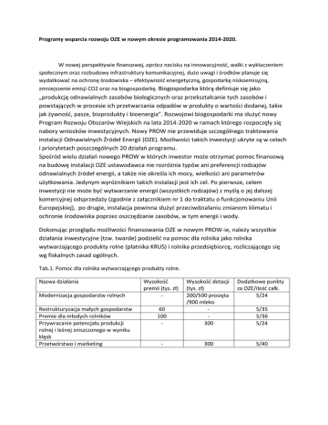 Programy wsparcia rozwoju OZE w nowym okresie programowania 2014-2020. W nowej perspektywie finansowej, oprócz nacisku na innowacyjność, walki z wykluczeniem społecznym oraz rozbudowy infrastruktury komunikacyjnej, dużo uwagi i środków planuje się wydatkować na ochronę środowiska – efektywność energetyczną, gospodarkę niskoemisyjną, zmniejszenie emisji CO2 oraz na biogospodarkę. Biogospodarka którą definiuje się jako „produkcję odnawialnych zasobów biologicznych oraz przekształcanie tych zasobów i powstających w procesie ich przetwarzania odpadów w produkty o wartości dodanej, takie jak żywność, pasze, bioprodukty i bioenergia”. Rozwojowi biogospodarki ma służyć nowy Program Rozwoju Obszarów Wiejskich na lata 2014-2020 w ramach którego rozpoczęły się nabory wniosków inwestycyjnych. Nowy PROW nie przewiduje szczególnego traktowania instalacji Odnawialnych Źródeł Energii (OZE). Możliwości takich inwestycji ukryte są w celach i priorytetach poszczególnych 20 działań programu. Spośród wielu działań nowego PROW w których inwestor może otrzymać pomoc finansową na budowę instalacji OZE ustawodawca nie rozróżnia typów ani preferencji rodzajów odnawialnych źródeł energii, a także nie określa ich mocy, wielkości ani parametrów użytkowania. Jedynym wyróżnikiem takich instalacji jest ich cel. Po pierwsze, celem inwestycji nie może być wytwarzanie energii (wszystkich rodzajów) z myślą o jej dalszej komercyjnej odsprzedaży (zgodnie z załącznikiem nr 1 do traktatu o funkcjonowaniu Unii Europejskiej), po drugie, instalacja powinna służyć przeciwdziałaniu zmianom klimatu i ochronie środowiska poprzez oszczędzanie zasobów, w tym energii i wody. Dokonując przeglądu możliwości finansowania OZE w nowym PROW-ie, należy wszystkie działania inwestycyjne (tzw. twarde) podzielić na pomoc dla rolnika jako rolnika wytwarzającego produkty rolne (płatnika KRUS) i rolnika przedsiębiorcę, rozliczającego się wg fiskalnych zasad ogólnych. Tab.1. Pomoc dla rolnika wytwarzającego produkty rolne. Nazwa działania Modernizacja gospodarstw rolnych Restrukturyzacja małych gospodarstw Premie dla młodych rolników Przywracanie potencjału produkcji rolnej i leśnej zniszczonego w wyniku klęsk Przetwórstwo i marketing Wysokość premii (tys. zł) - Dodatkowe punkty za OZE/ilość całk. 5/24 60 100 - Wysokość dotacji (tys. zł) 200/500 prosięta /900 mleko 300 - 300 5/40 5/35 5/36 5/24 Tab.2. Pomoc dla rolnika przedsiębiorcy. Nazwa działania Premie na rozpoczęcie działalności pozarolniczej Rozwój przedsiębiorczości- rozwój usług rolniczych LEADER – realizacja operacji w ramach LSR Przetwórstwo i marketing produktów rolnych Wysokość premii (tys. zł) 100 Wysokość dotacji (zł) - Dodatkowe punkty za OZE 5/24 - 500 5/35 50/100 300/500 5/30 - 3 mln 5/40 Z zestawień zawartych w tabelach 1 i 2 wynika, że zastosowanie w gospodarstwie rolnym czy przedsiębiorstwie zajmującym się przetwarzaniem lub handlem produktami rolnymi instalacji OZE bądź innych rozwiązań pro środowiskowych wyraźnie zwiększa szanse otrzymania dotacji lub premii, które w obecnej perspektywie przyznawane będą wyłącznie na podstawie przeprowadzanych naborów konkursowych. Przykładem promowania zastosowania innowacyjnych rozwiązań, np. zmniejszających emisje CO2, jest działanie ujęte w nowym PROW-wie: EPI „Współpraca”, w którym bardzo korzystnie (100%/90%/50%) finansowane jest opracowanie i wdrażanie nowych innowacyjnych metod czy konkretnych technologii produkcji lub przetwórstwa rolnego. Technologie OZE albo podwyższające efektywność energetyczną można najczęściej spotkać w inwestycjach w przetwórstwie spożywczym ze współfinansowaniem z działania „Zwiększenie wartości dodanej podstawowej produkcji rolnej czy leśnej”. Mamy już kilka z powodzeniem funkcjonujących przekładów: - biogazownie zintegrowane – mleczarstwo, gorzelnie, ubojnie. - kotłownie biomasowe – mleczarnie, zakłady mięsne, przetwórnie owocowo-warzywne; - instalacje hybrydowe – mała turbina wiatrowa +PV - powtórne wykorzystanie wód technologicznych – mleczarstwo, koncentraty jabłkowe. Jednym z głównych miejsc koncentracji środków dostępnych dla OZE będzie Program Operacyjny Infrastruktura i Środowisko 2014-2020. Ponadto projekty w obszarze OZE będą również wdrażanie poprzez Regionalne Programy Operacyjne. Łączne dofinansowanie ze środków UE wyniesie ok. 1,2 mld EURO. Według danych Ministerstwa Infrastruktury i Rozwoju na POIiŚ przeznaczono 300 mln EURO (25%), natomiast ma RPO 897 387 314 EURO (75%). Planuje się , że energetyka prosumencka będzie finansowana z RPO natomiast w ramach POIiS będą wspierane projekty większych mocy wytwórczych o charakterze ponadregionalnym. Działania w ramach RPO przewidziane są w zależności od województwa w dwóch priorytetach inwestycyjnych: 1. Wspieranie wytwarzania i dystrybucji energii pochodzącej ze źródeł odnawialnych oraz 2. Wspieranie efektywności energetycznej, inteligentnego zarządzania energią i wykorzystania odnawialnych źródeł energii w infrastrukturze publicznej, w tym w budynkach publicznych i w sektorze mieszkaniowym. Informacji o naborach wniosków należy szukać na stronach urzędów marszałkowskich województw. Program Prosument Narodowego Funduszu Ochrony Środowiska i Gospodarki Wodnej Do końca 2014 r. trwał realizowany przez Narodowy Fundusz Ochrony Środowiska i Gospodarki Wodnej (NFOŚiGW) program dotacji do zakupu kolektorów słonecznych. Program cieszy się dużą popularnością, o czym świadczy zbudowanie w ciągu 3,5 lat (ze wsparciem NFOŚiGW) 58 019 instalacji na kwotę dotacji 387 691 tys. zł. o łącznej powierzchni 414, 6 tys. m2 . Kontynuatorem jest program „Prosument” Program Prosument został ogłoszony przez NFOŚiGW w 2014 r. i zastąpił opisany powyżej program dotacji na zakup instalacj