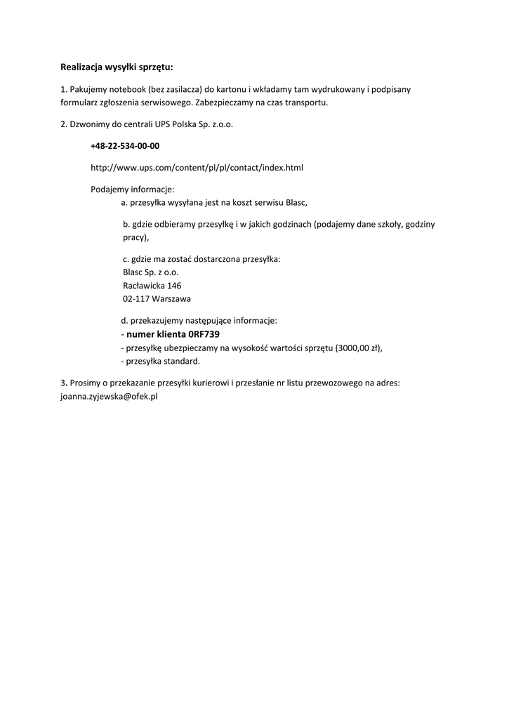 Realizacja wysyłki sprzętu: 1. Pakujemy notebook (bez zasilacza) do kartonu i wkładamy tam wydrukowany i podpisany formularz zgłoszenia serwisowego. Zabezpieczamy na czas transportu. 2. Dzwonimy do centrali UPS Polska Sp. z.o.o. +48-22-534-00-00 http://www.ups.com/content/pl/pl/contact/index.html Podajemy informacje: a. przesyłka wysyłana jest na koszt serwisu Blasc, b. gdzie odbieramy przesyłkę i w jakich godzinach (podajemy dane szkoły, godziny pracy), c. gdzie ma zostać dostarczona przesyłka: Blasc Sp. z o.o. Racławicka 146 02-117 Warszawa d. przekazujemy następujące informacje: - numer klienta 0RF739 - przesyłkę ubezpieczamy na wysokość wartości sprzętu (3000,00 zł), - przesyłka standard. 3. Prosimy o przekazanie przesyłki kurierowi i przesłanie nr listu przewozowego na adres: [email protected]