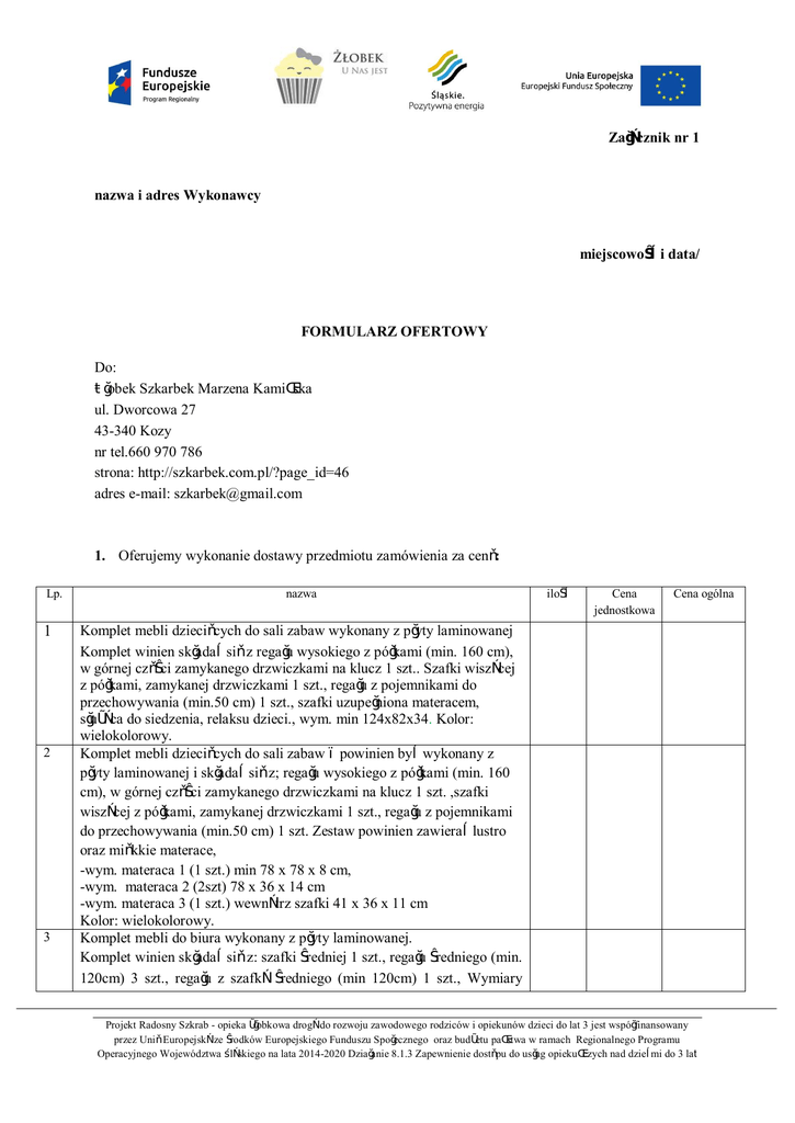 Załącznik nr 1 nazwa i adres Wykonawcy miejscowość i data/ FORMULARZ OFERTOWY Do: Żłobek Szkarbek Marzena Kamińska ul. Dworcowa 27 43-340 Kozy nr tel.660 970 786 strona: http://szkarbek.com.pl/?page_id=46 adres e-mail: [email protected] 1. Oferujemy wykonanie dostawy przedmiotu zamówienia za cenę: Lp. 1 2 3 nazwa ilość Cena jednostkowa Cena ogólna Komplet mebli dziecięcych do sali zabaw wykonany z płyty laminowanej Komplet winien składać się z regału wysokiego z półkami (min. 160 cm), w górnej części zamykanego drzwiczkami na klucz 1 szt.. Szafki wiszącej z półkami, zamykanej drzwiczkami 1 szt., regału z pojemnikami do przechowywania (min.50 cm) 1 szt., szafki uzupełniona materacem, służąca do siedzenia, relaksu dzieci., wym. min 124x82x34. Kolor: wielokolorowy. Komplet mebli dziecięcych do sali zabaw – powinien być wykonany z płyty laminowanej i składać się z; regału wysokiego z półkami (min. 160 cm), w górnej części zamykanego drzwiczkami na klucz 1 szt. ,szafki wiszącej z półkami, zamykanej drzwiczkami 1 szt., regału z pojemnikami do przechowywania (min.50 cm) 1 szt. Zestaw powinien zawierać lustro oraz miękkie materace, -wym. materaca 1 (1 szt.) min 78 x 78 x 8 cm, -wym. materaca 2 (2szt) 78 x 36 x 14 cm -wym. materaca 3 (1 szt.) wewnątrz szafki 41 x 36 x 11 cm Kolor: wielokolorowy. Komplet mebli do biura wykonany z płyty laminowanej. Komplet winien składać się z: szafki średniej 1 szt., regału średniego (min. 120cm) 3 szt., regału z szafką średniego (min 120cm) 1 szt., Wymiary Projekt Radosny Szkrab - opieka żłobkowa drogą do rozwoju zawodowego rodziców i opiekunów dzieci do lat 3 jest współfinansowany przez Unię Europejską ze środków Europejskiego Funduszu Społecznego oraz budżetu państwa w ramach Regionalnego Programu Operacyjnego Województwa Śląskiego na lata 2014-2020 Działanie 8.1.3 Zapewnienie dostępu do usług opiekuńczych nad dziećmi do 3 lat szafek min. 76 x 38 x 115 cm. 4 Komplet mebli dziecięcych do szatni: Komplet winien składać się z: · 6 szafek (modułowych) wyposażonych w wieszak i półkę. Skrzynia wykonana z płyty laminowanej. Z kolorowymi drzwiczkami. · 3 ławeczek do szatni wykonanych z płyty wiórowej lub naturalnych lakierowanych listew sosnowych. Wym. min. 100 x 30 x 26 cm 3 krzeseł wykonanych z wytrzymałej tkaniny. Siedzisko i oparcie tapicerowane. Wys. min. 47 cm. · 5 Krzesła dla dzieci z siedziskiem i oparciem wykonanym z lakierowanej sklejki bukowej. Stelaż wykonany z rury okrągłej, wyprofilowane siedzisko wys. max. 21 cm, szer. max. 27,5 cm. 6 Szafka przewijak jednostanowiskowa, wykonana z płyty wiórowej laminowanej, płyty MDF lub sklejki wraz materacem obszytym materiałem łatwym do utrzymania w czystości, z min.1 półką-miejscem do przechowywania. Wymiary min. 105-123cm.,szerokość max.170 cm., głębokość min.75 cm. Łóżeczko przystosowane dla dzieci żłobkowych i przedszkolnych ze stalową konstrukcją i tkaniną przepuszczającą powietrze. Narożniki z tworzywa sztucznego. Wym. min. 132 x 56 cm. 7 8 9 10 11 Szafa na pościel z przesuwanymi drzwiami. Półeczki przeznaczone do przechowywania 30 kompletów pościeli. Wym. min. 142,5 x 45 x 200,5 cm Krzesełko do karmienia dzieci. Wysokości krzesełka regulowana, nóżki wyposażone w antypoślizgowe stopki. Zabezpieczenie przed wypadnięciem - szelki oraz trzpień między nóżkami. Mechanizm składania/rozkładania, który pozwala na złożenie/rozłożenie krzesełka. Łóżeczko niemowlęce z materacem wykonane z drewna, z materacem wym. min. 60 x 120 cm Stół 6 osobowy, z zaokrąglonymi rogami. Wym. blatu min.: szer. 120-70 cm, Wysokość regulowana w zakresie 0-3 za pomocą dokrętek. .......................zł brutto .......................zł netto .......................zł VAT słownie: .............................................. 2. Dostawę stanowiącą przedmiot zamówienia wykonamy w terminie od daty podpisania Umowy do dnia 31.08.2016 r.: Projekt Radosny Szkrab - opieka żłobkowa drogą do rozwoju zawodowego rodziców i opiekunów dzieci do lat 3 jest współfinansowany przez Unię Europejską ze środków Europejskiego Funduszu Społecznego oraz budżetu państwa w ramach Regionalnego Programu Operacyjnego Województwa Śląskiego na lata 2014-2020 Działanie 8.1.3 Zapewnienie dostępu do usług opiekuńczych nad dziećmi do 3 lat 3. Oświadczamy, że dostarczymy sprzęt fabrycznie nowy. 4. Termin płatności podawany będzie na fakturze, przekazywanej Zamawiającemu przez Wykonawcę. 5. Oświadczamy, że zapoznaliśmy się ze treścią Zapytania ofertowego i przyjmujemy warunki w niej zawarte 6. Zobowiązujemy się, w przypadku przyznania nam zamówienia, do zawarcia umowy w miejscu i terminie wskazanym przez Zamawiającego. .............................................................. /upełnomocniony przedstawiciel Wykonawcy/ Projekt Radosny Szkrab - opieka żłobkowa drogą do rozwoju zawodowego rodziców i opiekunów dzieci do lat 3 jest współfinansowany przez Unię Europejską ze środków Europejskiego Funduszu Społecznego oraz budżetu państwa w ramach Regionalnego Programu Operacyjnego Województwa Śląskiego na lata 2014-2020 Działanie 8.1.3 Zapewnienie dostępu do usług opiekuńczych nad dziećmi do 3 lat