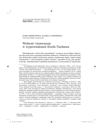 Acta Universitatis Wratislaviensis No 3327 Jêzyk a Kultura • tom 22 • Wrocław 2011 DARIA BORKOWSKA, KAMILLA TERMIŃSKA Uniwersytet Śląski w Katowicach Wolność i konwencja w wypowiedziach Józefa Tischnera Sformułowanie „różne sfery komunikacji” wyznacza, przywołując relatywistyczną teorię bytu, przepastne dziedziny badawcze. Podstawowa dla naszej kultury dychotomia między królestwem materii a królestwem ducha, zanim została rozmnożona w niewyczerpaną wielość światów1, sposobów bycia, gier językowych itp., zmieniana była w podziały trójczłonowe2, czwórczłonowe3, pięcioczło1 Na przykład Leszek Kołakowski, Horror metaphisicus, Warszawa 1990, s. 124: „Nie ma języka wszechobejmującego; ile możliwych punktów widzenia otwierających perspektywę na Byt i Nicość, tyle możliwych języków — czyli nieokreślenie wiele. I nie ma takiego punktu, z którego otwierałyby się równocześnie wszystkie perspektywy — chyba że pokrywa się on z okiem Boga. Niekiedy możemy przenosić się z jednego punktu widzenia do drugiego, nie tracąc z pamięci poprzedniego widoku, i w ten sposób postrzegać prawdę wielu metafizycznych perspektyw, które sprowadzone do wspólnego jakby języka kolidują ze sobą wzajem. Lecz częściej trzymamy się jednego punktu obserwacyjnego, do którego przywiodły nas zarówno nieodparte siły naszej cywilizacji, jak i nasze własne umysłowe preferencje, nasze pokusy i pragnienia”. 2 Karl Popper, Epistemologia bez podmiotu poznającego, „Literatura na Świecie” 1984, nr 12 (161); Martin Buber, Ja i Ty. Wybór pism filozoficznych, Warszawa 1992: „fizyczny” świat konsystencji, „psychiczny” świat drażliwości, „noetyczny” świat ważności; Jürgen Habermas, Teoria działania komunikacyjnego, t 1. Racjonalność działania a racjonalność społeczna, Warszawa 1999: świat otaczających podmiot przedmiotów (działanie teleologiczne), świat innych podmiotów (działanie regulowane przez normy) i wartości kulturowych, świat własnych przeżyć, potrzeb i zamiarów podmiotu (działanie dramaturgiczne). Paul Ricoeur, Podług nadziei, Warszawa 1991, s. 145 nn.: sfery stosunków międzyludzkich — posiadania, władzy i uznania: „Pierwszą determinuje stosunek pracy i przywłaszczenie, drugą stosunek nakazu i posłuszeństwa (lub, jeśli wolicie, stosunek rządzącego i rządzonego, który jest stosunkiem politycznym par excellence). Trzecia ma również obiektywne wsparcie w obyczajach, kodach, pomnikach i dziełach sztuki i kultury”. 3 Leon Chwistek, Pisma filozoficzne i logiczne, t. 1, Warszawa 1961, t. 2, Warszawa 1963: cztery rzeczywistości: 1. rzeczy (w ujęciu zdroworozsądkowym) — prymitywizm, 2. nauk fizycznych — naturalizm, 3. wrażeń — impresjonizm, 4. wyobraźni — futuryzm. Język a Kultura 22, 2011 © for this edition by CNS JaK_22_01_07.indd 23 2011-07-08 12:32:36 24 DARIA BORKOWSKA, KAMILLA TERMIŃSKA nowe4 i sześcioczłonowe5. Józef Tischner, omawiając (ostrożnie i z dystansem, lecz wstrzymując się od ubolewania nad tym stanem rzeczy) zjawisko „rozbitego świata”, pisze we właściwy sobie sposób: Z widzeniem świata przez naukę jest trochę jak z widzeniem lasu przez człowieka: z daleka widzi się same drzewa, dopiero gdy się wejdzie do środka, widzi się mchy, ptaki, zwierzęta. [...] Różne obrazy świata bywają w jakimś stopniu wynikiem stosowania różnych metod. Ten sam świat odbija się inaczej w różnych lustrach. [...] Tradycyjna metafizyka nie znała współczesnego bogactwa metod, nie znała wyników nauk szczegółowych, jej doświadczenie świata było trochę jak widzenie lasu z oddali [Mww 280]. Multiplikacji sprzyjają dwudziestowieczne zjawiska kulturowe najwyższej wagi: • • • • • • • • • • wielość koncepcji prawdy, racjonalności i metod naukowych, wielość koncepcji Boga i systemów etycznych, instrumentalizm w metodologii nauki, anarchizm metodologiczny (Feyerabend, Kuhn, Capra), Einsteinowska względność czasu i wielość przestrzeni, Goedlowska niemożność dowodu w matematyce, zasada nieoznaczoności i kreatywizm obserwatora w mechanice kwantowej, relatywizm kulturowy, sceptycyzm lingwistyczny, dyskurs na temat intranslatybilności, Wittgensteinowski pogląd o wielości niesprowadzalnych do siebie gier językowych. Nie chcąc zatem mnożyć światów (rzeczywistości, realności itd.) i warstw (przestrzeni, dziedzin, kręgów itd.) komunikacyjnych6 praeter necessitatem, a nie będąc w stanie dokonać i uzasadnić wyboru między niezwykle przekonującymi koncepcjami, doraźnie, ad hoc w celu opisania idiolektu, wykreślimy sfery i warunki komunikacyjne, opierając się na następujących kryteriach: • kwalifikacja gatunkowa porównywanych wypowiedzi, zachodzące między nimi relacje, ich założony odbiór oraz rodzaj transmisji (media), 4 John Searle, Umysł, język, społeczeństwo. Filozofia i rzeczywistość, Warszawa 1990: asertywy, dyrektywy, komisywy, ekspresywy, deklaratywy. 5 Alfred Schütz, O wielości światów. Szkice z socjologii fenomenologicznej, Kraków 2008: codzienność i (fikcyjne) sen, zabawa, nauka, sztuka, religia. 6 Rezygnujemy zatem również z typologii kręgów dialogicznych zaproponowanej w: Kamilla Termińska, Lingwistyczne zaświaty dialogów istotnych życiowo, [w:] Język wobec przemian kultury, red. Emil Tokarz, Katowice 1997. Język a Kultura 22, 2011 © for this edition by CNS JaK_22_01_07.indd 24 2011-07-08 12:32:36 Wolność i konwencja w wypowiedziach Józefa Tischnera 25 • formacje przedmiotowe; pojęciowe i leksykalne, • schematy kompozycyjne, logiczne i syntaktyczne. Są to zarazem narzędzia pozwalające zbadać manifestacje wybranego idiolektu. W świecie deprecjacji słowa7, gdy większość ludzi nie potrafi już ani mówić, ani słuchać, a rozmowa przybiera postać albo przesłuchania, albo rynkowej wymiany zaczerpniętych z mediów frazesów i zbitek