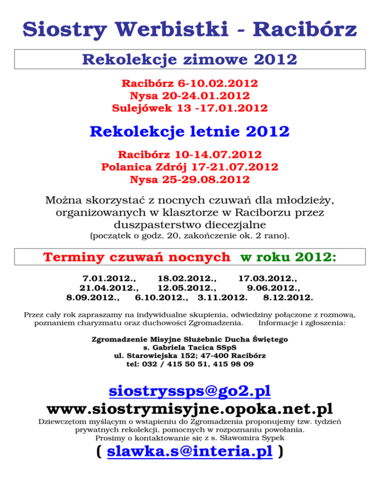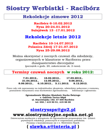 Siostry Werbistki - Racibórz Rekolekcje zimowe 2012 Racibórz 6-10.02.2012 Nysa 20-24.01.2012 Sulejówek 13 -17.01.2012 Rekolekcje letnie 2012 Racibórz 10-14.07.2012 Polanica Zdrój 17-21.07.2012 Nysa 25-29.08.2012 Można skorzystać z nocnych czuwań dla młodzieży, organizowanych w klasztorze w Raciborzu przez duszpasterstwo diecezjalne (początek o godz. 20, zakończenie ok. 2 rano). Terminy czuwań nocnych w roku 2012: 7.01.2012., 18.02.2012., 17.03.2012., 21.04.2012., 12.05.2012., 9.06.2012., 8.09.2012., 6.10.2012., 3.11.2012. 8.12.2012. Przez cały rok zapraszamy na indywidualne skupienia, odwiedziny połączone z rozmową, poznaniem charyzmatu oraz duchowości Zgromadzenia. Informacje i zgłoszenia: Zgromadzenie Misyjne Służebnic Ducha Świętego s. Gabriela Tacica SSpS ul. Starowiejska 152; 47-400 Racibórz tel: 032 / 415 50 51, 415 98 09 [email protected] www.siostrymisyjne.opoka.net.pl Dziewczętom myślącym o wstąpieniu do Zgromadzenia proponujemy tzw. tydzień prywatnych rekolekcji, pomocnych w rozpoznaniu powołania. Prosimy o kontaktowanie się z s. Sławomira Sypek ( [email protected] )