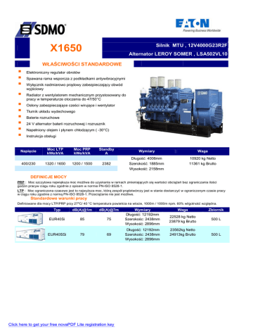 Silnik MTU , 12V4000G23R2F X1650 Alternator LEROY SOMER , LSA502VL10 WŁAŚCIWOŚCI STANDARDOWE Elektroniczny regulator obrotów Spawana rama wsporcza z podkładkami antywibracyjnymi Wyłącznik nadmiarowo prądowy zabezpieczający obwód wyjściowy Radiator z wentylatorem mechanicznym przystosowany do pracy w temperaturze otoczenia do 47/50°C Osłony zabezpieczające cześci wirujące i wentylator Tłumik układu wydechowego Baterie rozruchowe 24 V alternator baterii rozruchowej i rozrusznik Napełniony olejem i płynem chłodzącym ( -30°C) Instrukcja obsługi Napięcie Moc LTP kWe/kVA Moc PRP kWe/kVA Standby A Wymiary Waga 400/230 1320 / 1650 1200 / 1500 2382 Długość: 4006mm Szerokość: 1885mm Wysokość: 2158mm 10920 kg Netto 11361 kg Brutto DEFINICJE MOCY PRP : Moc szczytowa największa moc możliwa do uzyskania w ramach zmieniających się wartości obciążeń bez ograniczania ilości godzin pracyw ciagu roku zgodnie z opisem w normie PN-ISO 8528-1. LTP : Moc ograniczona czasowo jest to najwyższa moc, którą zespół prądotwórczy jest w stanie dostarczyć w ograniczonym czasie pracy w ciągu roku zgodnie z normą PN-ISO 8528-1. Przeciążanie nie jest możliwe. Standardowe warunki pracy Definiowane dla mocy LTP/PRP przy 27°C/ 40 °C temperatura powietrza na wlocie, 1000m / 1000m npm. 60% wilgotność względna. Typ dB(A)@1m dB(A)@7m EUR40Si 85 75 EUR40SSi 79 69 Click here to get your free novaPDF Lite registration key Wymiary Długość: 12192mm Szerokośc: 2438mm Wysokość: 2896mm Długość: 12192mm Szerokośc: 2438mm Wysokość: 2896mm Waga Zbiornik 22528 kg Netto 23879 kg Brutto 500 L 23562kg Netto 24913kg Brutto 500 L DANE SILNIKA Producent / Model Układ cylindrów V Pojemność (C.l) 57.2 Skok (mm) / Średnica (mm) 16.5 Obroty znamionowe (RPM) 1500 Prędkość tłoka (m/s) 10.5 Moc max. w trybie stand przy prędkości znamionowej (kW) 1325 Stabilność częstotliwości w stanie ustalonym (%) UKŁAD WYDECHOWY UKŁAD PALIWA UKŁAD SMAROWANIA BILANS CIEPLNY AIR INTAKE UKŁAD CHŁODZENIA 170 X 210 Stopień sprężania DANE STANDARDOWE MTU 12V4000G23R2F , 4-takt, Turbo, AIR/Water 12 X 0.5 BMEP (bar) 18.74 Type regulatora obrotów ELEC Temperatura spalin (°F) 430 Przepływ spalin na wydechu (L/s) 3700 Max przeciwciśnienie na wydechu (mm CE) 300 110% (Stand By power) (L/h) 329 100% (mocy PRP) (L/h) 299 75% (mocy PRP) (L/h) 231 50% (mocy PRP) (L/h) 162 Całkowity wydatek pompy paliwa (L/h) 1500 Pojemność całkowita (L) 260 Ciśnienie oleju przy wolnych obrotach (bar) 3.5 Ciśnienie oleju przy obrotach znamionowych (bar) 7 Zużycie oleju 100% obciązenia (L/h) 1 Pojemność miski olejowej (L) 200 Ciepło tracone w spalinach (kW) N/A Ciepło promieniowane do otoczenia (kW) 75 Ciepło tracone do ukłądu chłodzenia (kW) 500/190 Max. dopuszczalne straty (mm CE) 150 Zużycie powietrza (L/s) 1500 Pojemność całkowita chłodnicy i silnika (L) Max temperatura chlodziwa (°C) N/A Temperatura cłodziwa na wyjściu (°C) 100 Moc wentylatora (kW) N/A Przepływ swobodny powietrza (m3/s) N/A Dopuszczalne straty w przepływie powietrza (mm CE) 104 N/A Typ chłodziwa COOLELF-MDX Termostat (°C) 79/92 PM (g/kW.h) N/A EMISJA CO (g/kW.h) N/A SPALIN Nox (g/kW.h) N/A HC (g/kW.h) N/A Click here to get your free novaPDF Lite registration key SPECIFIKACJA ALTERNATORA DANE OGÓLNE DANE Producent Typ Ilość faz Współczynnik mocy (Cos Phi) Wysokość npm. (m) Prędkośc maxymalna (rpm) Ilośc biegunów Rodzaj wzbudzenia izolacja : Klasa, odporność temperaturowa Typ regulatora napięcia Całkowita zawarotść harmonicznych (TGH/THC) Kształt napięcia : NEMA = TIF – TGH/THC Kształt napięcia: CEI = FHT – TGH/THC Ilość łożysk Sprzęgło Regulacja napięcia 0 do 100% obciążenia Czas odbudowy napięcia (20% Volt dip) ms Moc PRP @ 40°C (kVA) 1640 Moc LTP @ 27°C (kVA) 1800 Sprawność @ 4/4 obciązenia (%) 95.6 Przepływ powietrza (m3/s) 1.8 Współczynnk zwarcia;50 (Kcc) 0.33 Reaktancja sychroniczna podłużna (Xd) (%) 362 Reaktancja synchroniczna poprzeczna (Xq) (%) 217 Stała czas. przejściowa podł. przy otw obud. twornika;50 (T’do) (ms) 4058 Reaktancja przejściowa podłuzna (X’d) (%) 16 Stała czasowa przejsciowa podłużna (T’d) (ms) 180 Reaktancja podprzejściowa podłuzna (X’’d) (%) 13.6 Stała czasowa podprzejściowa podłużna (T’’d) (ms) PROJEKTOWE LEROY SOMER LSA502VL10 3 0.8 <1000 2250 4 AREP H/H R448V50 <3.5 <50 <2 1 DIRECT 0.5 500 Reaktancja podprzejściowa poprzeczna (X’’q) (%) 18 14.2 Reaktancja dla składowej zerowej (Xo) (%) 3.1 Reaktancja dla składowej przeciwnej (X2) (%) 13.9 Stała czasowa aperiodyczna (Ta) ms) 27 Prąd wzbudzenia bez obciążenia (io) (A) 0.9 Prąd wzbudzenia przy pełnym obciążeniu (ic) (A) 3.7 Napięcie wzbudzenia przy pełnym obciązeniu (uc) (V) 41 Czas powrotu do stanu ust. (Delta U = 20% transitoire) (ms) 500 Moc rozruchowa silnika (Delta = 20% perm. Or 50% trans.) (kVA) 4248 Transient dip (4/4 charge) – PF : 0.8 AR (%) 11.7 Straty jałowe (kW) 16.52 Emisja ciepła (kW) 59.02 Click here to get your free novaPDF Lite registration key PANEL KONTROLNY Standard M80 M80 Specyfikacja: Tachometer, Przycisk wyłącznika Stop, Złącze wyjściowe, certyfikat CE Parametry silnika:Licznik godzin, Wskaźnik ciśnienia oleju, Wskaźnik temperatury chłodziwa, opcjonalnie wskaźnik temperatury oleju Opcja TELYS TELYS Właściwości standardowe: AC woltomierz, AC amperomierz, częstościomierz. Zabezpieczenia stopujące pracę silnika : Ciśnienie oleju, Za wysoka temp. cieczy chłodzącej, Niski poziom chłodziwa, Nadmierna prędkość obrotowa, Zbyt wysokie obroty, Wyłącznik awaryjny. Odczyt parametrów silnika: Ciśnienie oleju, Temperatura chłodziwa, Poziom paliwa, Miernik godz. pracy, Napięcie baterii. RS485 port komunikacji do zdalnego monitorowania USB port komunikacji Opcja KERYS KERYS Właściwości standardowe: AC woltomierz, AC amperomierz, częstościomierz. Alarmy i ostrzeżenia: Ciśnienie oleju, Temperat