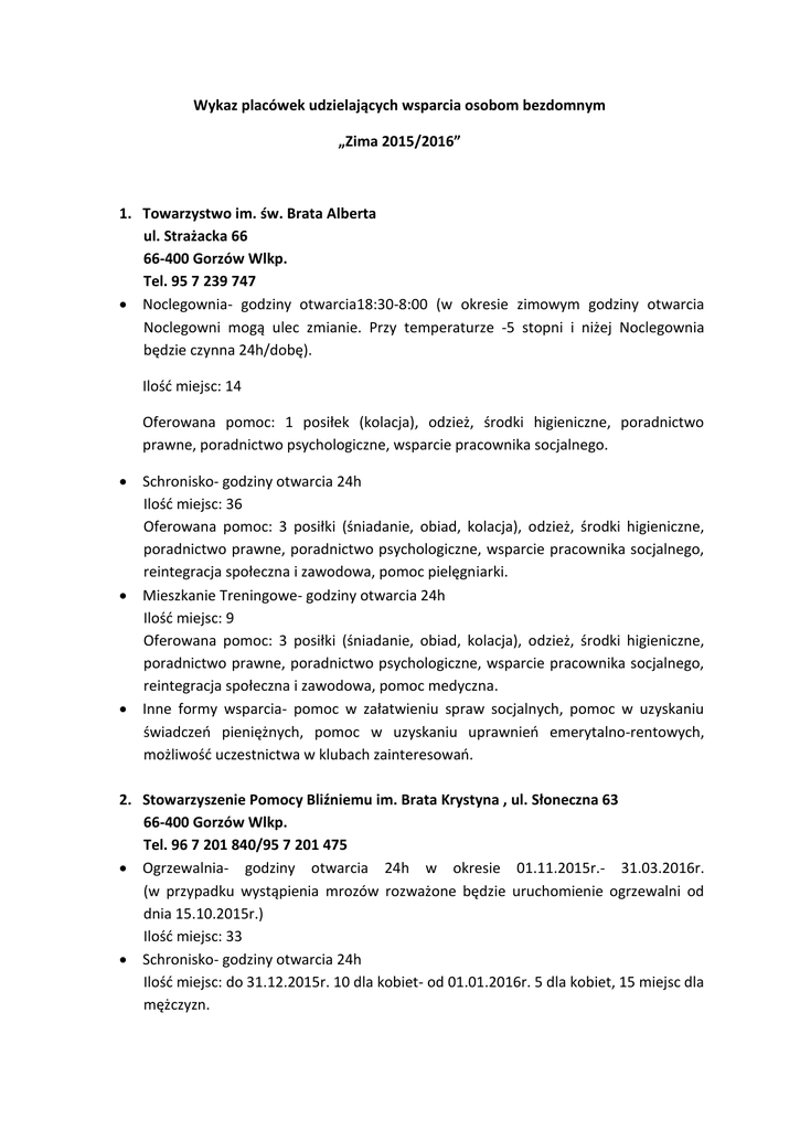 Wykaz placówek udzielających wsparcia osobom bezdomnym „Zima 2015/2016” 1. Towarzystwo im. św. Brata Alberta ul. Strażacka 66 66-400 Gorzów Wlkp. Tel. 95 7 239 747 Noclegownia- godziny otwarcia18:30-8:00 (w okresie zimowym godziny otwarcia Noclegowni mogą ulec zmianie. Przy temperaturze -5 stopni i niżej Noclegownia będzie czynna 24h/dobę). Ilość miejsc: 14 Oferowana pomoc: 1 posiłek (kolacja), odzież, środki higieniczne, poradnictwo prawne, poradnictwo psychologiczne, wsparcie pracownika socjalnego. Schronisko- godziny otwarcia 24h Ilość miejsc: 36 Oferowana pomoc: 3 posiłki (śniadanie, obiad, kolacja), odzież, środki higieniczne, poradnictwo prawne, poradnictwo psychologiczne, wsparcie pracownika socjalnego, reintegracja społeczna i zawodowa, pomoc pielęgniarki. Mieszkanie Treningowe- godziny otwarcia 24h Ilość miejsc: 9 Oferowana pomoc: 3 posiłki (śniadanie, obiad, kolacja), odzież, środki higieniczne, poradnictwo prawne, poradnictwo psychologiczne, wsparcie pracownika socjalnego, reintegracja społeczna i zawodowa, pomoc medyczna. Inne formy wsparcia- pomoc w załatwieniu spraw socjalnych, pomoc w uzyskaniu świadczeń pieniężnych, pomoc w uzyskaniu uprawnień emerytalno-rentowych, możliwość uczestnictwa w klubach zainteresowań. 2. Stowarzyszenie Pomocy Bliźniemu im. Brata Krystyna , ul. Słoneczna 63 66-400 Gorzów Wlkp. Tel. 96 7 201 840/95 7 201 475 Ogrzewalnia- godziny otwarcia 24h w okresie 01.11.2015r.- 31.03.2016r. (w przypadku wystąpienia mrozów rozważone będzie uruchomienie ogrzewalni od dnia 15.10.2015r.) Ilość miejsc: 33 Schronisko- godziny otwarcia 24h Ilość miejsc: do 31.12.2015r. 10 dla kobiet- od 01.01.2016r. 5 dla kobiet, 15 miejsc dla mężczyzn. Oferowana pomoc: poradnictwo prawne, poradnictwo psychologiczne, posiłek, odzież, środki czystości, podstawowa opieka medyczna, psychoterapia, terapia uzależnień, doradztwo zawodowe, pedagog. Bank Żywności- tel. 95 7 180 285- godziny otwarcia: poniedziałek, środa, piątek10:00- 14:00. Pomoc w formie odzieży poniedziałek- piątek w godz. 11:00- 17:00 ( tel. 95 7 206 630) Oferowana pomoc: żywność. 3. Ośrodek Interwencji Kryzysowej ul. Okrzei 39 66-400 Gorzów Wlkp. Tel. 95 7 214 215 Godziny otwarcia: 24h Oferowana pomoc: nocleg w sytuacji kryzysowej dla mieszkańców Gorzowa Wlkp., poradnictwo. Ilość miejsc: 15 4. Klub Abstynenta „24 godziny” (placówka dla osób bezdomnych z uzależnieniem od alkoholu) ul. Łużycka 32/4 66-400 Gorzów Wlkp. Tel. 95 7 351 342 Godziny otwarcia: 24h Ilość miejsc: 10 Oferowana pomoc: mitingi, poradnictwo, warsztaty, praca socjalna. 5. Polski Czerwony Krzyż ul. Chrobrego 28 66-400 Gorzów Wlkp. Tel. 95 7352 492 Godziny otwarcia: poniedziałki, środy i piątki 9:30- 11:30 Oferowana pomoc: odzież, obuwie, pościel. 6. Stowarzyszenie Miłosierdzia Św. Wincentego A. Paulo ul. Warszawska 45 66-400 Gorzów Wlkp. Tel. 95 7 322 692 Godziny otwarcia: poniedziałek- sobota 13:00- 14:00 Oferowana pomoc: gorący posiłek. 7. Gorzowskie Centrum Pomocy Rodzinie / Sekcja ds. bezdomności ul. Drzymały 10 ( pokój 11) 66-400 Gorzów Wlkp. Tel. 95 7 151 341 Godziny Urzędowania: poniedziałek- 10:00- 11:00; wtorek- środa- 7:30- 15:30; piątek- 7:30- 10:00 Oferowana pomoc: udzielanie świadczeń- zasiłki ( w tym posiłki), praca socjalna, poradnictwo, wydawanie skierowań do skorzystania z urządzeń sanitarnych. 8. Ośrodek Profilaktyki i Wczesnej Terapii MONAR ul. Ogińskiego 43 66-400 Gorzów Wlkp. Tel. 95 7 367 171 Godziny urzędowania: poniedziałki, wtorki, środy- 10:00- 18:00, czwartki- 10:0020:00, piątki- 10:00- 16:00 Oferowana pomoc: możliwość skierowania do placówki MONAR.