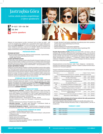 Jastrzębia Góra Letnia szkoła języka angielskiego z native speakerami 8–12 i 13–16 lat 12 dni native speakers Wakacje nie muszą kojarzyć się tylko z lenistwem! Jeśli nie lubisz się nudzić – jedź z nami do Jastrzębiej Góry. Podobnie jak w poprzednich latach zajęcia będą prowadzone przez native speakerów. To niesamowita okazja, aby w praktyce przetestować swoje umiejętności językowe, a nie ma na to lepszego sposobu niż spotkanie oko w oko z obcokrajowcem. Nauka jednak to nie wszystko – czeka na Was wiele atrakcji. Każdy uczestnik obozu otrzyma na pamiątkę koszulkę obozową. • 20 godz. lekcyjnych nauki języka angielskiego prowadzonej przez native speakerów w formie zajęć w salach (każda lekcja trwa 45 minut) • 30 godz. zajęć w terenie • Materiały dydaktyczne do nauki języka angielskiego • Dyplomy potwierdzające udział w Letniej Szkole Języka Angielskiego ATAS PROGRAM OBOZU Ośrodek Wypoczynkowy Feniks położony jest niecałe 400 m od morza, z dala od ruchliwych ulic, na terenie z dużą ilością zieleni obejmującym prawie 1,5 ha. Na terenie ośrodka znajdują się: boisko do badmintona, boisko do siatkówki, wydzielone miejsce na ogniska oraz plac zabaw dla dzieci. Za ogrodzeniem zlokalizowane jest boisko do piłki nożnej. Zakwaterowanie w pokojach 3 – 5 osobowych z pełnym węzłem sanitarnym i balkonami. Dodatkowo sala TV, sala komputerowa z dostępem do internetu, sale sportowe do gry w ping-ponga i piłkarzyki. PROGRAM JĘZYKOWY Obóz JPJ to program językowy, który składa się z dwóch elementów – łącznie 50 lekcji: • 20 lekcji teoretycznych, każda lekcja trwa 45 minut • 30 godz. zajęć w terenie ZAJĘCIA JĘZYKOWE KLASOWE W czasie obozu native speakerzy poprowadzą 20 godzin lekcyjnych (każda po 45 minut). Lekcje prowadzone będą z naciskiem na konwersacje, nie zabraknie także doskonalenia gramatyki, słownictwa i pisowni. Podział na grupy nastąpi na podstawie testu kwalifikacyjnego. Zajęcia językowe odbywają się w dwóch blokach – rano i po południu (2 x 1,5 h). ZAJĘCIA JĘZYKOWE W TERENIE Praktyczne ćwiczenia (łącznie 30 godzin na obozie) prowadzone są przez native speakerów. Proponujemy quizy i zabawy, ale też ważnym elementem jest angażowanie młodych ludzi w przygotowanie i realizowanie gimnastyki, gier miejskich i innych aktywności przy wykorzystaniu ich indywidualnych zdolności. Możliwość zaprezentowania swoich umiejętności czy wiedzy i do tego po angielsku, jest dla nastolatków wielkim, pozytywnym przeżyciem. Dzięki warsztatom językowym w terenie młodzież zyska większą płynność mówienia i rozumienia angielskiego w zakresie różnej tematyki. ZAKWATEROWANIE TRANSPORT Przejazd autokarem na trasie: Warszawa – Łódź – Toruń – Bydgoszcz – Jastrzębia Góra. Pozostałe trasy realizowane będą przy minimum 5 osobach w jednym terminie (do potwierdzenia na 7 dni przed wyjazdem). Transport realizujemy pod opieką wychowawcy lub konwojenta. Na zbiórkę zapraszamy na 30 minut przed planowaną godziną odjazdu. Miejscowość Miejsce zbiórki Wyjazd Powrót Dopłata Trasa południowa (realizowana przy min. 5 osobach) – dowózka busem do Łodzi Kraków Parking przy stadionie „Wisły”, ul. Reymonta 22 04.00 21.45 220 PLN STAWIAMY NA AKTYWNY WYPOCZYNEK Katowice Dw. PKS, ul. Piotra Skargi 05.00 20.45 220 PLN W części pozalekcyjnej uczestnicy będą mogli korzystać z uroków pobytu nad Morzem Bałtyckim. Planujemy plażowanie, kąpiele w morzu, rozgrywki siatkówki i inne zajęcia sportowe. Dla chętnych nasi instruktorzy przeprowadzą zajęcia dziennikarstwa, przyrodnicze, survivalowe oraz podstaw fotografii. Będzie również BUBBLE FOOTBALL (odmiana piłki nożnej, w której zawodnicy grają w specjalnych kulach wypełnionych powietrzem) i LASEROWY PAINTBALL. Częstochowa Parking przy McDonald’s, ul. Drogowców 1 06.00 19.45 200 PLN 19.45 180 PLN IMPREZY FAKULTATYWNE • Warsztaty tenisa ziemnego – 9 godzin zajęć z instruktorem Szkoły Tenisa KAMSPORT (każda po 60 minut) obejmujących: doskonalenie gry w tenisa ziemnego na korcie (korty oddalone są od ośrodka o ok. 100 m), zajęcia ogólnorozwojowe oraz zajęcia teoretyczne. Uczestnicy powinni posiadać własne rakiety (istnieje możliwość wypożyczenia rakiety na miejscu – 20 PLN/turnus). Do nabycia: daszek tenisisty – 30 PLN; daszek + koszulka – 60 PLN). Zajęcia są realizowane w ciągu 3 do 7 dni pobytu, w zależności od warunków pogodowych. Warsztaty realizowane przy minimum 10 osobach. Cena: 300 PLN. • Warsztaty taneczne – 10 godzin zajęć tanecznych z instruktorem (każda po 45 minut), doskonalenie technik tańca. Cena: 100 PLN. • Wycieczka do Aquaparku w Sopocie – 2 godzinny pobyt w Aquaparku oraz spacer po najciekawszej części miasta – (przy zgłoszeniu się minimum 20 osób). Cena: 65 PLN. ŚWIADCZENIA ZAWARTE W CENIE • 11 noclegów w Ośrodku Wypoczynkowym Feniks • Wyżywienie 3 × dziennie (śniadanie, obiad + podwieczorek, kolacja) + suchy prowiant na drogę powrotną • Bubble football i laserowy paintball • Ognisko z pieczeniem kiełbasek • Profesjonalnie zaaranżowane dyskoteki • Opieka ratownika, kadry oraz opieka medyczna – pielęgniarka i lekarz • Ubezpieczenie NNW AXA (5000 PLN) OBOZY JĘZYKOWE 6 Trasa centralna – przejazd autokarowy Warszawa Dw. Zachodni PKS, st. 10 06.00 Łódź Dw. Autobusowy Północny, ul. Smugowa 30/32 08.00 17.45 180 PLN Toruń ul. Grudziądzka 132, parking przy Urzędzie Miasta 11.00 14.45 150 PLN Bydgoszcz Parking pod Halą Łuczniczka, ul. Toruńska 59 12.00 13.45 120 PLN Trasa zachodnia (realizowana przy min. 5 osobach) – dowózka busem do Bydgoszczy Wrocław Parking przy ul. Ślężnej (róg ul. Kamiennej przy Wzgórzu Andersa) 06.00 19.45 220 PLN Poznań Zintegrowane Centrum Komunikacyjne, ul. S. Matyi 2 09.30 16.15 220 PLN Gniezno Stacja Lotos, ul. Żwirki i Wigury 32 10.30 15.15 200 PLN Obowiązkowy odbiór m