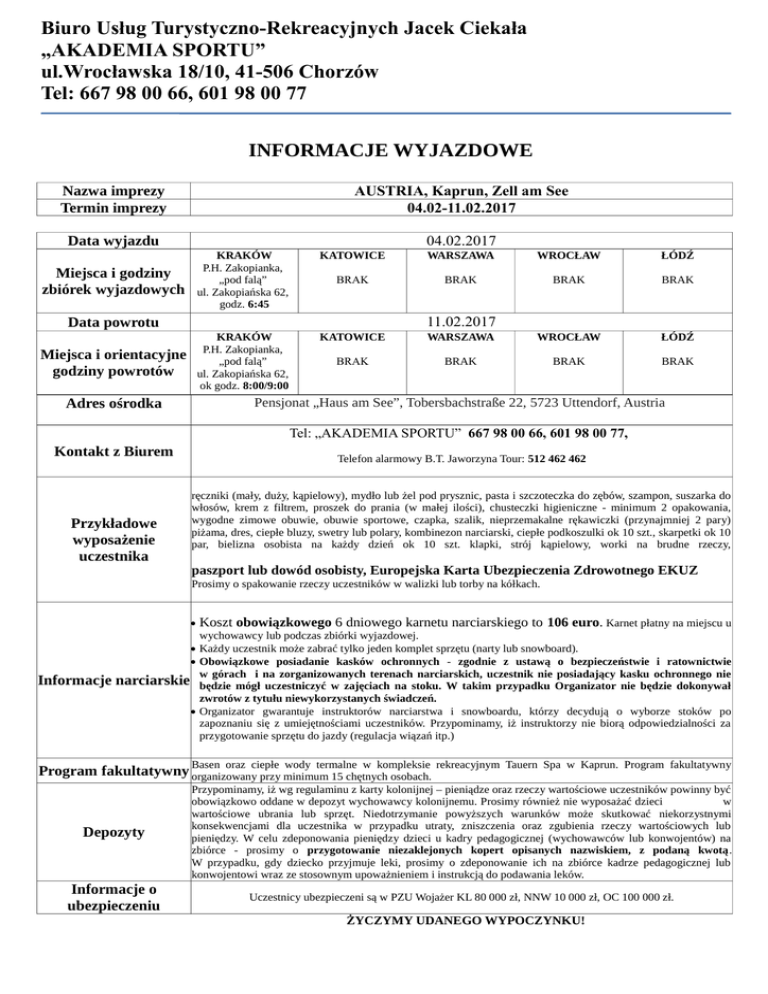 Biuro Usług Turystyczno-Rekreacyjnych Jacek Ciekała „AKADEMIA SPORTU” ul.Wrocławska 18/10, 41-506 Chorzów Tel: 667 98 00 66, 601 98 00 77 INFORMACJE WYJAZDOWE Nazwa imprezy Termin imprezy AUSTRIA, Kaprun, Zell am See 04.02-11.02.2017 Data wyjazdu 04.02.2017 Miejsca i godziny zbiórek wyjazdowych KRAKÓW P.H. Zakopianka, „pod falą” ul. Zakopiańska 62, godz. 6:45 KATOWICE WARSZAWA WROCŁAW ŁÓDŹ BRAK BRAK BRAK BRAK KRAKÓW P.H. Zakopianka, „pod falą” ul. Zakopiańska 62, ok godz. 8:00/9:00 KATOWICE WARSZAWA WROCŁAW ŁÓDŹ BRAK BRAK BRAK BRAK 11.02.2017 Data powrotu Miejsca i orientacyjne godziny powrotów Pensjonat „Haus am See”, Tobersbachstraße 22, 5723 Uttendorf, Austria Adres ośrodka Tel: „AKADEMIA SPORTU” 667 98 00 66, 601 98 00 77, Kontakt z Biurem Przykładowe wyposażenie uczestnika Telefon alarmowy B.T. Jaworzyna Tour: 512 462 462 ręczniki (mały, duży, kąpielowy), mydło lub żel pod prysznic, pasta i szczoteczka do zębów, szampon, suszarka do włosów, krem z filtrem, proszek do prania (w małej ilości), chusteczki higieniczne - minimum 2 opakowania, wygodne zimowe obuwie, obuwie sportowe, czapka, szalik, nieprzemakalne rękawiczki (przynajmniej 2 pary) piżama, dres, ciepłe bluzy, swetry lub polary, kombinezon narciarski, ciepłe podkoszulki ok 10 szt., skarpetki ok 10 par, bielizna osobista na każdy dzień ok 10 szt. klapki, strój kąpielowy, worki na brudne rzeczy, paszport lub dowód osobisty, Europejska Karta Ubezpieczenia Zdrowotnego EKUZ Prosimy o spakowanie rzeczy uczestników w walizki lub torby na kółkach. Informacje Koszt obowiązkowego 6 dniowego karnetu narciarskiego to 106 euro. Karnet płatny na miejscu u wychowawcy lub podczas zbiórki wyjazdowej. Każdy uczestnik może zabrać tylko jeden komplet sprzętu (narty lub snowboard). Obowiązkowe posiadanie kasków ochronnych - zgodnie z ustawą o bezpieczeństwie i ratownictwie w górach i na zorganizowanych terenach narciarskich, uczestnik nie posiadający kasku ochronnego nie narciarskie będzie mógł uczestniczyć w zajęciach na stoku. W takim przypadku Organizator nie będzie dokonywał zwrotów z tytułu niewykorzystanych świadczeń. Organizator gwarantuje instruktorów narciarstwa i snowboardu, którzy decydują o wyborze stoków po zapoznaniu się z umiejętnościami uczestników. Przypominamy, iż instruktorzy nie biorą odpowiedzialności za przygotowanie sprzętu do jazdy (regulacja wiązań itp.) Basen oraz ciepłe wody termalne w kompleksie rekreacyjnym Tauern Spa w Kaprun. Program fakultatywny Program fakultatywny organizowany przy minimum 15 chętnych osobach. Depozyty Przypominamy, iż wg regulaminu z karty kolonijnej – pieniądze oraz rzeczy wartościowe uczestników powinny być obowiązkowo oddane w depozyt wychowawcy kolonijnemu. Prosimy również nie wyposażać dzieci w wartościowe ubrania lub sprzęt. Niedotrzymanie powyższych warunków może skutkować niekorzystnymi konsekwencjami dla uczestnika w przypadku utraty, zniszczenia oraz zgubienia rzeczy wartościowych lub pieniędzy. W celu zdeponowania pieniędzy dzieci u kadry pedagogicznej (wychowawców lub konwojentów) na zbiórce - prosimy o przygotowanie niezaklejonych kopert opisanych nazwiskiem, z podaną kwotą. W przypadku, gdy dziecko przyjmuje leki, prosimy o zdeponowanie ich na zbiórce kadrze pedagogicznej lub konwojentowi wraz ze stosownym upoważnieniem i instrukcją do podawania leków. Informacje o ubezpieczeniu Uczestnicy ubezpieczeni są w PZU Wojażer KL 80 000 zł, NNW 10 000 zł, OC 100 000 zł. ŻYCZYMY UDANEGO WYPOCZYNKU!