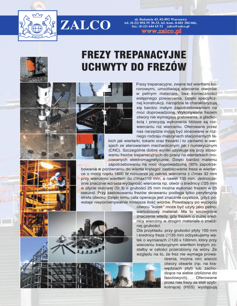 ZALCO ul. Ba˝ancia 43, 02-892 Warszawa tel. (0-22) 894 55 30-33, tel. kom. 0-601 384 666, fax: (0-22) 644 65 52 [email protected] FREZY TREPANACYJNE UCHWYTY DO FREZÓW Frezy trepanacyjne, zwane te˝ wiert∏ami koronowymi, umo˝liwiajà wiercenie otworów w pe∏nym materiale, bez koniecznoÊci wst´pnego powiercenia. Dzi´ki specyficznej konstrukcji, narz´dzia te charakteryzujà si´ bardzo ma∏ym zapotrzebowaniem na moc doprowadzonà. Wykonywane frezem otwory nie wymagajà gratowania, a g∏adkoÊcià i precyzjà wykonania bli˝sze sà rozwiercaniu ni˝ wierceniu. Oferowane przez nas narz´dzia mogà byç stosowane w ró˝nego rodzaju maszynach stacjonarnych takich jak wiertarki, tokarki oraz frezarki i to zarówno w wersjach ze sterowaniem mechanicznym jak i numerycznym (CNC). Szczególnie dobre wyniki uzyskuje si´ przy stosowaniu frezów trepanacyjnych do pracy na wiertarkach mocowanych elektromagnetycznie. Dzi´ki bardzo ma∏emu zapotrzebowaniu na moc doprowadzonà (30% zapotrzebowania w porównaniu do wiert∏a kr´tego) zastosowanie freza w wiertarce o mocy rz´du 1600 W rozszerza jej zakres wiercenia z ∅max 32 mm przy wierceniu wiert∏em do ∅max110 mm, a nawet 135 mm. JednoczeÊnie znacznie wzrasta wydajnoÊç wiercenia np. otwór o Êrednicy ∅25 mm w p∏ycie stalowej (St 3) o gruboÊci 25 mm mo˝na wykonaç frezem w 25 sekund. Przy zastosowaniu frezów skrawaniu podlega tylko peryferyjna strefa otworu. Dzi´ki temu ca∏a operacja jest znacznie czystsza, gdy˝ powstaje nieporównywalnie mniejsza iloÊç wiórów. Powstajàcy po wyci´ciu otworu “korek” mo˝e byç u˝yty jako pe∏nowartoÊciowy materia∏. Ma to szczególne znaczenie wtedy, gdy frezem o du˝ej Êrednicy wiercimy w drogim materiale o znacznej gruboÊci. Dla przyk∏adu: przy gruboÊci p∏yty 100 mm i Êrednicy freza ∅135 mm odzyskujemy wa∏ek o wymiarach ∅120 x 100mm, który przy wierceniu tradycyjnym wiert∏em kr´tym zosta∏by w ca∏oÊci przerobiony na wióry. Ze wzgl´du na to, ˝e frez nie wymaga prowadzenia, mo˝na nim wierciç otwory otwarte (np. na kraw´dziach p∏yt) lub zachodzàce na siebie (zbli˝one do fasolowych). Oferowane przez nas frezy ze stali szybkotnàcej (HSS) wyst´pujà w pi´ciu d∏ugoÊciach roboczych tj. 1”,2”,3”,4” i 6”, przy czym w ciàg∏ej sprzeda˝y posiadamy frezy o d∏ugoÊci roboczej 1” i 2” w zakresie ∅14-50 mm z gradacjà Êrednic co 1 mm. Przy Êrednicach powy˝ej ∅50mm, oferujemy frezy TCT z z´bami z w´glika spiekanego (TiC). Utrzymujemy magazyn frezów TCT o d∏ugoÊci roboczej 2” w zakresie Êrednic od ∅60mm do ∅100mm z gradacjà 5mm. Jako d∏ugoÊç roboczà rozumieç nale˝y maksymalnà mo˝liwà do przewiercenia gruboÊç materia∏u. Posiadamy w naszej ofercie równie˝ frezy umo˝liwiajàce wiercenie otworów w pakietach blach. Jest to mo˝liwe dzi´ki specjalnej geometrii narz´dzia. Od ∅14 mm... ... do ∅110 mm, a nawet wi´cej... ... i do tego z ciàg∏ym ch∏odzeniem UCHWYTY DO FREZÓW Aby umo˝liwiç zamocowanie freza w maszynie stosowane sà profesjonalne uchwyty przemys∏owe z wewn´trznym systemem ch∏odzenia. Wk∏adany w cz´Êç chwytowà freza wypychacz, zwany czasami pilotem, wsuwa si´ podczas wiercenia w uchwyt i otwiera zawór p∏ytkowy, przez który ch∏odziwo wlewa si´ do wn´trza narz´dzia. W zale˝noÊci od typu uchwytu p∏yn ch∏odzàcy podawany jest z ma∏ej wewn´trznej komory (uchwyty standardowe - “S”) lub z zewn´trznego zbiornika o pojemnoÊci ok. 0,4l (uchwyty z funkcjà ciàg∏ego podawania ch∏odziwa - “C” i “U”). W uchwytach standardowych komora wewn´trzna musi byç zalewana ka˝dorazowo przed wierceniem. Uchwyty z funkcjà ciàg∏ego podawania ch∏odziwa po∏àczone z zewn´trznym zbiornikiem umo˝liwiajà prac´ ciàg∏à przy jednoczesnej, ∏atwej kontroli poziomu p∏ynu. Uchwyty oznaczane sà symbolem AMT i nast´pujàcym po nim opisem, o zmiennej treÊci, precyzyjnie okreÊlajàcym typ. Wszystkie uchwyty AMT sà mocowane na sto˝ku Morse’a. Wyjàtkiem sà uchwyty do ma∏ych modeli wiertarek mocowanych elektromagnetycznie (PRO 30/1, PRO 35/2 i PRO H35). W modelach tych uchwyty sà nakr´cane na gwint 1/2” x 20 i posiadajà oznaczenie AMTG-S19. Przyk∏ad: Uchwyt AMT3-C19. Cyfra “3” oznacza numer sto˝ka Morse’a. Oferujemy te˝ uchwyty ze sto˝kiem nr 2. Litera “C” oznacza uchwyt z funkcja podawania ch∏odziwa. W ofercie posiadamy jeszcze uchwyty standardowe oznaczane literà “S”, oraz uniwersalne oznaczane literà “U”, a przeznaczone do naszych wiertarek mocowanych elektromagnetycznie ze zintegrowanym systemem podawania ch∏odziwa (modele maszyn PRO 75 i PRO 110). Liczba “19” lub “32” informuje o Êrednicy cz´Êci chwytowej freza. Frezy o Êrednicach do ∅60mm maja chwyt cylindryczny 3/4” (ok. 19mm). Powy˝ej tej Êrednicy freza nast´puje zmiana rozmiaru cz´Êci chwytowej na 11/4” (ok. 32mm).