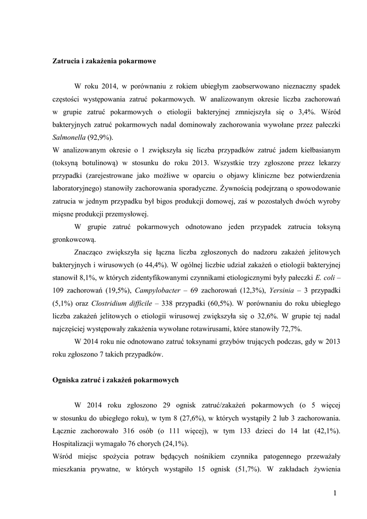 Zatrucia i zakażenia pokarmowe W roku 2014, w porównaniu z rokiem ubiegłym zaobserwowano nieznaczny spadek częstości występowania zatruć pokarmowych. W analizowanym okresie liczba zachorowań w grupie zatruć pokarmowych o etiologii bakteryjnej zmniejszyła się o 3,4%. Wśród bakteryjnych zatruć pokarmowych nadal dominowały zachorowania wywołane przez pałeczki Salmonella (92,9%). W analizowanym okresie o 1 zwiększyła się liczba przypadków zatruć jadem kiełbasianym (toksyną botulinową) w stosunku do roku 2013. Wszystkie trzy zgłoszone przez lekarzy przypadki (zarejestrowane jako możliwe w oparciu o objawy kliniczne bez potwierdzenia laboratoryjnego) stanowiły zachorowania sporadyczne. Żywnością podejrzaną o spowodowanie zatrucia w jednym przypadku był bigos produkcji domowej, zaś w pozostałych dwóch wyroby mięsne produkcji przemysłowej. W grupie zatruć pokarmowych odnotowano jeden przypadek zatrucia toksyną gronkowcową. Znacząco zwiększyła się łączna liczba zgłoszonych do nadzoru zakażeń jelitowych bakteryjnych i wirusowych (o 44,4%). W ogólnej liczbie udział zakażeń o etiologii bakteryjnej stanowił 8,1%, w których zidentyfikowanymi czynnikami etiologicznymi były pałeczki E. coli – 109 zachorowań (19,5%), Campylobacter – 69 zachorowań (12,3%), Yersinia – 3 przypadki (5,1%) oraz Clostridium difficile – 338 przypadki (60,5%). W porównaniu do roku ubiegłego liczba zakażeń jelitowych o etiologii wirusowej zwiększyła się o 32,6%. W grupie tej nadal najczęściej występowały zakażenia wywołane rotawirusami, które stanowiły 72,7%. W 2014 roku nie odnotowano zatruć toksynami grzybów trujących podczas, gdy w 2013 roku zgłoszono 7 takich przypadków. Ogniska zatruć i zakażeń pokarmowych W 2014 roku zgłoszono 29 ognisk zatruć/zakażeń pokarmowych (o 5 więcej w stosunku do ubiegłego roku), w tym 8 (27,6%), w których wystąpiły 2 lub 3 zachorowania. Łącznie zachorowało 316 osób (o 111 więcej), w tym 133 dzieci do 14 lat (42,1%). Hospitalizacji wymagało 76 chorych (24,1%). Wśród miejsc spożycia potraw będących nośnikiem czynnika patogennego przeważały mieszkania prywatne, w których wystąpiło 15 ognisk (51,7%). W zakładach żywienia 1 zbiorowego (kawiarnia, cukiernia, dom weselny, przedszkole, stołówka szkolna, schronisko młodzieżowe, młodzieżowy ośrodek wychowawczy, stołówka zakładu pracy, plener, ośrodek harcerski, zakład leczenia uzależnień, dom wczasów dziecięcych) doszło do powstania 12 ognisk, natomiast 1 ognisko odnotowano w środowisku szpitalnym. W jednym ognisku nie ustalono miejsca spożycia ponieważ związane było z pobytem chorych poza granicami kraju. Podobnie jak w latach ubiegłych dominującym czynnikiem etiologicznym w ogniskach były odzwierzęce pałeczki Salmonella, które były przyczyną 11 ognisk zatruć pokarmowych (37,9% ognisk, 20,5% zachorowań). Nośnikami zatruć były potrawy z udziałem surowych jaj: ciasta z kremem, naleśniki (w dwóch ogniskach) oraz wyroby garmażeryjne ze schabu. W siedmiu ogniskach wywołanych pałeczkami Salmonella nie ustalono nośnika. W 2014 roku zgłoszono 14 ognisk zbiorowych zakażeń jelitowych o etiologii wirusowej, spośród których jedno wywołał wirus zapalenia wątroby typu A (HAV). W grupie tej pięć ognisk wywołały norowirusy (39-, 33-, 19-, 16- i 2-osobowe), cztery zaś rotawirusy (10-, 10-, 3i 2-osobowe). Pięć zbiorowych zakażeń jelitowych wywołanych norowirusami zarejestrowano w zakładzie leczenia uzależnień, kawiarni, schronisku młodzieżowym, młodzieżowym ośrodku wychowawczym oraz domu. Trzy z ognisk wywołanych rotawirusami wystąpiły w domu, a jedno w szpitalu. Natomiast w kolejnych czterech ogniskach nie ustalono czynnika wirusowego. Cztery zachorowania w ognisku wywołane przez czynnik HAV były zawleczone z Turcji. W pozostałych czterech ogniskach (o prawdopodobnej etiologii bakteryjnej oraz zakaźnej), w których nie ustalono czynnika infekcyjnego, ani też nośnika zakażeń zachorowało łącznie 45 osób (14,2%). Podobnie jak w 2013 roku, w 2014 wśród zarażeń o etiologii pasożytniczej nie zarejestrowano ani jednego ogniska włośnicy. Udział zachorowań w ogniskach zbiorowych zatruć i zakażeń pokarmowych zarejestrowanych w województwie wielkopolskim w roku 2014 według etiologii przedstawia rysunek 1. 2 Rys. 1. Struktura zbiorowych zatruć/zakażeń pokarmowych według czynnika zakaźnego w województwie wielkopolskim w 2014 r. 3