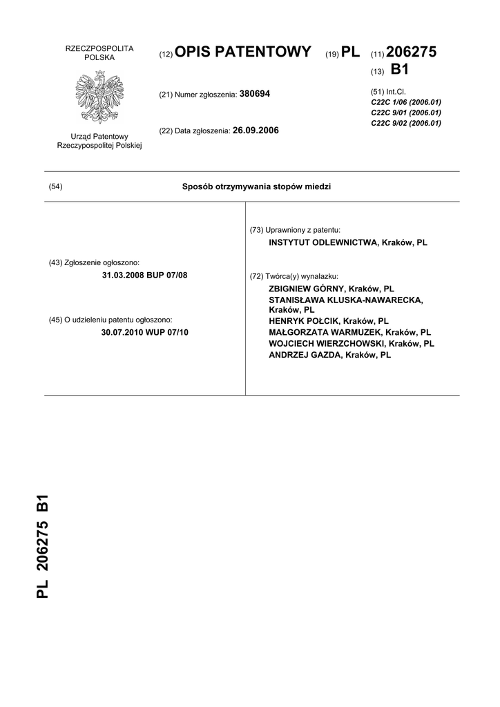 RZECZPOSPOLITA POLSKA (12) OPIS PATENTOWY (19) (21) Numer zgłoszenia: 380694 Urząd Patentowy Rzeczypospolitej Polskiej (22) Data zgłoszenia: 26.09.2006 PL 206275 (13) B1 (11) (51) Int.Cl. C22C 1/06 (2006.01) C22C 9/01 (2006.01) C22C 9/02 (2006.01) Sposób otrzymywania stopów miedzi (54) (73) Uprawniony z patentu: INSTYTUT ODLEWNICTWA, Kraków, PL (43) Zgłoszenie ogłoszono: 31.03.2008 BUP 07/08 (45) O udzieleniu patentu ogłoszono: PL 206275 B1 30.07.2010 WUP 07/10 (72) Twórca(y) wynalazku: ZBIGNIEW GÓRNY, Kraków, PL STANISŁAWA KLUSKA-NAWARECKA, Kraków, PL HENRYK POŁCIK, Kraków, PL MAŁGORZATA WARMUZEK, Kraków, PL WOJCIECH WIERZCHOWSKI, Kraków, PL ANDRZEJ GAZDA, Kraków, PL 2 PL 206 275 B1 Opis wynalazku Przedmiotem wynalazku jest sposób otrzymywania stopów miedzi, zwłaszcza brązów aluminiowych i cynowych. Z publikacji E.Brunhuber: Schmetz - und Liegierungstechnik von Kupferwerkstoffen, Berlin 1968 i R.Korzec, A.Fajkiel, E.Czekaj: Instrukcja topienia stopów metali nieżelaznych. Stopy miedzi. Kraków 2002 znane sposoby otrzymywania stopów miedzi obejmowały następujące etapy: topienie i przegrzanie pod znanym przykryciem lub złożonym z wybranych składników chemicznych lub węgla drzewnego; odtlenianie w celu ograniczenia zawartości tlenu i unikania tworzenia dodatkowych tlenków podczas topienia; odgazowanie ciekłego metalu przez rafinowanie sprężonym gazem obojętnym; bardzo rzadko stosowane rozdrabniacze ziarna, które zaliczane jest do modyfikowania drugiego rodzaju, polegającego na uzyskiwaniu dodatkowych podkładek krystalizacyjnych. W tym celu są stosowane dodatki takich pierwiastków jak: B, Ti, Zr, oraz Fe, Ca, P, C, Li, Bi czy Sb oraz ich kombinacji do brązów krzemowych, cynowych, aluminiowych, ołowiowych oraz mosiądzów ołowiowych, aluminiowych, krzemowych i zwykłych. Dodatek Ca jako środka modyfikującego w brązach cynowych i aluminiowych jest znany z publikacji F. Romankiewicza, Przegląd Odlewnictwa 17, 10/1978,239 - 242 i 30, 4/1981, 128 - 131, dodatnio wpływał na właściwości plastyczne i ograniczoną zawartość tlenu. Sposób otrzymywania stopów miedzi, zwłaszcza brązów aluminiowych i cynowych według wynalazku polega na tym, że przeprowadza się dwustopniowe odtlenianie ciekłego metalu, z tym że pierwszy stopień odtleniania prowadzi się po stopieniu wsadu metalowego dodając do kąpieli 0,1 0,15% wag. odtleniacza, którym jest fosfor w postaci jego stopów, a drugi stopień odtleniania prowadzi się po odgazowaniu kąpieli metalowej za pomocą gazu obojętnego a przed dodaniem modyfikatora, wprowadzając do kąpieli metalowej odtleniacz w postaci magnezu w ilości 0,05 - 0,12% wag., a dodawanym modyfikatorem jest metaliczny sód, lub potas, lub wapń lub stopy, lub preparaty z ich zawartością dodawany w ilości 0,02 - 0,08% wag. W sposobie otrzymywania stopów miedzi według wynalazku zastosowanie dwustopniowego odtleniania kąpieli metalowej i modyfikowania kąpieli metalowej za pomocą sodu, lub potasu lub wapnia, które poprawiają warunki zwilżania, pozwala na uzyskanie skutecznie odtlenionego stopu, na rozdrobnienie struktury, częściową sferoidyzację faz, a wskutek tego na uzyskanie wzrostu właściwości wytrzymałościowych stopów, a szczególnie właściwości plastycznych otrzymanego stopu. Wpływa na zmniejszenie ilości braków, podniesienie właściwości plastycznych zezwalających na bezpieczne stosowanie elementów w warunkach obciążeń dynamicznych, w tym udarowych. Przykłady sposobu otrzymywania stopów miedzi według wynalazku. Przykład I Do stopionej kąpieli metalowej brązu CuSn10 dodaje się 0,12% wag. P w postaci stopu CuP10. Następnie przeprowadza się odgazowanie kąpieli za pomocą azotu. Z kolei przeprowadza się drugi stopień odtleniania wprowadzając do kąpieli 0,08% wag. Mg a po nim wprowadza się modyfikator w postaci Ca w ilości 0,029% wag. Tym sposobem otrzymuje się brąz cynowy charakteryzujący się następującymi właściwościami: Rm do 288 MPa; R0,2 do 133,8 MPa; A5 do 27,8%; Z do 26%. P r z y k ł a d II Do stopionej kąpieli metalowej brązu aluminiowego CuA110Fe3Mn2 dodano 0,10% wag. P w postaci zaprawy CuP10. Następnie przeprowadza się odgazowanie kąpieli za pomocą azotu. Po odgazowaniu przeprowadza się drugi stopień odtleniania wprowadzając do kąpieli 0,12% wag. Mg. Z kolei przeprowadza się modyfikację za pomocą 0,04% wag. sodu. Tym sposobem otrzymuje się brąz aluminiowy charakteryzujący się następującymi właściwościami: Rm do 611 MPa; R0,2 do 183,5 MPa; A5 do 34%; Z do 29,46%, HB pow. 153. Stopy miedzi otrzymane sposobem według wynalazku znajdują zastosowanie w budowie maszyn, w przemyśle okrętowym, chemicznym. Zastrzeżenie patentowe Sposób otrzymywania stopów miedzi, zwłaszcza brązów aluminiowych i cynowych polegający na odtlenianiu kąpieli metalowej i jej modyfikacji za pomocą wapnia, znamienny tym, że odtlenianie prowadzi się dwustopniowo, z tym że pierwszy stopień odtleniania prowadzi się po stopieniu wsadu PL 206 275 B1 3 metalowego dodając do kąpieli 0,1 - 0,15% wag. odtleniacza, którym jest fosfor w postaci jego stopów, a drugi stopień odtleniania prowadzi się po odgazowaniu kąpieli metalowej za pomocą gazu obojętnego a przed dodaniem modyfikatora, wprowadzając do kąpieli metalowej odtleniacz w postaci magnezu w ilości 0,05 - 0,12% wag., przy czym modyfikatorem jest metaliczny sód, lub potas, lub wapń lub stopy, lub preparaty z ich zawartością dodawany w ilości 0,02 - 0,08% wag. 4 PL 206 275 B1 Departament Wydawnictw UP RP Cena 2,00 zł.
