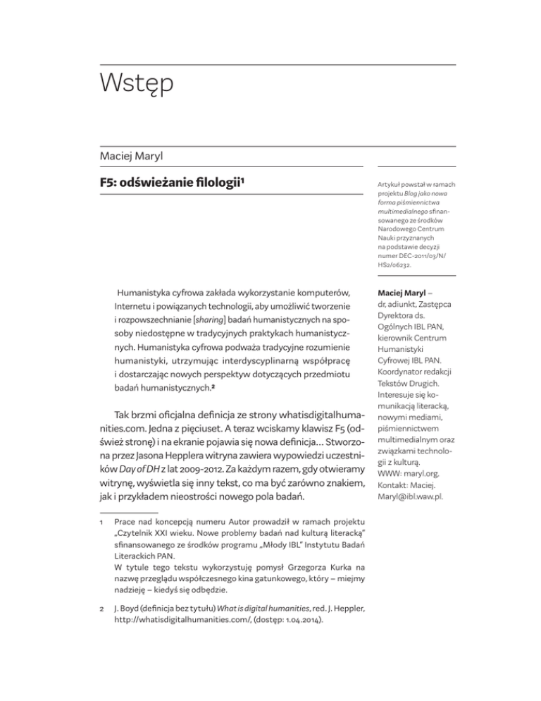 Wstęp Maciej Maryl F5: odświeżanie filologii1 1Humanistyka cyfrowa zakłada wykorzystanie komputerów, Internetu i powiązanych technologii, aby umożliwić tworzenie i rozpowszechnianie [sharing] badań humanistycznych na sposoby niedostępne w tradycyjnych praktykach humanistycznych. Humanistyka cyfrowa podważa tradycyjne rozumienie humanistyki, utrzymując interdyscyplinarną współpracę i dostarczając nowych perspektyw dotyczących przedmiotu badań humanistycznych.2 Tak brzmi oficjalna definicja ze strony whatisdigitalhumanities.com. Jedna z pięciuset. A teraz wciskamy klawisz F5 (odśwież stronę) i na ekranie pojawia się nowa definicja… Stworzona przez Jasona Hepplera witryna zawiera wypowiedzi uczestników Day of DH z lat 2009-2012. Za każdym razem, gdy otwieramy witrynę, wyświetla się inny tekst, co ma być zarówno znakiem, jak i przykładem nieostrości nowego pola badań. 1 Prace nad koncepcją numeru Autor prowadził w ramach projektu „Czytelnik XXI wieku. Nowe problemy badań nad kulturą literacką” sfinansowanego ze środków programu „Młody IBL” Instytutu Badań Literackich PAN. W tytule tego tekstu wykorzystuję pomysł Grzegorza Kurka na nazwę przeglądu współczesnego kina gatunkowego, który – miejmy nadzieję – kiedyś się odbędzie. 2 J. Boyd (definicja bez tytułu) What is digital humanities, red. J. Heppler, http://whatisdigitalhumanities.com/, (dostęp: 1.04.2014). Artykuł powstał w ramach projektu Blog jako nowa forma piśmiennictwa multimedialnego sfinansowanego ze środków Narodowego Centrum Nauki przyznanych na podstawie decyzji numer DEC-2011/03/N/ HS2/06232. Maciej Maryl – dr, adiunkt, Zastępca Dyrektora ds. Ogólnych IBL PAN, kierownik Centrum Humanistyki Cyfrowej IBL PAN. Koordynator redakcji Tekstów Drugich. Interesuje się komunikacją literacką, nowymi mediami, piśmiennictwem multimedialnym oraz związkami technologii z kulturą. WWW: maryl.org. Kontakt: Maciej. [email protected]. 10 teksty drugie 2014 / 2 nowa (?) filologia F5 Czy humanistyka cyfrowa rzeczywiście jest jakimś nowym tworem, prądem, kierunkiem? Jeżeli w istocie jest tak, jak chce cytowany wyżej Boyd, to humanistykę cyfrową uprawiamy w redakcji „Tekstów Drugich” od lat, a przynajmniej od początku lat 90., kiedy to redaktor naczelny przywiózł ze stypendium w Yale wielkiego Maca. Potem kable światłowodowe dotarły do Pałacu Staszica i w redakcji pojawił się Internet, z czasem wifi, a obieg tekstów (to już przed paru laty) niepostrzeżenie przeszedł do korespondencji mailowej. Ostatni list (primaaprilisowy żart pisany na maszynie) dostaliśmy jakiś rok temu. A dziś? Dziś trzymamy pliki w chmurze, korzystamy z oprogramowania do pracy grupowej, drukarka zbiera kurz i częściej korzystamy z wbudowanego w nią skanera, a na zebraniach siedzimy z tabletami… Czy tego typu czynności wpisują się w humanistykę cyfrową? Coś jest na rzeczy, jeśli – w trybie dygresji ubiegającej kolejny, bliźniaczy numer (o czym jeszcze będzie mowa) – przywołać przeróżnych myślicieli zwracających uwagę na wpływ różnych technologii pisania na sposób, w jaki myślimy3. F5 Humanistyka cyfrowa to taka odświeżana humanistyka. „Cyfrowość” przydaje powabu (by nie rzec: „lansu”), efektu nowości, tajemniczości (nie wszyscy się przecież na tym znamy) czy wręcz „geekowości”. „Cyfrowe” znaczy „nowe”. Cyfrowe jest sexy. Gregory Crane, historyk starożytności i jeden z pionierów cyfrowej humanistyki (m.in. jako redaktor naczelny Perseus Digital Library), pyta przytomnie, dlaczego nie mówi się o cyfrowych fizykach, cyfrowych biologach czy (to chyba najlepsze) cyfrowych matematykach4. Odpowiedź jest prosta – nowe metody cyfrowe tak się zrosły z tymi dyscyplinami, że nie da się oderwać jednych od drugich. „Humanistyka cyfrowa” to w tym rozumieniu pleonazm, bo wszystko, co robimy, jest w jakimś stopniu cyfrowe. Tworzenie w edytorze tekstu, operacje kopiuj-wklej, cofnij, ponów, wyszukaj… wszystko zakłada korzystanie z technologii dygitalnej, w której – czy chcemy, czy nie – jesteśmy zanurzeni. F5 Jeszcze można wyjechać, jeszcze można schronić się z książką w górach, bez zasięgu, bez telefonu, bez maila. Możemy odrzucać nowinki, czytać tylko na papierze, pisać tylko w notesie… No dobra, będziemy pisać na komputerze, ale 3 Por. „Teksty Drugie” 2014 nr 3. 4 Wypowiedź w dyskusji podczas konferencji (Digital) Humanities Revisited (Hanower, 5-7 grudnia 2013). wstęp maciej maryl f 5 : o d ś w i e ż a n i e f i lo lo g i i wykorzystując tylko podstawowe opcje (i żadnych dodatkowych aplikacji czy słowników). Możemy zrezygnować z tego wszystkiego, ale to już zawsze będzie ucieczka OD. Nauki analogowo uprawiać dziś nie sposób. F5 Humanistyka cyfrowa dotyczy cyfrowości tylko w ograniczonym stopniu. To nie dyscyplina ani kierunek, tylko raczej ruch czy zespół wspólnych wartości, który przyświeca badaczom z różnych dyscyplin humanistycznych. Są jednak zdania odrębne (F5). Na przykład Piotr Celiński sytuuje „zwrot cyfrowy” obok innych zwrotów (lingwistycznego, wizualnego, postmodernistycznego, posthumanistycznego), choć jednocześnie traktuje go jako cyfryzację warsztatu, czyli – moim zdaniem – zagadnienie z poziomu metametodologii nauk humanistycznych5. Słowem, nie widzę tu wielkiej zmiany podejścia badawczego („zwrot” taką zmianę musiałby zakładać), tylko ewolucję metodologii. Humanistyka cyfrowa nie wymaga bynajmniej rezygnowania z dotychczasowych metod, podejść, stanu wiedzy, tylko polega na uprawianiu nauki w zupełnie (a może: „nieco”?) inny sposób. Najlepszym przykładem niech będzie druga część Companion to digital literary studies, wymownie zatytułowana Traditions i poświęcona metodom cyfrowym w pracy historyków literatury różnych epok6. Z drugiej zaś strony (co poznamy choćby z kolejnych części prz