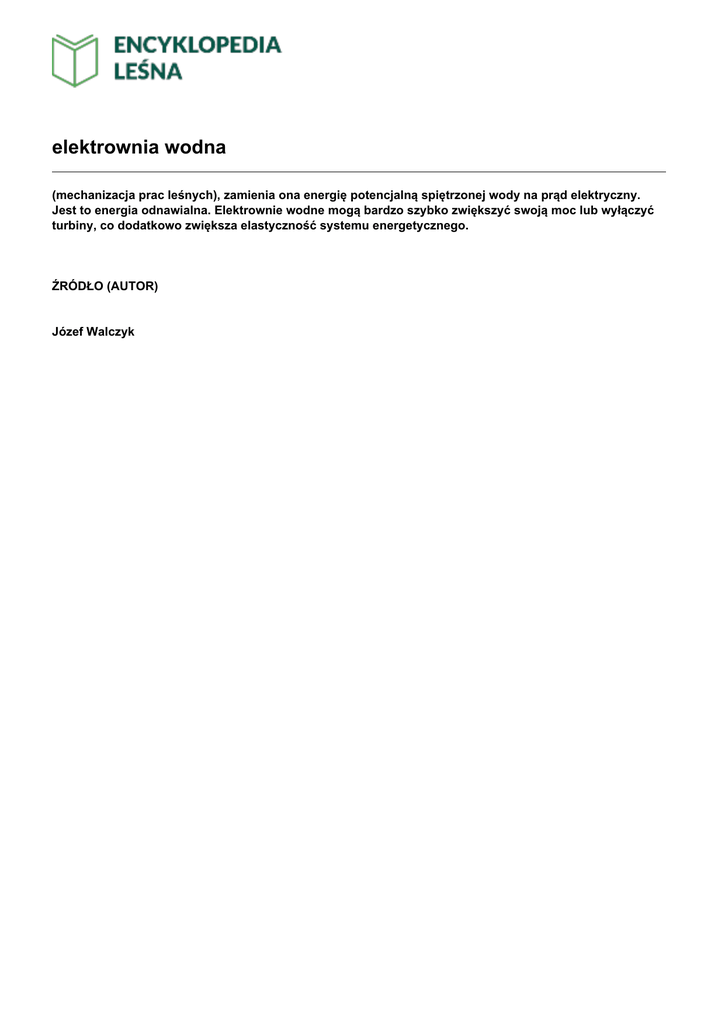 elektrownia wodna (mechanizacja prac leśnych), zamienia ona energię potencjalną spiętrzonej wody na prąd elektryczny. Jest to energia odnawialna. Elektrownie wodne mogą bardzo szybko zwiększyć swoją moc lub wyłączyć turbiny, co dodatkowo zwiększa elastyczność systemu energetycznego. ŹRÓDŁO (AUTOR) Józef Walczyk