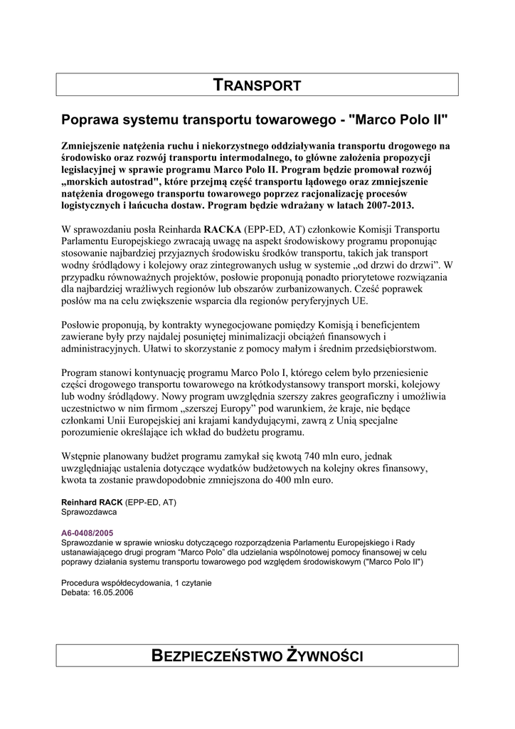 W sprawozdaniu posła Reinharda RACKA (EPP-ED, AT) członkowie Komisji Transportu