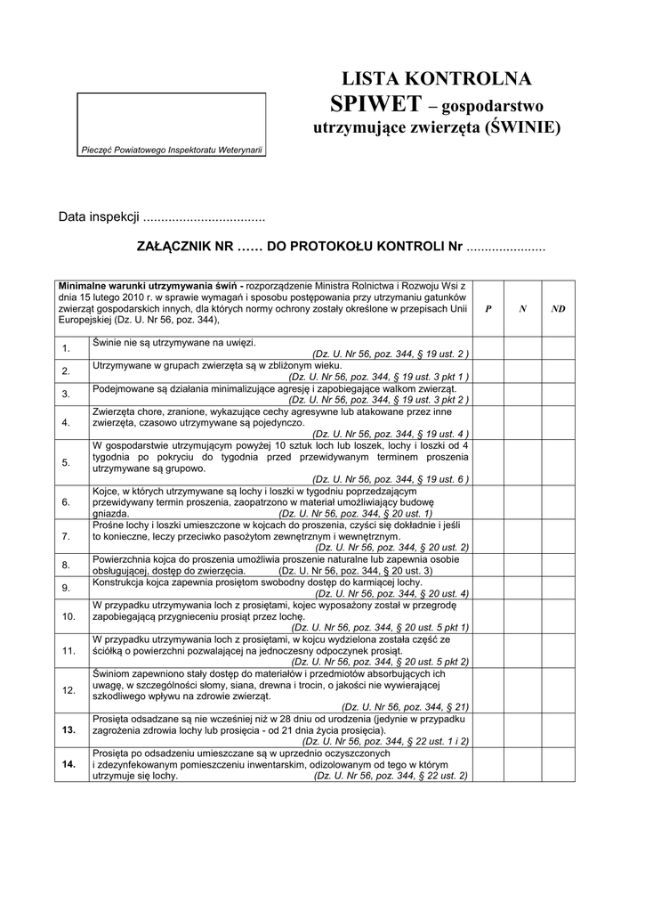 LISTA KONTROLNA SPIWET – gospodarstwo utrzymujące zwierzęta (ŚWINIE) Pieczęć Powiatowego Inspektoratu Weterynarii Data inspekcji .................................. ZAŁĄCZNIK NR …… DO PROTOKOŁU KONTROLI Nr ...................... Minimalne warunki utrzymywania świń - rozporządzenie Ministra Rolnictwa i Rozwoju Wsi z dnia 15 lutego 2010 r. w sprawie wymagań i sposobu postępowania przy utrzymaniu gatunków zwierząt gospodarskich innych, dla których normy ochrony zostały określone w przepisach Unii Europejskiej (Dz. U. Nr 56, poz. 344), 1. 2. 3. 4. 5. 6. 7. 8. 9. 10. 11. 12. 13. 14. Świnie nie są utrzymywane na uwięzi. (Dz. U. Nr 56, poz. 344, § 19 ust. 2 ) Utrzymywane w grupach zwierzęta są w zbliżonym wieku. (Dz. U. Nr 56, poz. 344, § 19 ust. 3 pkt 1 ) Podejmowane są działania minimalizujące agresję i zapobiegające walkom zwierząt. (Dz. U. Nr 56, poz. 344, § 19 ust. 3 pkt 2 ) Zwierzęta chore, zranione, wykazujące cechy agresywne lub atakowane przez inne zwierzęta, czasowo utrzymywane są pojedynczo. (Dz. U. Nr 56, poz. 344, § 19 ust. 4 ) W gospodarstwie utrzymującym powyżej 10 sztuk loch lub loszek, lochy i loszki od 4 tygodnia po pokryciu do tygodnia przed przewidywanym terminem proszenia utrzymywane są grupowo. (Dz. U. Nr 56, poz. 344, § 19 ust. 6 ) Kojce, w których utrzymywane są lochy i loszki w tygodniu poprzedzającym przewidywany termin proszenia, zaopatrzono w materiał umożliwiający budowę gniazda. (Dz. U. Nr 56, poz. 344, § 20 ust. 1) Prośne lochy i loszki umieszczone w kojcach do proszenia, czyści się dokładnie i jeśli to konieczne, leczy przeciwko pasożytom zewnętrznym i wewnętrznym. (Dz. U. Nr 56, poz. 344, § 20 ust. 2) Powierzchnia kojca do proszenia umożliwia proszenie naturalne lub zapewnia osobie obsługującej, dostęp do zwierzęcia. (Dz. U. Nr 56, poz. 344, § 20 ust. 3) Konstrukcja kojca zapewnia prosiętom swobodny dostęp do karmiącej lochy. (Dz. U. Nr 56, poz. 344, § 20 ust. 4) W przypadku utrzymywania loch z prosiętami, kojec wyposażony został w przegrodę zapobiegającą przygnieceniu prosiąt przez lochę. (Dz. U. Nr 56, poz. 344, § 20 ust. 5 pkt 1) W przypadku utrzymywania loch z prosiętami, w kojcu wydzielona została część ze ściółką o powierzchni pozwalającej na jednoczesny odpoczynek prosiąt. (Dz. U. Nr 56, poz. 344, § 20 ust. 5 pkt 2) Świniom zapewniono stały dostęp do materiałów i przedmiotów absorbujących ich uwagę, w szczególności słomy, siana, drewna i trocin, o jakości nie wywierającej szkodliwego wpływu na zdrowie zwierząt. (Dz. U. Nr 56, poz. 344, § 21) Prosięta odsadzane są nie wcześniej niż w 28 dniu od urodzenia (jedynie w przypadku zagrożenia zdrowia lochy lub prosięcia - od 21 dnia życia prosięcia). (Dz. U. Nr 56, poz. 344, § 22 ust. 1 i 2) Prosięta po odsadzeniu umieszczane są w uprzednio oczyszczonych i zdezynfekowanym pomieszczeniu inwentarskim, odizolowanym od tego w którym utrzymuje się lochy. (Dz. U. Nr 56, poz. 344, § 22 ust. 2) P N ND 15. 16. 17. 18. 19. 20. 21. 22. 23. Świnie poddaje się zabiegom: 1) diagnostycznym, terapeutycznym oraz związanym z identyfikacją świń; 2) związanym z: a) redukcją kłów u prosiąt i knurów – jedynie ze względów bezpieczeństwa oraz w celu przeciwdziałania okaleczaniu innych świń, b) obcinaniem części ogona – po ukończeniu 7 dnia życia, wyłącznie po zastosowaniu długotrwałego znieczulenia oraz, jedynie ze względów bezpieczeństwa i/lub w celu przeciwdziałania okaleczaniu innych świń, c) kastracją samców świń - po ukończeniu 7 dnia życia, wyłącznie po zastosowaniu długotrwałego znieczulenia; d) kolczykowaniem nosa. po podjęciu środków zapobiegających okaleczaniu, w szczególności poprzez zmianę warunków utrzymania. (Dz. U. Nr 56, poz. 344, § 23 ust. 1) Redukcja kłów u prosiąt i knurów wykonywana jest poprzez ich ścieranie lub obcinanie, z pozostawieniem nienaruszonej, gładkiej powierzchni oraz nie później niż w 7 dniu życia prosięcia – u prosiąt. (Dz. U. Nr 56, poz. 344, § 23 ust. 2) Kastrację samców świń wykona jest przy zastosowaniu technik niepowodujących rozrywania tkanek. (Dz. U. Nr 56, poz. 344, § 23 ust. 3) 2 Powierzchnia kojca dla knura utrzymywanego pojedynczo wynosi co najmniej 6 m . (Dz. U. Nr 56, poz. 344, § 24 ust. 1 pkt 1) Powierzchnia kojca dla knura utrzymywanego pojedynczo, w przypadku krycia, wynosi 2 co najmniej 10 m . (Dz. U. Nr 56, poz. 344, § 24 ust. 1 pkt 1) Powierzchnia kojca dla lochy w okresie porodu i odchowu prosiąt ssących wynosi co 2 najmniej 3,5 m . (Dz. U. Nr 56, poz. 344, § 24 ust. 1 pkt 2) Powierzchnia kojca dla knurów i loszek hodowlanych o masie 30 do 110 kg, 2 utrzymywanych pojedynczo, wynosi co najmniej 2,7 m . (Dz. U. Nr 56, poz. 344, § 24 ust. 1 pkt 3) W systemie utrzymywania loch pojedynczo wymiary kojca wynoszą: - długość - co najmniej długość zwierzęcia + 0,3m, niemniej jednak niż 2m;……….m - szerokość - co najmniej 0,6m. ………m (Dz. U. Nr 56, poz. 344, § 24 ust. 2) W systemie utrzymywania świń grupowo powierzchnia kojca wynosi: 2 knury – co najmniej 6m . 23a. dł………… x szer…………= 2 2 szt = ……..m /szt (Dz. U. Nr 56, poz. 344, § 24 ust. 3 pkt 1) 2 warchlaki i tuczniki do 10 kg masy ciała – 0,15 m . 23b. 23c. 23d. 23e. 23f. 23g. 23h. 24. dł………… x szer…………= ….. m / 2 ….. m / 2 szt = ……..m /szt (Dz. U. Nr 56, poz. 344, § 24 ust. 3 pkt 2, lit.a) 2 warchlaki i tuczniki powyżej 10 do 20 kg masy ciała – 0,2 m . 2 2 dł………… x szer…………= ….. m / szt = ……..m /szt (Dz. U. Nr 56, poz. 344, § 24 ust. 3 pkt 2, lit.b) 2 warchlaki i tuczniki powyżej 20 do 30 kg masy ciała – 0,3 m . 2 2 dł………… x szer…………= ….. m / szt = ……..m /szt (Dz. U. Nr 56, poz. 344, § 24 ust. 3 pkt 2, lit.c) 2 warchlaki i tuczniki powyżej 30 do 50 kg masy ciała – 0,4 m . 2 2 dł………… x szer…