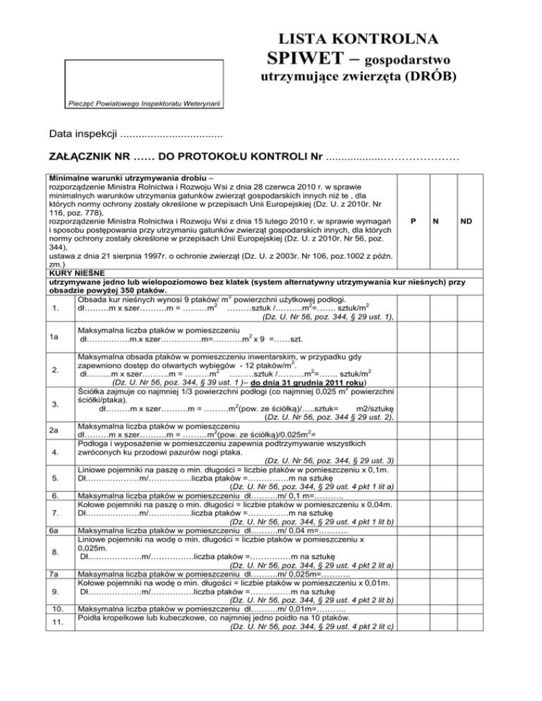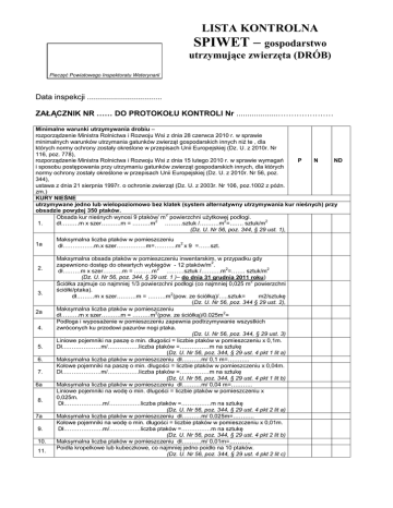 LISTA KONTROLNA SPIWET – gospodarstwo utrzymujące zwierzęta (DRÓB) Pieczęć Powiatowego Inspektoratu Weterynarii Data inspekcji .................................. ZAŁĄCZNIK NR …… DO PROTOKOŁU KONTROLI Nr ...................………………… Minimalne warunki utrzymywania drobiu – rozporządzenie Ministra Rolnictwa i Rozwoju Wsi z dnia 28 czerwca 2010 r. w sprawie minimalnych warunków utrzymania gatunków zwierząt gospodarskich innych niż te , dla których normy ochrony zostały określone w przepisach Unii Europejskiej (Dz. U. z 2010r. Nr 116, poz. 778), P N ND rozporządzenie Ministra Rolnictwa i Rozwoju Wsi z dnia 15 lutego 2010 r. w sprawie wymagań i sposobu postępowania przy utrzymaniu gatunków zwierząt gospodarskich innych, dla których normy ochrony zostały określone w przepisach Unii Europejskiej (Dz. U. z 2010r. Nr 56, poz. 344), ustawa z dnia 21 sierpnia 1997r. o ochronie zwierząt (Dz. U. z 2003r. Nr 106, poz.1002 z późn. zm.) KURY NIEŚNE utrzymywane jedno lub wielopoziomowo bez klatek (system alternatywny utrzymywania kur nieśnych) przy obsadzie powyżej 350 ptaków. 2 Obsada kur nieśnych wynosi 9 ptaków/ m powierzchni użytkowej podłogi. 2 2 2 1. dł………m x szer……….m = ………m ………sztuk /……….m =……. sztuk/m (Dz. U. Nr 56, poz. 344, § 29 ust. 1), 1a 2. 3. 2a 4. 5. 6. 7. 6a 8. 7a 9. 10. 11. Maksymalna liczba ptaków w pomieszczeniu 2 dł…………….m.x szer……………m=………..m x 9 =……szt. Maksymalna obsada ptaków w pomieszczeniu inwentarskim, w przypadku gdy 2 zapewniono dostęp do otwartych wybiegów - 12 ptaków/m . 2 2 2 dł………m x szer……….m = ………m ………sztuk /……….m =……. sztuk/m (Dz. U. Nr 56, poz. 344, § 39 ust. 1 )– do dnia 31 grudnia 2011 roku) 2 Ściółka zajmuje co najmniej 1/3 powierzchni podłogi (co najmniej 0,025 m powierzchni ściółki/ptaka). 2 dł………m x szer……….m = ………m (pow. ze ściółką)/…..sztuk= m2/sztukę (Dz. U. Nr 56, poz. 344 § 29 ust. 2), Maksymalna liczba ptaków w pomieszczeniu 2 2 dł………m x szer……….m = ………m (pow. ze ściółką)/0.025m = Podłoga i wyposażenie w pomieszczeniu zapewnia podtrzymywanie wszystkich zwróconych ku przodowi pazurów nogi ptaka. (Dz. U. Nr 56, poz. 344, § 29 ust. 3) Liniowe pojemniki na paszę o min. długości = liczbie ptaków w pomieszczeniu x 0,1m. Dł.……………….m/…………….liczba ptaków =……………m na sztukę (Dz. U. Nr 56, poz. 344, § 29 ust. 4 pkt 1 lit a) Maksymalna liczba ptaków w pomieszczeniu dł……….m/ 0,1 m=……….. Kołowe pojemniki na paszę o min. długości = liczbie ptaków w pomieszczeniu x 0,04m. Dł.……………….m/…………….liczba ptaków =……………m na sztukę (Dz. U. Nr 56, poz. 344, § 29 ust. 4 pkt 1 lit b) Maksymalna liczba ptaków w pomieszczeniu dł……….m/ 0,04 m=……….. Liniowe pojemniki na wodę o min. długości = liczbie ptaków w pomieszczeniu x 0,025m. Dł.……………….m/…………….liczba ptaków =……………m na sztukę (Dz. U. Nr 56, poz. 344, § 29 ust. 4 pkt 2 lit a) Maksymalna liczba ptaków w pomieszczeniu dł……….m/ 0,025m=……….. Kołowe pojemniki na wodę o min. długości = liczbie ptaków w pomieszczeniu x 0,01m. Dł.……………….m/…………….liczba ptaków =……………m na sztukę (Dz. U. Nr 56, poz. 344, § 29 ust. 4 pkt 2 lit b) Maksymalna liczba ptaków w pomieszczeniu dł……….m/ 0,01m=……….. Poidła kropelkowe lub kubeczkowe, co najmniej jedno poidło na 10 ptaków. (Dz. U. Nr 56, poz. 344, § 29 ust. 4 pkt 2 lit c) 12. 13. 12a 14. 13a 15. 14a 16. 17. 18. 19. 20. 21. 22. 23. 24. 25. 26. 27. 28. 29. 30. 31. 32. 33. 34. Co najmniej 2 poidła kropelkowe lub kubeczkowe podłączone do sieci wodociągowej, dostępne dla każdej z kur (Dz. U. Nr 56, poz. 344, § 29 ust. 4 pkt 2 lit d) Pojedyncze gniazda, co najmniej 1 na 7 ptaków. ………..sztuk /………. gniazd = sztuk/gniazdo (Dz. U. Nr 56, poz. 344, § 29 ust. 4 pkt 3 lit a) Maksymalna liczba ptaków w pomieszczeniu …….gniazd x 7 = 2 Gniazda grupowe z odpowiednią obsadą ptaków na m2 (do 120 ptaków/m ). 2 Dł….x szer…… = ….. m gniazda x …..gniazd = ……m2 gniazd 2 ……..szt/120 = sztuk/m (Dz. U. Nr 56, poz. 344, § 29 ust. 4 pkt 3 lit b) 2 Maksymalna liczba ptaków w pomieszczeniu ……. m gniazd x 120 = Właściwe grzędy bez ostrych krawędzi, umieszczone nad powierzchnią niepokrytą ściółką (0,15 m na 1 ptaka). Dł………. m/…….. sztuk = (Dz. U. Nr 56, poz. 344, § 29 ust. 4 pkt 4) Maksymalna liczba ptaków w pomieszczeniu dł………..m/0.15m = Właściwa odległość pomiędzy grzędami …………….. Właściwa odległość pomiędzy grzędą a sciana ………… (Dz. U. Nr 56, poz. 344, § 29 ust. 4 pkt 4 lit a i b) Kurom zapewniono możliwość swobodnego poruszania się pomiędzy poziomami. (Dz. U. Nr 56, poz. 344, § 29 ust. 5) Liczba poziomów nie przekracza 4. (Dz. U. Nr 56, poz. 344 § 29 ust. 5 pkt 1) Wysokość między poziomami co najmniej 0,45 m. (Dz. U. Nr 56, poz. 344, § 29 ust. 5 pkt 2) Poziomy ustawiono w sposób zapobiegający spadaniu nieczystości na niższy poziom. (Dz. U. Nr 56, poz. 344, § 29 ust. 5 pkt 3) Urządzenia do karmienia i pojenia umieszczono w sposób umożliwiający każdej z kur jednakowy dostęp do tych urządzeń (Dz. U. Nr 56, poz. 344, § 29 ust. 5 pkt 4) Pomieszczenie inwentarskie wyposażone w kilka otworów wyjściowych, jeśli kury posiadają dostęp do otwartych wybiegów. (Dz. U. Nr 56, poz. 344, § 29 ust. 6) Otwory wyjściowe rozmieszczone równomiernie na całej długości pomieszczenia inwentarskiego (Dz. U. Nr 56, poz. 344, § 29 ust. 6) Wysokość otworów wyjściowych co najmniej 0,35m. …………… m (Dz. U. Nr 56, poz. 344, § 29 ust. 7 pkt 1) Szerokość otworów wyjściowych co najmniej 0,4m. (Dz. U. Nr 56, poz. 344, § 29 ust. 7 pkt 2) Całkowita szerokość