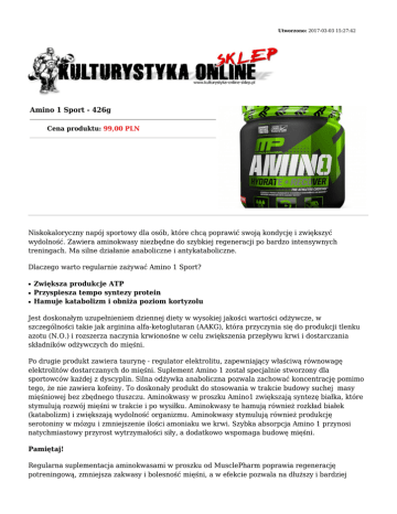 Utworzono: 2017-03-03 15:27:42 Amino 1 Sport - 426g Cena produktu: 99,00 PLN Niskokaloryczny napój sportowy dla osób, które chcą poprawić swoją kondycję i zwiększyć wydolność. Zawiera aminokwasy niezbędne do szybkiej regeneracji po bardzo intensywnych treningach. Ma silne działanie anaboliczne i antykataboliczne. Dlaczego warto regularnie zażywać Amino 1 Sport? ● ● ● Zwiększa produkcje ATP Przyspiesza tempo syntezy protein Hamuje katabolizm i obniża poziom kortyzolu Jest doskonałym uzupełnieniem dziennej diety w wysokiej jakości wartości odżywcze, w szczególności takie jak arginina alfa-ketoglutaran (AAKG), która przyczynia się do produkcji tlenku azotu (N.O.) i rozszerza naczynia krwionośne w celu zwiększenia przepływu krwi i dostarczania składników odżywczych do mięśni. Po drugie produkt zawiera taurynę - regulator elektrolitu, zapewniający właściwą równowagę elektrolitów dostarczanych do mięśni. Suplement Amino 1 został specjalnie stworzony dla sportowców każdej z dyscyplin. Silna odżywka anaboliczna pozwala zachować koncentrację pomimo tego, że nie zawiera kofeiny. To doskonały produkt do stosowania w trakcie budowy suchej masy mięśniowej bez zbędnego tłuszczu. Aminokwasy w proszku Amino1 zwiększają syntezę białka, które stymulują rozwój mięśni w trakcie i po wysiłku. Aminokwasy te hamują również rozkład białek (katabolizm) i zwiększają wydolność organizmu. Aminokwasy stymulują również produkcję serotoniny w mózgu i zmniejszenie ilości amoniaku we krwi. Szybka absorpcja Amino 1 przynosi natychmiastowy przyrost wytrzymałości siły, a dodatkowo wspomaga budowę mięśni. Pamiętaj! Regularna suplementacja aminokwasami w proszku od MusclePharm poprawia regenerację potreningową, zmniejsza zakwasy i bolesność mięśni, a w efekcie pozwala na dłuższy i bardziej wydajny trening a to z kolei widoczne efekty. Właściwości przeciwutleniające jabłczanu cytruliny, L-karnityny i L-glicyny pozwalają silnie ograniczyć zmęczenie i bolesność mięśni. Skład: Porcja: 14,2 g Porcji w opakowaniu: 30 Opakowanie: 426 g Wartości odżywcze w: 1 porcji Wartość energetyczna 5 kcal Sód 30 mg Potas 70 mg Węglowodany 0g Cukier 0g Witamina C 300 mg Witamina B6 30 mg Fosfor (jako fosforan potasu oraz sodu) 50 mg Magnez (jako tlenek) 210 mg Arginina AKG 3g Tauryna 1g L - Leucyna 1,5 g L - Walina 1g L - Izoleucyna 500 mg L - Glutamina 1g L - Alanina 1g L - Glicyna 1g Dawkowanie: Zaleca się zażywać jedną porcje zmieszaną z (54-473 ml) zimnej wody, przed, w trakcie, lub po treningu. W dni nietreningowe, spożywać w ciągu dnia. Adres: http://www.ko.sklep.pl/ Telefon: kom. 782 010 880 Email: [email protected]