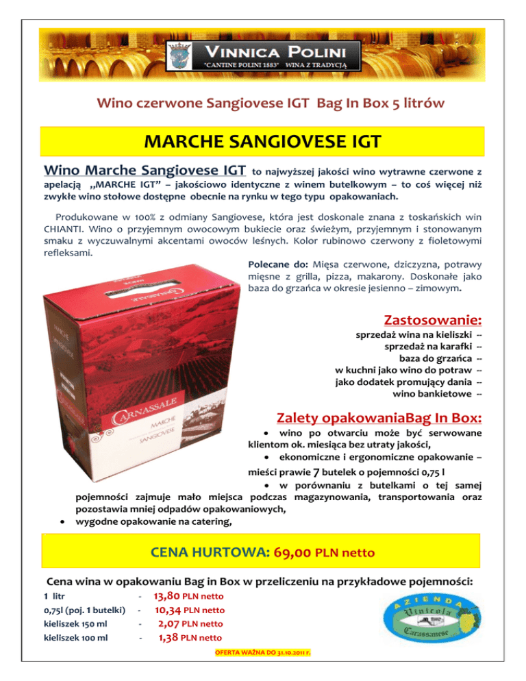 41 Wino czerwone Sangiovese IGT Bag In Box 5 litrów MARCHE SANGIOVESE IGT Wino Marche Sangiovese IGT to najwyższej jakości wino wytrawne czerwone z apelacją „MARCHE IGT” – jakościowo identyczne z winem butelkowym – to coś więcej niż zwykłe wino stołowe dostępne obecnie na rynku w tego typu opakowaniach. Produkowane w 100% z odmiany Sangiovese, która jest doskonale znana z toskańskich win CHIANTI. Wino o przyjemnym owocowym bukiecie oraz świeżym, przyjemnym i stonowanym smaku z wyczuwalnymi akcentami owoców leśnych. Kolor rubinowo czerwony z fioletowymi refleksami. Polecane do: Mięsa czerwone, dziczyzna, potrawy mięsne z grilla, pizza, makarony. Doskonałe jako baza do grzańca w okresie jesienno – zimowym. Zastosowanie: sprzedaż wina na kieliszki -sprzedaż na karafki -baza do grzańca -w kuchni jako wino do potraw -jako dodatek promujący dania -wino bankietowe. -- Zalety opakowaniaBag In Box: wino po otwarciu może być serwowane klientom ok. miesiąca bez utraty jakości, ekonomiczne i ergonomiczne opakowanie – mieści prawie 7 butelek o pojemności 0,75 l w porównaniu z butelkami o tej samej pojemności zajmuje mało miejsca podczas magazynowania, transportowania oraz pozostawia mniej odpadów opakowaniowych, wygodne opakowanie na catering, . CENA HURTOWA: 69,00 PLN netto Cena wina w opakowaniu Bag in Box w przeliczeniu na przykładowe pojemności: 1 litr - 13,80 PLN netto 0,75l (poj. 1 butelki) - 10,34 PLN netto kieliszek 150 ml 2,07 PLN netto kieliszek 100 ml 1,38 PLN netto OFERTA WAŻNA DO 31.10.2011 r.