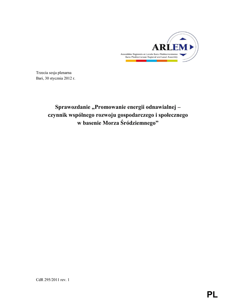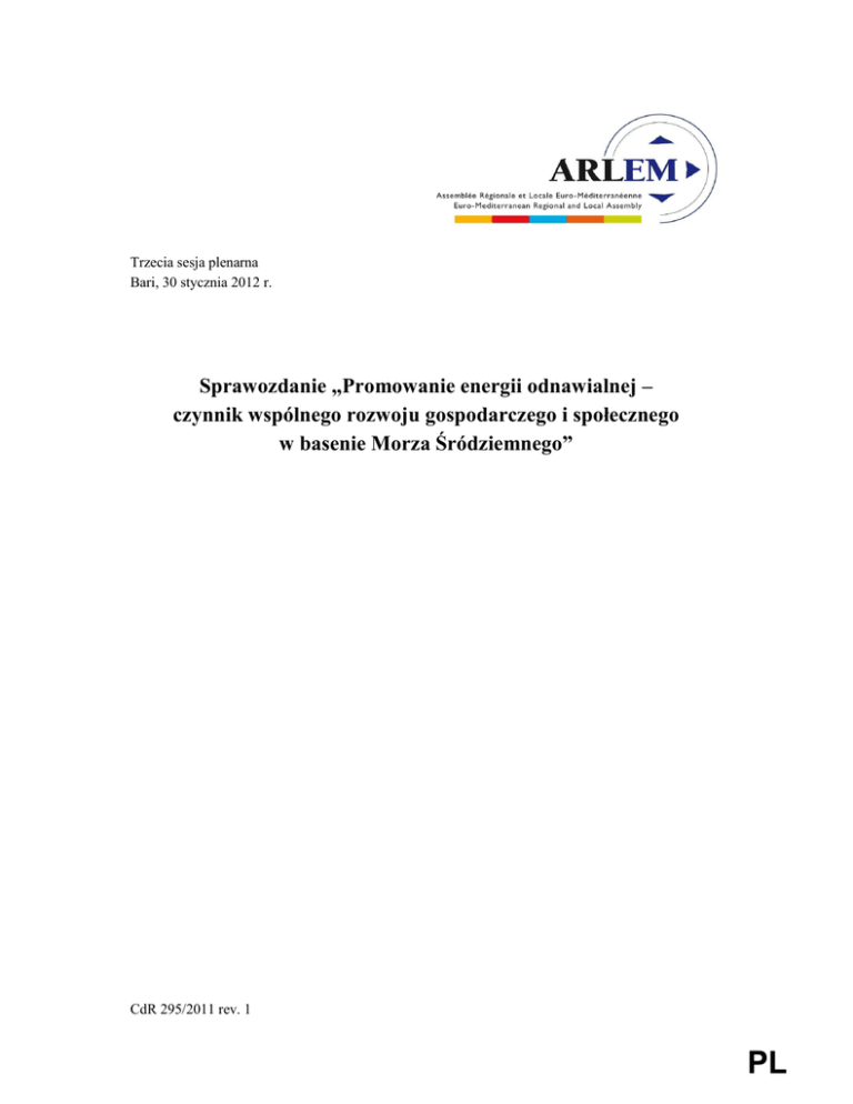Trzecia sesja plenarna Bari, 30 stycznia 2012 r. Sprawozdanie „Promowanie energii odnawialnej – czynnik wspólnego rozwoju gospodarczego i społecznego w basenie Morza Śródziemnego” CdR 295/2011 rev. 1 PL -1- Niniejsze sprawozdanie zostało opracowane przez sprawozdawcę Michela Lebruna (Walonia/BE), rozpatrzone przez członków Komisji Rozwoju ZrównowaŜonego SUDEV w dniu 6 lipca 2011 r. i przyjęte na 3. sesji plenarnej ARLEM-u w Bari (Włochy) w dniu 30 stycznia 2012 r. CdR 295/2011 rev. 1 .../... -2Energia odnawialna w basenie Morza Śródziemnego – obecna sytuacja W chwili gdy nauka ujawniła szybkie postępy i duŜy zasięg zmiany klimatu, zaczęliśmy zdawać sobie sprawę z tego, Ŝe zmiany te niosą za sobą konsekwencje, być moŜe powaŜne, dla bezpieczeństwa ludzi na całym świecie. Konieczność zmniejszenia emisji gazów cieplarnianych i zarządzania skutkami zmiany klimatu wymaga coraz ściślejszej współpracy między państwami. Coraz większa świadomość tego zagroŜenia spowodowała juŜ dostrzegalną zmianę sposobu, w jaki rosnąca liczba decydentów porusza tę kwestię, a przeciwdziałanie zmianie klimatu stało się jednym z priorytetów Unii dla Śródziemnomorza. Dziedzina energii jest obszarem, w którym współpraca eurośródziemnomorska wydaje się najbardziej zaawansowana. Silna jest współzaleŜność obu brzegów Morza Śródziemnego w zakresie dostaw energii. Część importu gazu ziemnego (36%) i ropy naftowej (20%) Unii Europejskiej zaleŜy bowiem od państw produkujących z południowej części basenu Morza Śródziemnego, które kierują do Europy blisko 90% eksportu gazu ziemnego i 50% eksportu ropy naftowej. Infrastruktura dla ropy naftowej, gazu i energii elektrycznej łącząca oba brzegi Morza Śródziemnego jest coraz bardziej rozbudowana i mocniejsza. Niemniej jednak ta współpraca w dziedzinie energii oparta na handlu nie obejmuje obecnie prawdziwego projektu zrównowaŜonego rozwoju dla całego regionu. Strategia oparta na energii ze źródeł kopalnych nie jest zrównowaŜona. Liczba mieszkańców basenu Morza Śródziemnego wynosi blisko pół miliarda i powinna osiągnąć do 2030 r. 600 mln, w tym ponad 60% to mieszkańcy południowego brzegu. Na południowym brzegu utrzymuje się silny wzrost liczby ludności, następuje błyskawiczna urbanizacja, a skupienie ludności na obszarach przybrzeŜnych ma wpływ na zapotrzebowanie na energię, jak równieŜ wpływ na środowisko. Całkowite zuŜycie energii w basenie Morza Śródziemnego stanowi 9% światowego zapotrzebowania na energię i będzie rosnąć o 1,5% rocznie. W scenariuszu opracowanym przez Śródziemnomorskie Obserwatorium Energetyczne wyciągnięto wnioski z obecnej polityki gospodarczej i energetycznej i wskazano, Ŝe zuŜycie energii w regionie będzie w dalszym ciągu opierać się głównie na energii ze źródeł kopalnych, która będzie nadal zaspokajać około 80% zapotrzebowania w 2030 r. NaleŜy jednak przypomnieć, Ŝe w Afryce Północnej występuje mniej niŜ 5% udokumentowanych światowych zasobów ropy naftowej i gazu. Z badań perspektywicznych wynika, Ŝe produkcja ropy naftowej w regionie śródziemnomorskim powinna wzrosnąć jedynie o 20% w ciągu 20 lat, podczas gdy produkcja gazu – praktycznie dwukrotnie. Spośród producentów regionu śródziemnomorskiego jedynie Libia, z uwagi na niewielką liczbę ludności, dysponuje potencjałem przewidzianym na około 50 lat. W przeciwieństwie do niej Algieria i Egipt, przy obecnym stanie wiedzy na temat zasobów, mogą zostać importerami energii. W tych warunkach w 2030 r. import w regionie śródziemnomorskim będzie musiał zaspokajać ponad 40% zapotrzebowania na ropę naftową i 30% zapotrzebowania na gaz. CdR 295/2011 rev. 1 .../... -3JeŜeli chodzi o energię odnawialną, dzięki zachętom podatkowym i politycznym oraz odkryciom technologicznym jej udział powinien wzrosnąć i w 2030 r. zaspokoić nieco ponad 10% całkowitego zapotrzebowania. Wynik ten pozostanie prawdopodobnie bardzo niski w porównaniu z celami Unii Europejskiej. Dodatkowo rozwój regionu będzie prawdopodobnie powodował wzrost emisji dwutlenku węgla, co jest niezgodne z dąŜeniem do ochrony środowiska i międzynarodowymi zobowiązaniami w zakresie zrównowaŜonego rozwoju. W rzeczywistości potencjał w zakresie energii odnawialnej jest znaczny, ale dokonania pozostają skromne. Państwa południowej i wschodniej części basenu Morza Śródziemnego znajdują się w decydującej fazie rozwoju, zarówno politycznego, jak i gospodarczego, społecznego i energetycznego. Jest naturalne, Ŝe odnotowują one wysoki wskaźnik wzrostu zapotrzebowania na energię, rzędu 6–7%, a nawet 8% w przypadku niektórych z nich. W całym regionie występują duŜe zasoby energii odnawialnej, zwłaszcza słonecznej i wiatrowej. Region dysponuje teŜ znacznym potencjałem biomasy i prawdopodobnie zasobów geotermalnych w Algierii i Maroku. Pomimo znacznych zasobów i woli ich wykorzystania deklarowanej przez większość państw, udział energii odnawialnej w bilansie energetycznym państw południowej i wschodniej części basenu Morza Śródziemnego jest wciąŜ niski, wręcz marginalny, nawet jeśli zwiększył się ponad dwukrotnie w ciągu trzech ostatnich dziesięcioleci. W ciągu tych trzydziestu lat nastąpił bowiem silny wzrost zdolności do produkcji energii odnawialnej poza energią wodną, osiągający rocznie 26%. Tendencja ta wynika głównie ze zwiększenia produkcji energii wiatrowej, nie wykorzystuje jednak istniejących moŜliwości. Sytuacja jest paradoksalna, poniewaŜ państwa północnej części basenu Morza Śródziemnego są największymi producentami energii odnawialnej w regionie, podczas gdy potencjał znajduje się raczej w części południowej. W tej pełnej kontrastów sytuacji współpraca eurośródziemnomorska ma do odegrania pewną rolę. Ponadto przeciwdziałanie zmianie klimatu stwarza dla ws