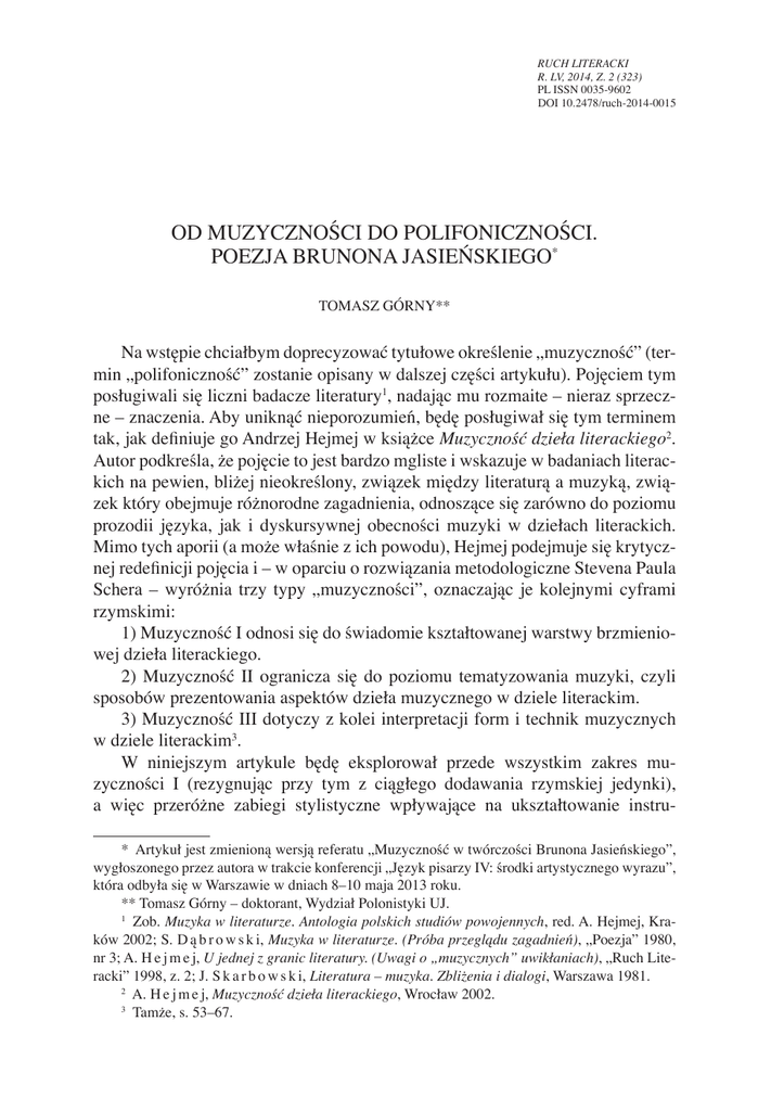 RUCH LITERACKI R. LV, 2014, Z. 2 (323) PL ISSN 0035-9602 DOI 10.2478/ruch-2014-0015 Od muzyczności do polifoniczności. Poezja Brunona Jasieńskiego* Tomasz Górny** Na wstępie chciałbym doprecyzować tytułowe określenie „muzyczność” (termin „polifoniczność” zostanie opisany w dalszej części artykułu). Pojęciem tym posługiwali się liczni badacze literatury, nadając mu rozmaite – nieraz sprzeczne – znaczenia. Aby uniknąć nieporozumień, będę posługiwał się tym terminem tak, jak definiuje go Andrzej Hejmej w książce Muzyczność dzieła literackiego. Autor podkreśla, że pojęcie to jest bardzo mgliste i wskazuje w badaniach literackich na pewien, bliżej nieokreślony, związek między literaturą a muzyką, związek który obejmuje różnorodne zagadnienia, odnoszące się zarówno do poziomu prozodii języka, jak i dyskursywnej obecności muzyki w dziełach literackich. Mimo tych aporii (a może właśnie z ich powodu), Hejmej podejmuje się krytycznej redefinicji pojęcia i – w oparciu o rozwiązania metodologiczne Stevena Paula Schera – wyróżnia trzy typy „muzyczności”, oznaczając je kolejnymi cyframi rzymskimi: 1) Muzyczność I odnosi się do świadomie kształtowanej warstwy brzmieniowej dzieła literackiego. 2) Muzyczność II ogranicza się do poziomu tematyzowania muzyki, czyli sposobów prezentowania aspektów dzieła muzycznego w dziele literackim. 3) Muzyczność III dotyczy z kolei interpretacji form i technik muzycznych w dziele literackim. W niniejszym artykule będę eksplorował przede wszystkim zakres muzyczności I (rezygnując przy tym z ciągłego dodawania rzymskiej jedynki), a więc przeróżne zabiegi stylistyczne wpływające na ukształtowanie instru* Artykuł jest zmienioną wersją referatu „Muzyczność w twórczości Brunona Jasieńskiego”, wygłoszonego przez autora w trakcie konferencji „Język pisarzy IV: środki artystycznego wyrazu”, która odbyła się w Warszawie w dniach 8–10 maja 2013 roku. ** Tomasz Górny – doktorant, Wydział Polonistyki UJ. Zob. Muzyka w literaturze. Antologia polskich studiów powojennych, red. A. Hejmej, Kraków 2002; S. D ą b r o w s k i, Muzyka w literaturze. (Próba przeglądu zagadnień), „Poezja” 1980, nr 3; A. H e j m e j, U jednej z granic literatury. (Uwagi o „muzycznych” uwikłaniach), „Ruch Literacki” 1998, z. 2; J. S k a r b o w s k i, Literatura – muzyka. Zbliżenia i dialogi, Warszawa 1981. A. H e j m e j, Muzyczność dzieła literackiego, Wrocław 2002. Tamże, s. 53–67. 208 Tomasz Górny mentacji głoskowej: aliteracje, enumeracje, onomatopeje, paralelizmy, figury (pseudo)etymologiczne itp. Podejmę również próbę odczytania pewnych utworów przez pryzmat autorskiej kategorii polifonizacji literatury, która wpisuje się w obszar, jaki Hejmej wyznaczył muzyczności III. Przedmiotem badania będą – jak informuje drugi człon tytułu – utwory Brunona Jasieńskiego, polskiego poety kojarzonego z grupą futurystów. Dowartościowanie poziomu brzmieniowości w twórczości tego ruchu jest znamienne. Beata Śniecikowska, autorka podstawowej monografii dotyczącej roli dźwięku w poezji Anatola Sterna, Aleksandra Wata, Brunona Jasieńskiego, Stanisława Młodożeńca i Tytusa Czyżewskiego, pisze: „Polski futuryzm stworzył, częściowo zapożyczając się u literackich sąsiadów, bardzo bogaty wachlarz różnorodnie funkcjonalizowanych zabiegów brzmieniowych. Był prądem, którego wszyscy przedstawiciele, bez względu na różnice poetyki, dbali o szczególną organizację warstwy dźwiękowej swej poezji”. Zakres wykorzystywania brzmieniowych walorów mowy jest w poezji Jasieńskiego bardzo szeroki. Jego realizacje poetyckie wykorzystują m.in. tradycję modernistycznej poetyki umuzycznienia. Śniecikowska za najważniejsze wyznaczniki tej ostatniej uznaje: a) znaczeniową „mglistość” i tajemniczość świata przedstawionego; b) występowanie wyrażeń odnoszących się do znaczeń muzycznych (nazwy instrumentów itp.); c) anafory; d) aliteracje; e) onomatopeje; f) rzadko występujące i fonetycznie wyraziste słowa polskie; g) barbaryzmy; h) układy paraleliczne, refrenowe powtórzenia i inne. Część tych postulatów realizuje wiersz Jasieńskiego Deszcz, którego motto wskazuje na XIX-wieczne inspiracje. Ów wzięty od Verlaine’a wers: Oh, le bruit de la pluie…, wyznacza obszar tradycji modernistycznej, w który wpisuje się utwór polskiego futurysty: Pod pojęciem instrumentacji głoskowej rozumiem ogół zabiegów stylistycznych, uwydatniających brzmieniową warstwę utworu i wiążących się z prozodycznymi właściwościami języka. Zob. Słownik terminów literackich, red. J. Sławiński i in., Wrocław 1976. Futuryzm Jasieńskiego jest problematyczny, ponieważ poeta już w 1923 roku deklarował na łamach „Zwrotnicy”, że przestał być futurystą. Niemniej z historycznoliterackiego punktu widzenia najrozsądniejsza wydaje się periodyzacja przyjęta m.in. przez Beatę Śniecikowską, która datuje ten ruch literacko-społeczny na lata 1919–1926, włączając doń również utwory Jasieńskiego napisane w okresie 1923–1926. Zob. B. Ś n i e c i k o w s k a, „Nuż w uhu”? Koncepcje dźwięku w poezji polskiego futuryzmu, Wrocław 2008, s. 9–12. Tamże, s. 520. Tamże, s. 75. Motto przytaczam za: B. J a s i e ń s k i, But w butonierce i inne wiersze, oprac. K. Jaworski, Warszawa 2006, s. 41. Wydanie Biblioteki Narodowej (B. J a s i e ń s k i, Utwory poetyckie. Manifesty. Szkice, oprac. E. Balcerzan, BN I, nr 211, Wrocław 1972, s. 11) oraz najnowsza edycja poezji futurysty (B. J a s i e ń s k i, Poezje zebrane, oprac. B. Lentas, Gdańsk 2008, s. 37) podają odmienną wersję, mianowicie owo motto zostało zapisane w formie Oh, le bruits de la pluie…, która jest niepoprawna z punktu widzenia francuskiej gramatyki, gdyż rodzajnik le został użyty w liczbie pojedynczej, zaś rzeczo
