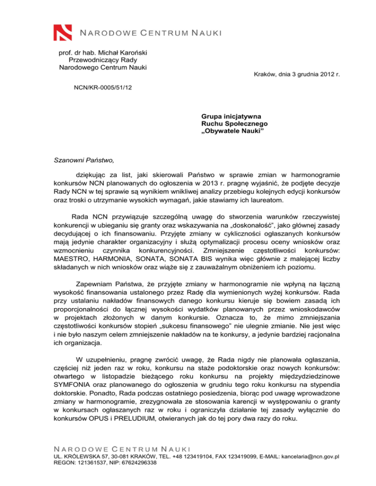 prof. dr hab. Michał Karoński Przewodniczący Rady Narodowego Centrum Nauki Kraków, dnia 3 grudnia 2012 r. NCN/KR-0005/51/12 Grupa inicjatywna Ruchu Społecznego „Obywatele Nauki” Szanowni Państwo, dziękując za list, jaki skierowali Państwo w sprawie zmian w harmonogramie konkursów NCN planowanych do ogłoszenia w 2013 r. pragnę wyjaśnić, że podjęte decyzje Rady NCN w tej sprawie są wynikiem wnikliwej analizy przebiegu kolejnych edycji konkursów oraz troski o utrzymanie wysokich wymagań, jakie stawiamy ich laureatom. Rada NCN przywiązuje szczególną uwagę do stworzenia warunków rzeczywistej konkurencji w ubieganiu się granty oraz wskazywania na „doskonałość”, jako głównej zasady decydującej o ich finansowaniu. Przyjęte zmiany w cykliczności ogłaszanych konkursów mają jedynie charakter organizacyjny i służą optymalizacji procesu oceny wniosków oraz wzmocnieniu czynnika konkurencyjności. Zmniejszenie częstotliwości konkursów: MAESTRO, HARMONIA, SONATA, SONATA BIS wynika więc głównie z malejącej liczby składanych w nich wniosków oraz wiąże się z zauważalnym obniżeniem ich poziomu. Zapewniam Państwa, że przyjęte zmiany w harmonogramie nie wpłyną na łączną wysokość finansowania ustalonego przez Radę dla wymienionych wyżej konkursów. Rada przy ustalaniu nakładów finansowych danego konkursu kieruje się bowiem zasadą ich proporcjonalności do łącznej wysokości wydatków planowanych przez wnioskodawców w projektach złożonych w danym konkursie. Oznacza to, że mimo zmniejszania częstotliwości konkursów stopień „sukcesu finansowego” nie ulegnie zmianie. Nie jest więc i nie było naszym celem zmniejszenie nakładów na te konkursy, a jedynie bardziej racjonalna ich organizacja. W uzupełnieniu, pragnę zwrócić uwagę, że Rada nigdy nie planowała ogłaszania, częściej niż jeden raz w roku, konkursu na staże podoktorskie oraz nowych konkursów: otwartego w listopadzie bieżącego roku konkursu na projekty międzydziedzinowe SYMFONIA oraz planowanego do ogłoszenia w grudniu tego roku konkursu na stypendia doktorskie. Ponadto, Rada podczas ostatniego posiedzenia, biorąc pod uwagę wprowadzone zmiany w harmonogramie, zrezygnowała ze stosowania karencji w występowaniu o granty w konkursach ogłaszanych raz w roku i ograniczyła działanie tej zasady wyłącznie do konkursów OPUS i PRELUDIUM, otwieranych jak do tej pory dwa razy do roku. UL. KRÓLEWSKA 57, 30-081 KRAKÓW, TEL. +48 123419104, FAX 123419099, E-MAIL: [email protected] REGON: 121361537, NIP: 67624296338 Na zakończenie chciałbym podkreślić, że Rada NCN na bieżąco reaguje na głosy środowiska naukowego, czego wyrazem jest wiele konkretnych działań podejmowanych na rzecz rozwoju systemu grantowego czy udoskonalania przyjętego procesu oceny projektów badawczych. Budując od podstaw nową instytucję grantową, jaką jest Narodowe Centrum Nauki, Rada pracuje w głębokim przeświadczeniu, że powstanie Centrum dało środowisku naukowemu niepowtarzalną szansę autonomicznego decydowania zarówno o formach konkursowego finansowania badań podstawowych w Polsce jak i o kształcie i jakości stosowanych procedur. Dlatego też z wielką uwagą wsłuchujemy się we wszelkie sugestie i opinie z zewnątrz, które mogą mieć wpływ na podejmowanie przez Radę decyzji determinujących kształt tego systemu na wiele nadchodzących lat. Pragnę wyrazić również nadzieję, że zauważają Państwo nasze wysiłki na rzecz stworzenia sprawnego i uczciwego systemu grantowego oraz to, że w 2013 roku, po niespełna dwóch latach działalności, oferta Narodowego Centrum Nauki obejmuje bezprecedensową liczbę dziewięciu różnych typów konkursów, w tym pięciu skierowanych bezpośrednio do młodego pokolenia uczonych. Mając nadzieję, że moja odpowiedź pozwoli rozwiać Państwa wątpliwości co do charakteru przyjętych zmian oraz licząc na dalszą współpracę i bezpośrednie spotkanie z reprezentowanym przez Państwa środowiskiem, pozostaję z wyrazami szacunku Do wiadomości: 1. 2. 3. 4. 5. mgr Piotr Bentkowski dr hab. Marcin Grynberg dr Anna Muszewska dr Łukasz Niesiołowski -Spano dr Aneta Pieniądz UL. KRÓLEWSKA 57, 30-081 KRAKÓW, TEL. +48 123419104, FAX 123419099, E-MAIL: [email protected] REGON: 121361537, NIP: 67624296338