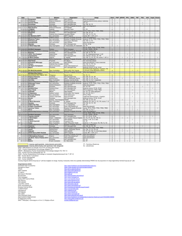 Data 17.01.2015 24.01.2015 30-31.01.2015 21.02.2015 21.02.2015 Nazwa Śniegołazik II Krzaczor Zimowa Pełnia Zimowisko Gdańskie Biegi Parkowe na Orientację 27.02-01.03.2015 Rajd Stolemy 07.03.2015 13-14.03.2015 14.03.2015 14.03.2015 21-22.03.2015 22.03.2015 28.03.2015 28.03.2015 28.03.2015 04.04.2015 06.04.2015 17-19.04.2015 26.04.2015 02.05.2015 09.05.2015 16.05.2015 16-17.05.2015 17.05.2015 22-24.05.2015 23.05.2015 30.05.2015 30-31.05.2015 30-31.05.2015 I CieMnO XIII Spiros Wiosenne GOSK XLI Manewry SKPT Gdańskie Biegi Parkowe na Orientację Wiosenny Tułacz Bielowszczak Kaszubiaczek Meander VI MnO Fajny Sad 49 ERnO Harpagan Gdańskie Biegi Parkowe na Orientację Majówka I MnO "Do Źródełka" Indywidualne III MnO Urwisko Gdańskie Biegi Parkowe na Orientację Rajd Kluka Kaszubska Włóczęga Wiosna VIII Rajd z Kompasem Bajoro Miejsce okolice Redy Gdynia Chwarzno Kociewie Kociewie Park Zaspa Północne Kaszuby Gdańsk woj. pomorskie Kociewie Gdańsk Góra Gradowa woj. pomorskie Kiełpino Górne woj. pomorskie Bory Tucholskie woj. pomorskie Kociewie lasy trójmiejskie Organizator AKK GDAKK Karol Wroński KKT Starogard Gd. KKT Starogard Gd. Bractwo Przygody Almanak KTP Bąbelki Morenka Team 16-18.10.2015 17-18.10.2015 18.10.2015 24-25.10.2015 07.11.2015 07-08.11.2015 08.11.2015 11.11.2015 13-14.11.2015 14.11.2015 28.11.2015 05-06.12.2015 06.12.2015 12.12.2015 18-19.12.2015 18-19.12.2015 20.12.2015 XXIV Mistrzostwa Polski w Indywidualnych MnO "Matnia" 2015 Stajnia Urbanowo InO-Włóczykij Nad Wdą Gdańskie Biegi Parkowe na Orientację Wakacyjny Tułacz Survivalik Moczary Solokiya River Pazur Gryfa Sukkubik VI Depniemy Maczuga Stolema III Krzaczor Wiosło Lato III MnO Warownia Szuwary II MnO Fair Play IX Rajd z Kompasem Jesienny Tułacz Harce Gdańskie Biegi Parkowe na Orientację rogaining dzienno/nocny, pieszy i rowerowy TP, TZ TD, TM, TZ, TF kilka tras biegowych TP TP, TZ Pomorski Okręgowy Związek Biathlonu TP15, TP25, TP42, TR20, TR50 KKT Starogard Gd. TD, TM, TZ, TF Jarosław Kabuła TD, TM, TJ, TP, TO SKPT Gdańsk nocna: MT, T, BT, Z, E Bractwo Przygody Almanak kilka tras biegowych Bractwo Przygody Almanak dzienna; TP15, TP25, TP30, TP50, TR50 Gimnazjum Warlubie TD, TM, TJ, TZ AKK GDAKK kilka tras pieszych KKT Starogard Gd. TP-W, TZ-W A. Kościowska, M. Sadowski TZ, TP TP 10, TP25, TP50, TP100, TR50, TR100, TR200, TM150 Kaliska PKO Harpagan Wronia Górka Bractwo Przygody Almanak kilka tras biegowych Kociewie KKT Starogard Gd. TD, TM, TZ, TF, TR Sopot/Oliwa Karol Wroński TZ, TP, długodystansowe: T, BT Kociewie KKT Starogard Gd. TD, TM-ind., TZ-ind., TF, TR Gdynia K. Nowak TD, TM, TJ, TP, TZ, TR, nocne: T, BT, E Dolina Samborowo Bractwo Przygody Almanak kilka tras biegowych Przywidz KT Alpino TZ, inne trasy piesze woj. pomorskie AKK GDAKK kilka tras pieszych i trasa rowerowa Gdańsk Park Oruński PKINO TD, TM, TJ, TP, TO gmina Choczewo KInO "Zkompasem.pl" kilka tras pieszych Kociewie KKT Starogard Gd. dzienna+nocna: TP-W, TZ-W 30-31.05.2015 XIV MnO Borowiacki Bory Tucholskie STK LUKS "Pol" Czersk 31.05.2015 Gdańskie Biegi Parkowe na Orientację Mikoszewo lub Wrzeszcz Bractwo Przygody Almanak 04-07.06.2015 13.06.2015 13.06.2015 13.06.2015 14.06.2015 20.06.2015 20.06.2015 26-27.06.2015 11-12.07.2015 25.07.2015 15.08.2015 28-29.08.2015 30.08.2015 05.09.2015 05-06.09.2015 12.09.2015 12-13.09.2015 19.09.2015 26.09.2015 26-27.09.2015 03-04.10.2015 10.10.2015 11.10.2015 Uwagi kilka tras pieszych Potęgowo Kociewie okolice Rumi Bory Tucholskie Jaśkowy Las woj. pomorskie okolice Straszyna Kociewie Solokiya River Damnica Młynki okolice Tucholi woj. pomorskie okolice Trójmiasta Kociewie Marek Pacek KKT Starogard Gd. SKKT "Włóczykij" Rumia Bractwo Czarnej Wody Bractwo Przygody Almanak Bractwo Przygody Almanak AKK GDAKK KKT Starogard Gd. KKT Starogard Gd. S.T.O.P.A Słupsk AKK GDAKK STK LUKS "Pol" Czersk GOK Główczyce Karol Wroński KKT Starogard Gd. Gdańsk - Park Reagana PKINO Bory Tucholskie K. Nowak Kociewie KKT Starogard Gd. lasy trójmiejskie J. I P. Kaczyńscy woj. pomorskie KInO "Zkompasem.pl" woj. pomorskie Bractwo Przygody Almanak Bory Tucholskie UKS Bytonia woj. pomorskie Bractwo Przygody Almanak woj. pomorskie Kociewie Sopot - Gołębiewo woj. pomorskie lasy trójmiejskie Bory Tucholskie Gdańskie Biegi Parkowe na Orientację Gdańsk Stogi Yesienne Kociewie XIV Spiros woj. pomorskie Jesień okolice Rumi Gdaczek Oliwa/Sopot XXXIX Nocne MnO Darżlub woj. pomorskie Gdańskie Biegi Parkowe na Orientację Biskupia Górka II Mikołajkowy Kompas Gdynia XXI MnO "Harce Prezesa 2015" woj. pomorskie Malo Kociewie Malino Pustki Cisowskie 50 ERnO Harpagan Topielec-Interior IV MnO Bąbel Sukkub IV MnO Cool-InO Szago TZ (III Pomorski Rogaining - 8 godzin), TM, TJ (Puchar Polski Młodzieży w MnO) kilka tras biegowych TZ, TU, TJ TD, TM, TZ, TF, TR TD, TM, TJ, TP, TO, Sz TD, TM, TJ, TZ, T, kajakowa kilka tras biegowych dzienna; TP15, TP25, TP30, TP50, TR50 kilka tras pieszych TP, TZ, TR dzienna+nocna: TP-W, TZ-W TP12 (rodzinna), TP50, TR50 TP, TU, TZ, trasa specjalna TP, TZ, TR, TK, T TP15, TP50 rogaining dzienno/nocny - 8 godzin dzienna+nocna: TP-W, TZ-W TD, TM, TJ, TP, TO dzienne: TD, TM, TJ, TZ, TR, nocne: T, E TD, TM, TZ, TF, TR TP, TZ kilka tras pieszych nocna; TP15, TP25, TP30, TP50, TR50 TD, TM, TJ, TZ, T kilka tras biegowych TP 10, TP25, TP50, TP100, TR50, TR100, TR200, TM150 PKO Harpagan KKT Starogard Gd. TP, TZ, TP-W, TZ-W Klub Turystów Pieszych Bąbelki TZ, TU, TP, Sz, TD, TM, TJ AKK GDAKK nocna; T, BT, Z, E, Geo Krzysztof Kula TZ, TP UKS "Włóczykij" Osiek dzienne: T, TR, nocne: TD, TM, TJ, TZ Bractwo Przygody Almanak kilka tras biegowych KKT Starogard Gd. TD, TM, TZ, TF, TR Pomorski Okręgowy Związek Biathlonu TP15, TP25, TP42, TR20, TR50 SKKT "Włóczykij" Rumia TD, TM, TJ, TP, TO, Sz AKK GDAKK TZ, TP, TD, TM, TJ, inne trasy piesze SKPT Gdańsk nocna: MT, T, BT, Z, E Bractwo Przygody Almanak kilka tras biegowych KInO "Zkompasem.pl" kilka tras pieszych PKO Harpagan kilk