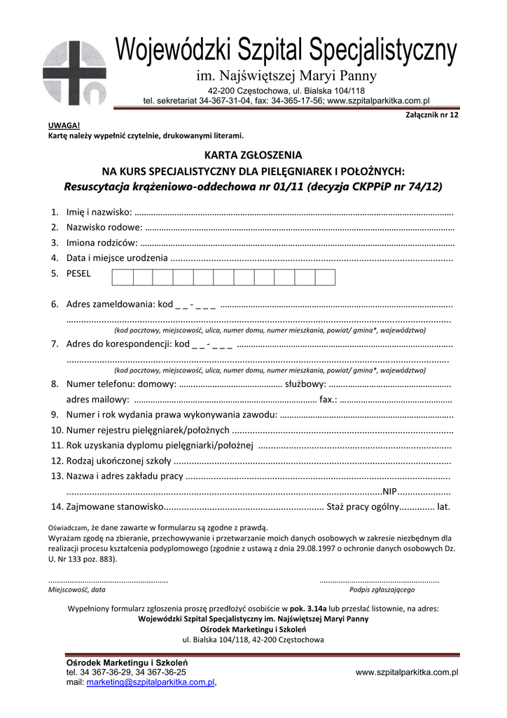 Wojewódzki Szpital Specjalistyczny im. Najświętszej Maryi Panny 42-200 Częstochowa, ul. Bialska 104/118 tel. sekretariat 34-367-31-04, fax: 34-365-17-56; www.szpitalparkitka.com.pl Załącznik nr 12 UWAGA! Kartę należy wypełnić czytelnie, drukowanymi literami. KARTA ZGŁOSZENIA NA KURS SPECJALISTYCZNY DLA PIELĘGNIAREK I POŁOŻNYCH: Resuscytacja krążeniowo-oddechowa nr 01/11 (decyzja CKPPiP nr 74/12) 1. 2. 3. 4. 5. Imię i nazwisko: ………………………………………………………………………………………………………………………. Nazwisko rodowe: …………………………………………………………………………………………………………………… Imiona rodziców: ……………………………………………………………………………………………………………….……. Data i miejsce urodzenia ............................................................................................................... PESEL 6. Adres zameldowania: kod _ _ ‐ _ _ _ ……………………………………………………………………………………... ….................................................................................................................................................... (kod pocztowy, miejscowość, ulica, numer domu, numer mieszkania, powiat/ gmina*, województwo) 7. Adres do korespondencji: kod _ _ ‐ _ _ _ ……………………………………………………………………………….. ...................................................................................................................................................... (kod pocztowy, miejscowość, ulica, numer domu, numer mieszkania, powiat/ gmina*, województwo) 8. Numer telefonu: domowy: ……..……………………………… służbowy: ……..…………………………………….. adres mailowy: …………………………………………………………………… fax.: ………………………………………… 9. Numer i rok wydania prawa wykonywania zawodu: ……………………………………………………………….. 10. Numer rejestru pielęgniarek/położnych ....................................................................................... 11. Rok uzyskania dyplomu pielęgniarki/położnej ............................................................................ 12. Rodzaj ukończonej szkoły ............................................................................................................. 13. Nazwa i adres zakładu pracy ........................................................................................................ ............................................................................................................................NIP..................... 14. Zajmowane stanowisko............................................................... Staż pracy ogólny.............. lat. Oświadczam, że dane zawarte w formularzu są zgodne z prawdą. Wyrażam zgodę na zbieranie, przechowywanie i przetwarzanie moich danych osobowych w zakresie niezbędnym dla realizacji procesu kształcenia podyplomowego (zgodnie z ustawą z dnia 29.08.1997 o ochronie danych osobowych Dz. U. Nr 133 poz. 883). ........................................................ ........................................................ Miejscowość, data Podpis zgłaszającego Wypełniony formularz zgłoszenia proszę przedłożyć osobiście w pok. 3.14a lub przesłać listownie, na adres: Wojewódzki Szpital Specjalistyczny im. Najświętszej Maryi Panny Ośrodek Marketingu i Szkoleń ul. Bialska 104/118, 42‐200 Częstochowa Ośrodek Marketingu i Szkoleń tel. 34 367-36-29, 34 367-36-25 mail: [email protected], www.szpitalparkitka.com.pl