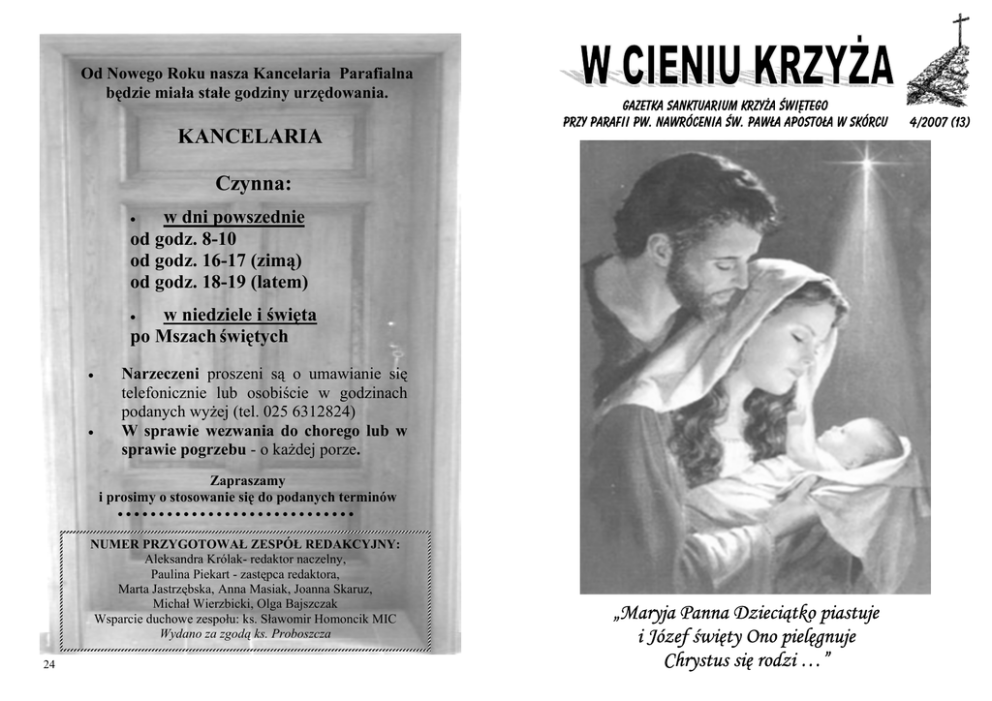 Od Nowego Roku nasza Kancelaria Parafialna będzie miała stałe godziny urzędowania. KANCELARIA Gazetka Sanktuarium Krzyża świętego przy Parafii pw. Nawrócenia św. Pawła Apostoła w Skórcu Czynna: w dni powszednie od godz. 8-10 od godz. 16-17 (zimą) od godz. 18-19 (latem) • w niedziele i święta po Mszach świętych • • • Narzeczeni proszeni są o umawianie się telefonicznie lub osobiście w godzinach podanych wyżej (tel. 025 6312824) W sprawie wezwania do chorego lub w sprawie pogrzebu - o każdej porze. Zapraszamy i prosimy o stosowanie się do podanych terminów NUMER PRZYGOTOWAŁ ZESPÓŁ REDAKCYJNY: Aleksandra Królak- redaktor naczelny, Paulina Piekart - zastępca redaktora, Marta Jastrzębska, Anna Masiak, Joanna Skaruz, Michał Wierzbicki, Olga Bajszczak Wsparcie duchowe zespołu: ks. Sławomir Homoncik MIC Wydano za zgodą ks. Proboszcza 24 „Maryja Panna Dzieciątko piastuje i Józef święty Ono pielęgnuje Chrystus się rodzi …” 4/2007 (13) OD REDAKCJI Przez cztery tygodnie adwentu pełni radości ,ale też pewnej powagi i skupienia, przygotowywaliśmy się na nadejście świąt Bożego Narodzenia to najbardziej rodzinne święta w całym roku liturgicznym, w czasie których dzieją się prawdziwe cuda .Choćby fakt, że sam Bóg przybiera ludzką postać i przychodzi na ziemię do każdego z nas. Do człowieka wiecznie pędzącego za karierą, nowinkami technicznymi, który nie ma czasu żeby na chwilę zatrzymać się i spokojnie przyjrzeć się swojemu życiu. Najlepszą ku temu okazją jest właśnie czas Bożego Narodzenia, kiedy to my mamy pochylić się nad żłóbkiem w Betlejem i przyjąć Boga do swojego serca, który nie wzgardza sercem człowieka. W tym pięknym czasie oddajemy najnowszy numer gazetki "W cieniu Krzyża". W numerze aż dwa wywiady: z ks. Józefem Chaimem i z ks. rekolekcjonistą. Piszemy także ,jak w tym roku wyglądać będzie kolęda w naszej parafii, w jakich godzinach otwarta będzie od Nowego Roku kancelaria parafialna oraz coś o nas- młodych, czasie narzeczeństwa i "chodzeniu ze sobą", co opisane jest w bardzo ciekawym świadectwie! Przełamanie się opłatkiem, radość, miłość i pokój w sercu, cała rodzina przy wspólnym stole, to za zwyczaj określenia, które najbardziej kojarzą nam się ze świętami. "Dzień, zwykły dzień, w którym gasną wszelkie spory" jak mówi słynna piosenka. Niech w tym czasie rzeczywiście one zamilkną i niech nikt z tego powodu nie czuje się samotny, odrzucony lub smutny. A dostrzeżenie wśród tej nocnej ciszy wyciągniętej ręki nie powinno kończyć się odrzuceniem. Po świętach czeka nas wejście w nowy, już 2008 rok. Wejście z nowymi planami, marzeniami, postanowieniami, w którym nie może zabraknąć Boga i wiary w niego. Niech nie zabraknie również takiej niezachwianej wiary, pokoju serca i prawdziwej radości Dziecka Bożego na nadchodzące Święta Bożego Narodzenia i na Nowy Rok, świadomości, że nawet jeśli w naszym życiu pada deszcz lub śnieg, to gdzieś tam świeci 2słońce. REDAKJCA W tym numerze: Od św. Bonifacego do Edisona str. 3 Czyli rozmowa z ks. rekolekcjonistą str. 5 str.8 ”...Wymagam zarówno od siebie jak i od innych…”- czyli rozmowa z ks. Józefem str. 11 PROBLEMY MŁODYCH Na czym polega przygotowanie się do małżeństwa? str. 17 Narzeczeństwo - co to za czas??? PLAN KOLĘDY 2007/2008 Święta Joanna Beretta Molla str.18 str.20 str.21 Szczęśliwych, kojących, wartych pamięci, przeżytych w zgodzie ze światem i z sobą samym, pełnych życia i miłości świąt Bożego Narodzenia aby wszystkie dni w roku były tak piękne i szczęśliwe, jak ten jeden wigilijny wieczór, aby Wasze twarze i twarze Waszych najbliższych zawsze rozpromieniał uśmiech, a gwiazda Betlejemska prowadziła Was ku szczytom. Życzy: Cała Redakcja, Księża Marianie i Siostry Sercanki str.22 ŻYCZENIA str.23 Godziny otwarcia Kancelarii str.24 23 Dopasuj każdemu prezent. Pokoloruj linie. Zła zima Konopnicka Maria 22 Hu! Hu! Ha! Nasza zima zła! Szczypie w nosy, szczypie w uszy Mroźnym śniegiem w oczy prószy, Wichrem w polu gna! Nasza zima zła! Hu! Hu! Ha! Nasza zima zła! Płachta na niej długa, biała, W ręku gałąź oszroniała, A na plecach drwa... Nasza zima zła! Hu! Hu! Ha! Nasza zima zła! A my jej się nie boimy, Dalej śnieżkiem w plecy zimy, Niech pamiątkę ma! Nasza zima Przygotowała Olga Bajszczak Od św. Bonifacego do Edisona Chyba nikt dziś nie wyobraża sobie świąt Bożego Narodzenia bez przystrojonego drzewka. Aż trudno uwierzyć, że zwyczaj ubierania choinki rozpowszechnił się na Starym Kontynencie dopiero ok. dwustu lat temu. W niektórych częściach Polski przyjął się stosunkowo niedawno, w II połowie XX wieku. Zwyczaj ten początkowo traktowany nieufnie na dobre wszedł do tradycji chrześcijańskiej. Ubierając choinkę, wkraczamy jakby w lepszy, prawie czarodziejski świat świąt Bożego Narodzenia, który pamiętamy z dzieciństwa. Zwyczaj przystrajania drzewka na Boże Narodzenie zawdzięczamy Niemcom. Tradycja każe uważać za "wynalazcę" choinki św. Bonifacego (zm. 754). Również bombki choinkowe wymyślili Niemcy.. Elektryczne lampki i sztuczne drzewka to już innowacje Amerykanów. Nawracając pogańskie ludy niemieckie św. Bonifacy ściął potężny dąb uważany przez Germanów za święty Upadające drzewo zniszczyło wszystkie rosnące obok krzaki. Ocalała tylko mała jodełka. – Widzicie, ta mała jodełka jest potężniejsza od waszego dębu. I jest zawsze zielona, tak jak wieczny jest Bóg dający nam wieczne życie. Niech ona przypomina wam Chrystusa – zakończył swe kazanie misjonarz. To oczywiście tylko legenda. A jak było naprawdę? Misja świętego Bonifacego Na początku VIII wieku cała Europa na zachód od Renu była już chrześcijańska. Wszędzie tam, gdzie wcześniej istniało Cesarstwo Rzymskie, powstawały kościoły i klasztory. Na terenie dzisiejszych Ni