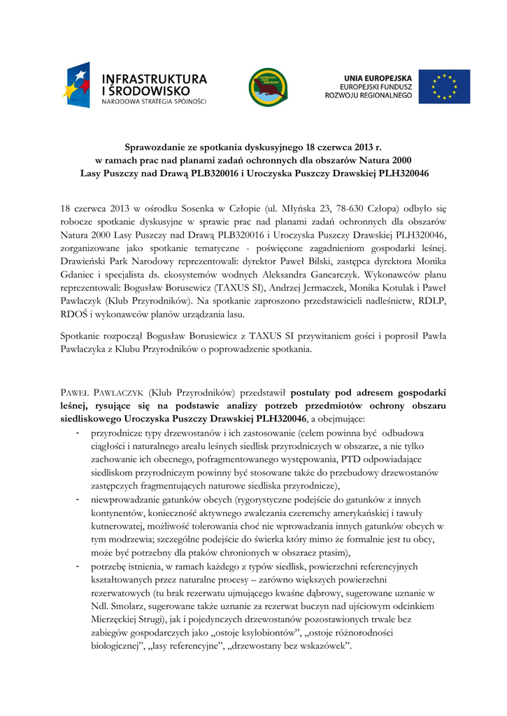 Sprawozdanie ze spotkania dyskusyjnego 18 czerwca 2013 r. w ramach prac nad planami zadań ochronnych dla obszarów Natura 2000 Lasy Puszczy nad Drawą PLB320016 i Uroczyska Puszczy Drawskiej PLH320046 18 czerwca 2013 w ośrodku Sosenka w Człopie (ul. Młyńska 23, 78-630 Człopa) odbyło się robocze spotkanie dyskusyjne w sprawie prac nad planami zadań ochronnych dla obszarów Natura 2000 Lasy Puszczy nad Drawą PLB320016 i Uroczyska Puszczy Drawskiej PLH320046, zorganizowane jako spotkanie tematyczne - poświęcone zagadnieniom gospodarki leśnej. Drawieński Park Narodowy reprezentowali: dyrektor Paweł Bilski, zastępca dyrektora Monika Gdaniec i specjalista ds. ekosystemów wodnych Aleksandra Gancarczyk. Wykonawców planu reprezentowali: Bogusław Borusewicz (TAXUS SI), Andrzej Jermaczek, Monika Kotulak i Paweł Pawlaczyk (Klub Przyrodników). Na spotkanie zaproszono przedstawicieli nadleśnictw, RDLP, RDOŚ i wykonawców planów urządzania lasu. Spotkanie rozpoczął Bogusław Borusiewicz z TAXUS SI przywitaniem gości i poprosił Pawła Pawlaczyka z Klubu Przyrodników o poprowadzenie spotkania. PAWEŁ PAWLACZYK (Klub Przyrodników) przedstawił postulaty pod adresem gospodarki leśnej, rysujące się na podstawie analizy potrzeb przedmiotów ochrony obszaru siedliskowego Uroczyska Puszczy Drawskiej PLH320046, a obejmujące: - przyrodnicze typy drzewostanów i ich zastosowanie (celem powinna być odbudowa ciągłości i naturalnego areału leśnych siedlisk przyrodniczych w obszarze, a nie tylko zachowanie ich obecnego, pofragmentowanego występowania, PTD odpowiadające siedliskom przyrodniczym powinny być stosowane także do przebudowy drzewostanów zastępczych fragmentujących naturowe siedliska przyrodnicze), - niewprowadzanie gatunków obcych (rygorystyczne podejście do gatunków z innych kontynentów, konieczność aktywnego zwalczania czeremchy amerykańskiej i tawuły kutnerowatej, możliwość tolerowania choć nie wprowadzania innych gatunków obcych w tym modrzewia; szczególne podejście do świerka który mimo że formalnie jest tu obcy, może być potrzebny dla ptaków chronionych w obszraez ptasim), - potrzebę istnienia, w ramach każdego z typów siedlisk, powierzchni referencyjnych kształtowanych przez naturalne procesy – zarówno większych powierzchni rezerwatowych (tu brak rezerwatu ujmującego kwaśne dąbrowy, sugerowane uznanie w Ndl. Smolarz, sugerowane także uznanie za rezerwat buczyn nad ujściowym odcinkiem Mierzęckiej Strugi), jak i pojedynczych drzewostanów pozostawionych trwale bez zabiegów gospodarczych jako „ostoje ksylobiontów”, „ostoje różnorodności biologicznej”, „lasy referencyjne”, „drzewostany bez wskazówek”. - - - potrzebę odtworzenia kluczowych elementów struktury lasów stanowiących siedliska przyrodnicze (drzewa stare, biocenotyczne, zasoby martwego drewna); jednymi sposbem do tego jest konsekwentne pozostawianie biogrup na kolejne pokolenie i do naturalnej śmierci i rozkładu, nie tylko na zrębach zupełnych, ale także w rębniach częściowych i stopniowych (buczyny, dąbrowy, grądy). bardzo zły stan zasobów martwego drewna, znacznie niższy niż minimum potrzeb przyrodniczych, potrzebę pozostawiania ekotonów (ok. 30m, a nie kika m) wokół chronionych siedlisk nieleśnych w lasach, np. bagien i torfowisk; potrzebę tolerowania działań bobrów, w tym pewnych podtopień i uszkodzeń drzewostanów w zasięgu bobrów; mimo pewnych szkód działania bobrów są potrzebne jako retencja. potrzebę minimalizacji zagrożeń dla wilka (od polowań zbiorowych i od budowy dróg, w tym leśnych). W dyskusji po tej prezentacji poruszono następujące zagadnienia: 1. Potrzeba weryfikacji danych o występowaniu siedlisk przyrodniczych, w szczególności danych INVENT. Weryfikacja taka została zrobiona w ndl. Smolarz i jej wyniki zostaną przyjęte do PZO. Inne nadleśnictwa sygnalizują potrzebę weryfikacji. Ndl. Głusko przeprowadza ją i udostępni wyniki w lipcu 2013 r. Celowe jest na tyle elastyczne ukształtowanie zapisów PZO, by była możliwa ciągła weryfikacja i ulepszanie rozpoznania rozmieszczenia siedlisk przyrodniczych i było to automatycznie uwzględniane, jeżeli chodzi o interpretację planu. Klub Przyrodników prześle pocztą elektroniczną aktualną roboczą warstwę siedlisk przyrodniczych obszaru, a nadleśnictwa w razie potrzeby odniosą się do tego materiału 2. Metody ochrony borów chrobotkowych 91T0. Czy akceptujemy procesy sukcesyjne prowadzące do zaniku tego zbiorowiska, czy tez staramy się je zachować. W ndl. Smolarz zaprojektowano w kompleksie borów chrobotkowych częściowo rębnię Ib, częściowo rębnię IV, która byłaby wykonywana jako małe zręby zupełne. Nie ma jednoznacznie wypracowanych właściwych metod ochrony tego siedliska, wymaga to poszukiwań i eksperymentów i podejście z Ndl. Smolarz może być za taki uznane, pod warunkiem że „ostrożnościowo” jakieś dojrzale drzewostany boru chrobotkowego pozostaną nie przeznaczone do rębni. Siedlisko przyrodnicze 91T0 powinno być interpretowane jako bory „siedliskowo uwarunkowane”: krótkotrwała faza chrobotkowa pojawiająca się tylko czasowo w fazie drągowiny w cyklu rozwoju borów świeżych nie powinna być i nie jest interpretowana jako siedlisko 91T0. 3. W aktualnej interpretacji RDLP Pila wyznaczone „ostoje ksylobiontów” nie są rozumiane jako drzewostany trwale wyłączone z zabiegów gospodarczych. Także pozostawienie drzewostanów bez wskazówki w aktualnych planach urządzenia lasu nie gwarantuje, że będą one tak pozostawione trwale, np. w kolejnych planach. Trwałe pozostawienie bez zabiegów dotyczy tzw. „drzewostanów referencyjnych” (na bazie koncepcji HCVF wymaganej przez certyfikat FSC):, ale nie zostały one jeszcze wyznaczone. W RDLP Szczecin nadleśnictwa opracowały propozycje takich drzewostanów, które jednak jeszcze nie zostały zatwierdzone. RDLP Pila