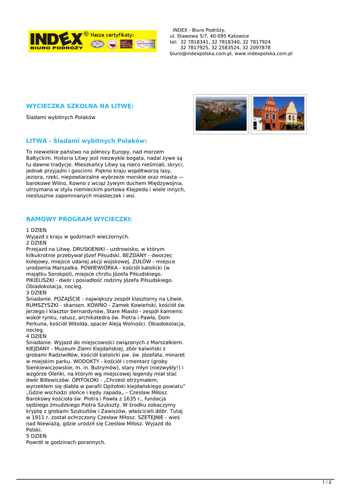 INDEX - Biuro Podróży, ul. Stawowa 5/7, 40-095 Katowice tel: 32 7818341, 32 7818340, 32 7817924 32 7817925, 32 2583524, 32 2097878 [email protected], www.indexpolska.com.pl WYCIECZKA SZKOLNA NA LITWĘ: Śladami wybitnych Polaków LITWA - Śladami wybitnych Polaków: To niewielkie państwo na północy Europy, nad morzem Bałtyckim. Historia Litwy jest niezwykle bogata, nadal żywe są tu dawne tradycje. Mieszkańcy Litwy są nieco nieśmiali, skryci, jednak przyjaźni i goscinni. Piękno kraju współtworzą lasy, jeziora, rzeki, niepowtarzalne wybrzeże morskie oraz miasta — barokowe Wilno, Kowno z wciąż żywym duchem Międzywojnia, utrzymana w stylu niemieckim portowa Kłajpeda i wiele innych, niesłusznie zapomnianych miasteczek i wsi. RAMOWY PROGRAM WYCIECZKI: 1 DZIEŃ Wyjazd z kraju w godzinach wieczornych. 2 DZIEŃ Przejazd na Litwę. DRUSKIENIKI - uzdrowisko, w którym kilkukrotnie przebywał Józef Piłsudski. BEZDANY - dworzec kolejowy, miejsce udanej akcji wojskowej. ZUŁÓW - miejsce urodzenia Marszałka. POWIEWIÓRKA - kościół katolicki (w majątku Sorokpol), miejsce chrztu Józefa Piłsudskiego. PIKIELISZKI - dwór i posiadłość rodziny Józefa Piłsudskiego. Obiadokolacja, nocleg. 3 DZIEŃ Śniadanie. POŻAJŚCIE - największy zespół klasztorny na Litwie. RUMSZYSZKI - skansen. KOWNO - Zamek Kowieński, kościół św. Jerzego i klasztor bernardynów, Stare Miasto - zespół kamienic wokół rynku, ratusz, archikatedra św. Piotra i Pawła, Dom Perkuna, kościół Witolda, spacer Aleją Wolności. Obiadokolacja, nocleg. 4 DZIEŃ Śniadanie. Wyjazd do miejscowości związanych z Marszałkiem. KIEJDANY - Muzeum Ziemi Kiejdańskiej, zbór kalwiński z grobami Radziwiłłów, kościół katolicki pw. św. Józefata, minaret w miejskim parku. WODOKTY - kościół i cmentarz (groby Sienkiewiczowskie, m. in. Butrymów), stary młyn (niezwykły!) i wzgórze Oleńki, na którym wg miejscowej legendy miał stać dwór Billewiczów. OPITOŁOKI - „Chrzest otrzymałem, wyrzekłem się diabła w parafii Opitołoki kiejdańskiego powiatu” „Gdzie wschodzi słońce i kędy zapada„ – Czesław Miłosz. Barokowy kościoła św. Piotra i Pawła z 1635 r., fundacja sędziego żmudzkiego Piotra Szukszty. W środku zobaczymy kryptę z grobami Szuksztów i Zawiszów, właścicieli dóbr. Tutaj w 1911 r. został ochrzczony Czesław Miłosz. SZETEJNIE - wieś nad Niewiażą, gdzie urodził się Czesław Miłosz. Wyjazd do Polski. 5 DZIEŃ Powrót w godzinach porannych. 1/2 CENA: od 509 zł/os przy grupie powyżej 45 uczestników od 549 zł/os przy grupie powyżej 40 uczestników od 629 zł/os przy grupie powyżej 30 uczestników ŚWIADCZENIA: przejazd autokarem LUX 2 noclegi 2 śniadania, 2 obiadokolacje ubezpieczenie NNWiKL opieka pilota/przewodnika gratis miejsca dla opiekunów (1/15 uczestników) rezerwacje wstępów wszystkie opłaty drogowe i parkingi podatek VAT WSTĘPY: Cena nie zawiera biletów wstępu - ok. 30 Euro. Ceny biletów wstępu mogą ulec zmianie niezależnie od Biura Podróży Index, dlatego prosimy o powiększenie funduszu na pokrycie ewentualnych podwyżek cen biletów. 2/2 Powered by TCPDF (www.tcpdf.org)