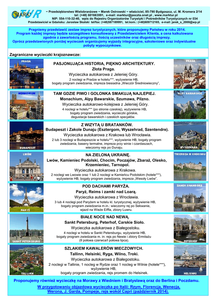 ~ Przedsiębiorstwo Wielobranżowe ~ Marek Ostrowski ~ właściciel, 85-790 Bydgoszcz, ul. M. Kromera 2/14 tel: (+48) 601663991, e-mail: [email protected] , www.marktur.pl NIP: 554-110-32-40, wpis do Rejestru Organizatorów Turystyki i Pośredników Turystycznych nr 034 Przedstawiciel w Gdańsku: Jarosław Skalski tel/fax: (+48)587189991, tel.kom.: (+48)609712165, e-mail: [email protected] Pragniemy przedstawić zestaw imprez turystycznych, które proponujemy Państwu w roku 2014. Program każdej imprezy będzie szczegółowo konsultowany z Przedstawicielem Klienta, a cena kalkulowana zgodnie z zawartością programu, ilością uczestników oraz długością imprezy. Oprócz przedstawionych poniżej wycieczek organizujemy wyjazdy integracyjne, szkoleniowe oraz indywidualne pobyty wypoczynkowe. Zagraniczne wycieczki krajoznawcze: PASJONUJĄCA HISTORIA, PIĘKNO ARCHITEKTURY. Złota Praga. Wycieczka autokarowa z Jeleniej Góry. 2 noclegi w Pradze w hotelu***, wyżywienie HB, bogaty program zwiedzania, impreza biesiadna „Wieczór Średniowieczny”, TAM GDZIE PIWO I GOLONKA SMAKUJĄ NAJLEPIEJ. Monachium, Alpy Bawarskie, Szumawa, Pilzno. Wycieczka autokarowo-kolejowa z Jeleniej Góry. 4 noclegi w hotelu*** (po stronie czeskiej), wyżywienie HB, bogaty program zwiedzania, wycieczki górskie, degustacje bawarskich i czeskich specjałów. Z WIZYTĄ U BRATANKÓW. Budapeszt i Zakole Dunaju (Esztergom, Wyszehrad, Szentendre). Wycieczka autokarowa z Krakowa lub Wrocławia. 2 lub 3 noclegi w Budapeszcie w hotelu***, wyżywienie HB, bogaty program zwiedzania, baseny termalne, impreza przy winie i czardaszach, wieczorny rejs po Dunaju. NA ZIELONĄ UKRAINĘ. Lwów, Kamieniec Podolski, Chocim, Poczajów, Zbaraż, Olesko, Krzemieniec, Tarnopol. Wycieczka autokarowa z Krakowa. 2 noclegi we Lwowie oraz 1 lub 2 noclegi w Kamieńcu Podolskim (hotele***), wyżywienie HB, bogaty program zwiedzania, impreza „Wesoły Lwów”. POD DACHAMI PARYŻA. Paryż, Reims i zamki nad Loarą. Wycieczka autokarowa z Wrocławia. 3 lub 4 noclegi pod Paryżem w hotelu kl. turystycznej, wyżywienie HB, bogaty program zwiedzania m.in.: wieczorny rej po Sekwanie, wjazd na Wieże Eiffla, zbiory Luwru. BIAŁE NOCE NAD NEWĄ. Sankt Petersburg, Peterhof, Carskie Sioło. Wycieczka autokarowa z Białegostoku. 4 noclegi w hotelu w Sankt Petersburgu, wyżywienie HB, bogaty program zwiedzania m. in: rejs po Newie i zbiory Ermitażu (II połowa czerwca/I połowa lipca). SZLAKIEM KAWALERÓW MIECZOWYCH. Tallinn, Helsinki, Ryga, Wilno, Troki. Wycieczka autokarowa z Białegostoku. 2 noclegi w Tallinie, 1 nocleg w Rydze oraz 1 nocleg w Wilnie (hotele***), wyżywienie HB, bogaty program zwiedzania, rejs promem do Helsinek. Proponujemy również wycieczkę na Morawy z Wiedniem i Bratysławą oraz do Berlina i Poczdamu. W przygotowaniu objazdowa wycieczka po Italii: Rzym, Florencja, Wenecja, Werona, J. Garda, Pompeje, rejs wokół Capri (październik 2014).