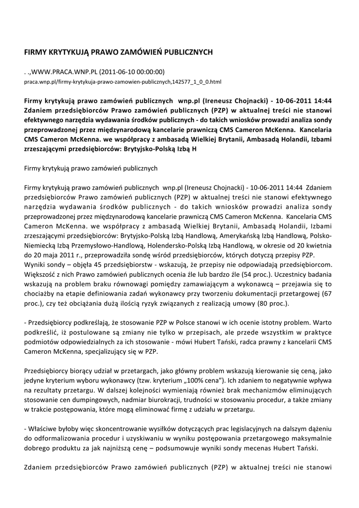 FIRMY KRYTYKUJĄ PRAWO ZAMÓWIEŃ PUBLICZNYCH . .,WWW.PRACA.WNP.PL (2011-06-10 00:00:00) praca.wnp.pl/firmy-krytykuja-prawo-zamowien-publicznych,142577_1_0_0.html Firmy krytykują prawo zamówień publicznych wnp.pl (Ireneusz Chojnacki) - 10-06-2011 14:44 Zdaniem przedsiębiorców Prawo zamówień publicznych (PZP) w aktualnej treści nie stanowi efektywnego narzędzia wydawania środków publicznych - do takich wniosków prowadzi analiza sondy przeprowadzonej przez międzynarodową kancelarie prawniczą CMS Cameron McKenna. Kancelaria CMS Cameron McKenna. we współpracy z ambasadą Wielkiej Brytanii, Ambasadą Holandii, Izbami zrzeszającymi przedsiębiorców: Brytyjsko-Polską Izbą H Firmy krytykują prawo zamówień publicznych Firmy krytykują prawo zamówień publicznych wnp.pl (Ireneusz Chojnacki) - 10-06-2011 14:44 Zdaniem przedsiębiorców Prawo zamówień publicznych (PZP) w aktualnej treści nie stanowi efektywnego narzędzia wydawania środków publicznych - do takich wniosków prowadzi analiza sondy przeprowadzonej przez międzynarodową kancelarie prawniczą CMS Cameron McKenna. Kancelaria CMS Cameron McKenna. we współpracy z ambasadą Wielkiej Brytanii, Ambasadą Holandii, Izbami zrzeszającymi przedsiębiorców: Brytyjsko-Polską Izbą Handlową, Amerykańską Izbą Handlową, PolskoNiemiecką Izbą Przemysłowo-Handlową, Holendersko-Polską Izbą Handlową, w okresie od 20 kwietnia do 20 maja 2011 r., przeprowadziła sondę wśród przedsiębiorców, których dotyczą przepisy PZP. Wyniki sondy – objęła 45 przedsiębiorstw - wskazują, że przepisy nie odpowiadają przedsiębiorcom. Większość z nich Prawo zamówień publicznych ocenia źle lub bardzo źle (54 proc.). Uczestnicy badania wskazują na problem braku równowagi pomiędzy zamawiającym a wykonawcą – przejawia się to chociażby na etapie definiowania zadań wykonawcy przy tworzeniu dokumentacji przetargowej (67 proc.), czy też obciążania dużą ilością ryzyk związanych z realizacją umowy (80 proc.). - Przedsiębiorcy podkreślają, że stosowanie PZP w Polsce stanowi w ich ocenie istotny problem. Warto podkreślić, iż postulowane są zmiany nie tylko w przepisach, ale przede wszystkim w praktyce podmiotów odpowiedzialnych za ich stosowanie - mówi Hubert Tański, radca prawny z kancelarii CMS Cameron McKenna, specjalizujący się w PZP. Przedsiębiorcy biorący udział w przetargach, jako główny problem wskazują kierowanie się ceną, jako jedyne kryterium wyboru wykonawcy (tzw. kryterium „100% cena”). Ich zdaniem to negatywnie wpływa na rezultaty przetargu. W dalszej kolejności wymieniają również brak mechanizmów eliminujących stosowanie cen dumpingowych, nadmiar biurokracji, trudności w stosowaniu procedur, a także zmiany w trakcie postępowania, które mogą eliminować firmę z udziału w przetargu. - Właściwe byłoby więc skoncentrowanie wysiłków dotyczących prac legislacyjnych na dalszym dążeniu do odformalizowania procedur i uzyskiwaniu w wyniku postępowania przetargowego maksymalnie dobrego produktu za jak najniższą cenę – podsumowuje wyniki sondy mecenas Hubert Tański. Zdaniem przedsiębiorców Prawo zamówień publicznych (PZP) w aktualnej treści nie stanowi efektywnego narzędzia wydawania środków publicznych - do takich wniosków prowadzi analiza sondy przeprowadzonej przez międzynarodową kancelarie prawniczą CMS Cameron McKenna. Kancelaria CMS Cameron McKenna. we współpracy z ambasadą Wielkiej Brytanii, Ambasadą Holandii, Izbami zrzeszającymi przedsiębiorców: Brytyjsko-Polską Izbą Handlową, Amerykańską Izbą Handlową, Polsko-Niemiecką Izbą Przemysłowo-Handlową, Holendersko-Polską Izbą Handlową, w okresie od 20 kwietnia do 20 maja 2011 r., przeprowadziła sondę wśród przedsiębiorców, których dotyczą przepisy PZP. Wyniki sondy – objęła 45 przedsiębiorstw - wskazują, że przepisy nie odpowiadają przedsiębiorcom. Większość z nich Prawo zamówień publicznych ocenia źle lub bardzo źle (54 proc.). Uczestnicy badania wskazują na problem braku równowagi pomiędzy zamawiającym a wykonawcą – przejawia się to chociażby na etapie definiowania zadań wykonawcy przy tworzeniu dokumentacji przetargowej (67 proc.), czy też obciążania dużą ilością ryzyk związanych z realizacją umowy (80 proc.). - Przedsiębiorcy podkreślają, że stosowanie PZP w Polsce stanowi w ich ocenie istotny problem. Warto podkreślić, iż postulowane są zmiany nie tylko w przepisach, ale przede wszystkim w praktyce podmiotów odpowiedzialnych za ich stosowanie - mówi Hubert Tański, radca prawny z kancelarii CMS Cameron McKenna, specjalizujący się w PZP. Przedsiębiorcy biorący udział w przetargach, jako główny problem wskazują kierowanie się ceną, jako jedyne kryterium wyboru wykonawcy (tzw. kryterium „100% cena”). Ich zdaniem to negatywnie wpływa na rezultaty przetargu. W dalszej kolejności wymieniają również brak mechanizmów eliminujących stosowanie cen dumpingowych, nadmiar biurokracji, trudności w stosowaniu procedur, a także zmiany w trakcie postępowania, które mogą eliminować firmę z udziału w przetargu. - Właściwe byłoby więc skoncentrowanie wysiłków dotyczących prac legislacyjnych na dalszym dążeniu do odformalizowania procedur i uzyskiwaniu w wyniku postępowania przetargowego maksymalnie dobrego produktu za jak najniższą cenę – podsumowuje wyniki sondy mecenas Hubert Tański.