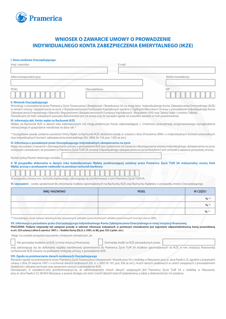 Pramerica Życie Towarzystwo Ubezpieczeń i Reasekuracji SA al. Jana Pawła II 23, 00-854 Warszawa tel. 22 329 30 00, fax 22 329 30 10 WNIOSEK O ZAWARCIE UMOWY O PROWADZENIE INDYWIDUALNEGO KONTA ZABEZPIECZENIA EMERYTALNEGO (IKZE) I. Dane osobowe Oszczędzającego: Imię i nazwisko E-mail Adres korespondencyjny Telefon kontaktowy PESEL Obywatelstwo NIP II. Wniosek Oszczędzającego Wnioskuję o prowadzenie przez Pramerica Życie Towarzystwo Ubezpieczeń i Reasekuracji SA na moją rzecz Indywidualnego Konta Zabezpieczenia Emerytalnego (IKZE) w ramach umowy ubezpieczenia na życie z Ubezpieczeniowym Funduszem Kapitałowym zgodnie z Ogólnymi Warunkami Umowy o prowadzenie Indywidualnego Konta Zabezpieczenia Emerytalnego (Warunki), Regulaminem Ubezpieczeniowych Funduszy Kapitałowych (Regulamin UFK) oraz Tabelą Opłat i Limitów (Tabela). Oświadczam, że treść wskazanych powyżej dokumentów jest mi znana oraz że wyrażam zgodę na wszystkie zawarte w nich postanowienia. III. Informacja dot. limitu wpłat na Rachunek IKZE Wpłaty na Rachunek IKZE w danym roku kalendarzowym nie mogą przekroczyć kwoty odpowiadającej 1, 2-krotności przeciętnego prognozowanego wynagrodzenia miesięcznego w gospodarce narodowej na dany rok. * * Szczegółowe zasady ustalania wysokości limitu Wpłat na Rachunek IKZE określone zostały w ustawie z dnia 20 kwietnia 2004 r. o indywidualnych kontach emerytalnych oraz indywidualnych kontach zabezpieczenia emerytalnego (Dz. 2004, Nr 116, poz. 1205 ze zm.). IV. Informacja o posiadanym przez Oszczędzającego indywidualnym ubezpieczeniu na życie Mając na uwadze, iż zawarcie i obowiązywanie umowy o prowadzenie IKZE jest uzależnione od zawarcia i obowiązywania umowy indywidualnego ubezpieczenia na życie, niniejszym oświadczam, że posiadam w Pramerica Życie TUiR SA umowę indywidualnego ubezpieczenia na życie/złożyłem/(-am) wniosek o zawarcie powyższej umowy. Numer polisy/Numer złożonego wniosku V. W przypadku dokonania w danym roku kalendarzowym Wpłaty przekraczającej ustalony przez Pramerica Życie TUiR SA maksymalny roczny limit Wpłat, proszę o przekazanie nadwyżki na poniższy rachunek bankowy: W przypadku zmiany ww. rachunku bankowego zobowiązuję się poinformować o tym Pramerica Życie TUiR SA. VI. Uposażeni – osoby uprawnione do otrzymania środków zgromadzonych na Rachunku IKZE oraz Rachunku Nadpłaty w przypadku śmierci Oszczędzającego. IMIĘ I NAZWISKO PESEL W CZĘŚCI % ** % ** % ** ** Oszczędzający może wskazać dowolną liczbę Uposażonych, jednakże suma określonych udziałów procentowych musi być równa 100%. VII. Informacje o posiadaniu przez Oszczędzającego Indywidualnego Konta Zabezpieczenia Emerytalnego w innej instytucji finansowej POUCZENIE: Podanie nieprawdy lub zatajenie prawdy w zakresie informacji wskazanych w poniższym oświadczeniu jest zagrożone odpowiedzialnością karną przewidzianą w art. 233 ustawy z dnia 6 czerwca 1997 r. – Kodeks Karny (Dz.U. z 1997, nr 88, poz. 553 z późn. zm.) Mając na uwadze powyższe pouczenie, niniejszym oświadczam, że: Nie gromadzę środków na IKZE w innej instytucji finansowej Gromadzę środki na IKZE prowadzonym przez: oraz zobowiązuję się do dokonania wypłaty transferowej (przeniesienia do Pramerica Życie TUiR SA środków zgromadzonych na IKZE w ww. instytucji finansowej) na Rachunek IKZE otwarty na podstawie niniejszej umowy o prowadzenie IKZE. VIII. Zgoda na przetwarzanie danych osobowych Oszczędzającego Wyrażam zgodę na przetwarzanie przez Pramerica Życie Towarzystwo Ubezpieczeń i Reasekuracji SA z siedzibą w Warszawie przy al. Jana Pawła II 23, zgodnie z przepisami ustawy z dnia 29 sierpnia 1997 r. o ochronie danych osobowych (Dz. U. z 2002 Nr 101, poz. 926 ze zm.), moich danych osobowych w celach związanych z prowadzeniem działalności ubezpieczeniowej oraz zawarciem umowy o prowadzenie IKZE. Oświadczam, iż zostałem/(-am) poinformowany/(-a), że administratorem moich danych osobowych jest Pramerica Życie TUiR SA z siedzibą w Warszawie, przy al. Jana Pawła II 23, 00-854 Warszawa, o prawie dostępu do treści moich danych oraz ich poprawiania, a także o dobrowolności ich podania. Sąd Rejonowy dla m. st. Warszawy XII Wydział Gospodarczy Krajowego Rejestru Sądowego, KRS 0000008906, NIP 526-22-62-838, Regon 013281575 Kapitał zakładowy 60 000 000,00 zł w całości opłacony IX. Formularz alokacji Wpłaty dokonanej w związku z umową o prowadzenie IKZE Pramerica Życie Towarzystwo Ubezpieczeń i Reasekuracji SA al. Jana Pawła II 23, 00-854 Warszawa tel. 22 329 30 00, fax 22 329 30 10 1. Wyjaśnienie dotyczące ryzyka związanego z wyborem Funduszy Przed podjęciem decyzji o alokacji Wpłaty prosimy o zapoznanie się z zamieszczonym na stronie internetowej www.pramerica.pl Regulaminem UFK, zawierającym szczegółowy opis Funduszy oraz związanych z nimi strategii inwestycyjnych oraz o zapoznanie się z poniższymi informacjami. Następnie prosimy o zaznaczenie akceptowanego przez Państwa poziomu ryzyka. Każdy z Funduszy, w zależności od celów oraz sposobu obracania Wpłatami, charakteryzuje się innym profilem ryzyka. Ważne jest, by Oszczędzający dokonał alokacji w te Fundusze, które odpowiadają jego profilowi akceptacji ryzyka. Fundusze Obligacji Niski poziom ryzyka Fundusze Stabilnego Wzrostu Umiarkowany poziom ryzyka Fundusze Akcji Wysoki poziom ryzyka Inwestują przede wszystkim w obligacje, bony skarbowe oraz depozyty i na podstawie przewidywanych trendów zmian stóp procentowych dążą do zapewnienia przychodów z lokat i oprocentowania. W zrównoważonym stopniu inwestują w papiery udziałowe (akcje) i dłużne (obligacje), dążąc do stałego wzrostu majątku i zapewnienia zysków w perspektywie średnio- i długoterminowej. Inwestują głównie w akcje spółek krajowych. Dążą do wypracowania zysku w perspektywie średnio- i długoterminowej wynikającego ze wzrostu cen aktywów poprzez odpowied