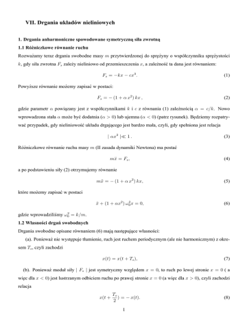 VII. Drgania układów nieliniowych 1. Drgania anharmoniczne spowodowane symetryczna˛ siła zwrotna˛ 1.1 Różniczkowe równanie ruchu Rozważamy teraz drgania swobodne masy m przytwierdzonej do spr˛eżyny o współczynniku spr˛eżystości k, gdy siła zwrotna Fs zależy nieliniowo od przemieszczenia x, a zależność ta dana jest równaniem: Fs = −kx − cx3 . (1) Powyższe równanie możemy zapisać w postaci: Fs = − (1 + α x2 ) kx , (2) gdzie parametr α powiazany ˛ jest z współczynnikami k i c z równania (1) zależnościa˛ α = c/k. Nowo wprowadzona stała α może być dodatnia (α > 0) lub ujemna (α < 0) (patrz rysunek). B˛edziemy rozpatrywać przypadek, gdy nieliniowość układu drgajacego ˛ jest bardzo mała, czyli, gdy spełniona jest relacja | αx2 |≪ 1 . (3) Różniczkowe równanie ruchu masy m (II zasada dynamiki Newtona) ma postać mẍ = Fs , (4) a po podstawieniu siły (2) otrzymujemy równanie mẍ = − (1 + α x2 ) kx, (5) ẍ + (1 + αx2 ) ω02 x = 0, (6) które możemy zapisać w postaci gdzie wprowadziliśmy ω02 = k/m. 1.2 Własności drgań swobodnych Drgania swobodne opisane równaniem (6) maja˛ nast˛epujace ˛ własności: (a). Ponieważ nie wyst˛epuje tłumienie, ruch jest ruchem periodycznym (ale nie harmonicznym) z okresem Ts , czyli zachodzi x(t) = x(t + Ts ), (7) (b). Ponieważ moduł siły | Fs | jest symetryczny wzgl˛edem x = 0, to ruch po lewej stronie x = 0 ( a wi˛ec dla x < 0) jest lustrzanym odbiciem ruchu po prawej stronie x = 0 (a wi˛ec dla x > 0), czyli zachodzi relacja x(t + Ts ) = − x(t). 2 1 (8) 1.3 Równanie ruchu x(t) i jego własności Jak wiadomo każde drganie periodyczne o okresie Ts może być przedstawione jako superpozycja drgań harmonicznych o cz˛estościach nωs (ωs = 2π/Ts ), czyli w postaci szeregu Fouriera: x(t) = A0 + A1 cos(ωs t + δ1 ) + A2 cos(2ωs t + δ2 ) + A3 cos(3ωs t + δ3 ) + · · · . (9) Przyjmijemy nast˛epujacy ˛ warunek poczatkowy ˛ omawianego ruchu: ẋ(0) = 0 (10) oznaczajacy, ˛ że pr˛edkość w chwili poczatkowej ˛ t = 0 jest równa zero. Zobaczmy,jak ten warunek wpływa na postać ogólnego rozwiazania ˛ (9). Obliczajac ˛ ẋ(t) z równania (9), mamy: ẋ(t) = −ωs A1 sin(ωs t + δ1 ) − 2ωs A2 sin(2ωs t + δ2 ) − 3ωs A3 sin(3ωs t + δ3 ) − · · · . (11) Stosujac ˛ do powyższego równania warunek (10), otrzymujemy wyrażenie ẋ(0) = − ωs A1 sin δ1 − 2ωs A2 sin δ2 − 3ωs A3 sin δ3 − · · · = 0, (12) które jest spełnione tylko wówczas, gdy δ1 = δ2 = δ3 = · · · = 0. (13) Szereg Fouriera (9) dany jest wi˛ec teraz równaniem x(t) = A0 + A1 cos ωs t + A2 cos 2ωs t + A3 cos 3ωs t + · · · , (14) które musi spełniać również warunek (8). Warunek ten spełniaja˛ tylko harmoniki nieparzyste równania (14), nie spełniaja˛ natomiast harmoniki parzyste oraz niezależny od czasu człon A0 (tzw. harmonika zerowa). Pokażemy to na przykładzie pierwszej i drugiej harmoniki. Dla pierwszej harmoniki mamy: cos ωs (t + 1 Ts ) = cos(ωs t + ωs Ts ) = cos(ωs t + π) = − cos ωs t, 2 2 (15) natomiast dla drugiej harmoniki cos 2ωs (t + Ts ) = cos(2ωs t + ωs Ts ) = cos(2ωs t + 2π) = cos 2ωs t, 2 (16) gdzie skorzystaliśmy z zależności ωs = 2π/Ts . Równanie (15) świadczy o tym, że człon A1 cos ωs t w równaniu (14) spełnia relacj˛e (8); podobie spełniaja˛ ja˛ wszystkie pozostałe człony z harmonikami nieparzystymi (można dla nich otrzymać zwiazki ˛ analogiczne do (15)). Natomiast równanie (16) wskazuje, że relacja (8) nie jest spełniona przez człon z druga˛ harmonika˛ w równaniu (14); relacj˛e (8) również nie spełniaja˛ pozostałe człony z harmonikami parzystymi w równaniu (14) oraz człon z A0 (harmonika zerowa), dla których łatwo można otrzymać relacje analogiczne do (16). 2 Tak wi˛ec rozwiazanie ˛ równania różniczkowego (6) jest dane tylko przez sum˛e nieparzystych harmonik. Przy bardzo małej nieliniowości określonej równaniem (3) możemy ograniczyć si˛e tylko do dwóch pierwszych członów, zaniedbujac ˛ pozostałe czyli x(t) = A1 cos ωs t + A3 cos 3ωs t + · · · . (17) Powyższe równanie możemy zapisać w nast˛epujacej ˛ wygodnej postaci: x = A(cos ωs t + ε cos 3ωs t + · · ·) , (18) gdzie A ≡ A1 jest amplituda˛ drgań swobodnych o cz˛estości podstawowej ωs , 3ωs jest cz˛estościa˛ trzeciej harmonicznej, a parametr anharmoniczności ε = A3 /A1 (wskazuje on na udział trzeciej harmonicznej w drganiach omawianego ukadu nieliniowego). Równanie (18) musi spełniać różniczkowe równanie ruchu (6), które teraz zapiszemy w postaci. ẍ + ω02 x + αω02 x3 = 0. (19) Korzystajac ˛ z faktu, że (18) jest rozwiazaniem ˛ równania (19), znajdziemy teraz postać, jaka˛ powinny mieć cz˛estość kołowa ωs i parametr ε, aby tak było. W tym celu obliczmy ẍ i x3 , a potem wspólnie z x podstawmy do równaia (19): ẋ = −ωs A sin ωs t − 3ωs εA sin 3ωs t, (20) ẍ = −ωs2 A cos ωs t − 9ωs2 Aε cos 3ωs t = −ωs2 A(cos ωs t + 9ε cos 3ωs t), (21) x3 = A3 (cos3 ωs t + 3ε cos2 ωs t cos 3ωs t + 3ε2 cos ωs t cos2 3ωs t + ε3 cos3 3ωs t), (22) przy czym dwa ostatnie człony w równaniu (22) możemy teraz pominać, ˛ ze wzgl˛edu na to, że bardzo mały parametr ε wyst˛epuje w nich w drugiej i trzeciej pot˛edze. W dalszej cz˛eści obliczeń pomijane b˛eda˛ wyrazy bardzo małe, zawierajace: ˛ ε2 , α2 , εα oraz ich wyższe pot˛egi. Podstawiajac ˛ ẍ, x3 oraz x do równania (19) mamy: −ωs2 A (cos ωs t + 9ε cos 3ωs t) + ω02 A (cos ωs t + ε cos 3ωs t + . . .) + 3 1 + αω02 A3 ( cos 3ωs t + cos ωs t + . . .) = 0, 4 4 (23) przy czym w ostatnim nawiasie powyższego równania wykorzystaliśmy nast˛epujac ˛ a˛ relacj˛e cos3 ωs t = 1 3 cos 3ωs t + cos ωs t. 4 4 (24) Grupujac ˛ człony z tymi samymi harmonikami, możemy równanie (23) zapisać w postaci: 1 3 (−ωs2 A + ω02 A + αω02 A3 ) cos ωs t + (−9εωs2 A