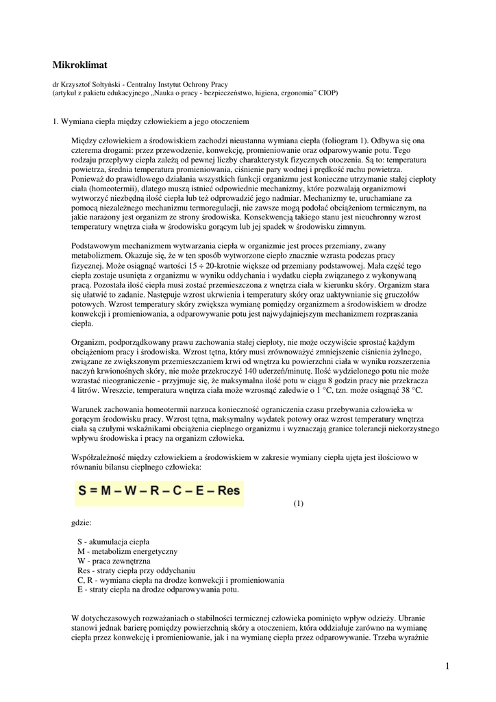 Mikroklimat dr Krzysztof Sołty ski - Centralny Instytut Ochrony Pracy (artykuł z pakietu edukacyjnego „Nauka o pracy - bezpiecze stwo, higiena, ergonomia” CIOP) 1. Wymiana ciepła mi dzy człowiekiem a jego otoczeniem Mi dzy człowiekiem a rodowiskiem zachodzi nieustanna wymiana ciepła (foliogram 1). Odbywa si ona czterema drogami: przez przewodzenie, konwekcj , promieniowanie oraz odparowywanie potu. Tego rodzaju przepływy ciepła zale od pewnej liczby charakterystyk fizycznych otoczenia. S to: temperatura powietrza, rednia temperatura promieniowania, ci nienie pary wodnej i pr dko ruchu powietrza. Poniewa do prawidłowego działania wszystkich funkcji organizmu jest konieczne utrzymanie stałej ciepłoty ciała (homeotermii), dlatego musz istnie odpowiednie mechanizmy, które pozwalaj organizmowi wytworzy niezb dn ilo ciepła lub te odprowadzi jego nadmiar. Mechanizmy te, uruchamiane za pomoc niezale nego mechanizmu termoregulacji, nie zawsze mog podoła obci eniom termicznym, na jakie nara ony jest organizm ze strony rodowiska. Konsekwencj takiego stanu jest nieuchronny wzrost temperatury wn trza ciała w rodowisku gor cym lub jej spadek w rodowisku zimnym. Podstawowym mechanizmem wytwarzania ciepła w organizmie jest proces przemiany, zwany metabolizmem. Okazuje si , e w ten sposób wytworzone ciepło znacznie wzrasta podczas pracy fizycznej. Mo e osi gn warto ci 15 ÷ 20-krotnie wi ksze od przemiany podstawowej. Mała cz tego ciepła zostaje usuni ta z organizmu w wyniku oddychania i wydatku ciepła zwi zanego z wykonywan prac . Pozostała ilo ciepła musi zosta przemieszczona z wn trza ciała w kierunku skóry. Organizm stara si ułatwi to zadanie. Nast puje wzrost ukrwienia i temperatury skóry oraz uaktywnianie si gruczołów potowych. Wzrost temperatury skóry zwi ksza wymian pomi dzy organizmem a rodowiskiem w drodze konwekcji i promieniowania, a odparowywanie potu jest najwydajniejszym mechanizmem rozpraszania ciepła. Organizm, podporz dkowany prawu zachowania stałej ciepłoty, nie mo e oczywi cie sprosta ka dym obci eniom pracy i rodowiska. Wzrost t tna, który musi zrównowa y zmniejszenie ci nienia ylnego, zwi zane ze zwi kszonym przemieszczaniem krwi od wn trza ku powierzchni ciała w wyniku rozszerzenia naczy krwiono nych skóry, nie mo e przekroczy 140 uderze /minut . Ilo wydzielonego potu nie mo e wzrasta nieograniczenie - przyjmuje si , e maksymalna ilo potu w ci gu 8 godzin pracy nie przekracza 4 litrów. Wreszcie, temperatura wn trza ciała mo e wzrosn zaledwie o 1 °C, tzn. mo e osi gn 38 °C. Warunek zachowania homeotermii narzuca konieczno ograniczenia czasu przebywania człowieka w gor cym rodowisku pracy. Wzrost t tna, maksymalny wydatek potowy oraz wzrost temperatury wn trza ciała s czułymi wska nikami obci enia cieplnego organizmu i wyznaczaj granice tolerancji niekorzystnego wpływu rodowiska i pracy na organizm człowieka. Współzale no mi dzy człowiekiem a rodowiskiem w zakresie wymiany ciepła uj ta jest ilo ciowo w równaniu bilansu cieplnego człowieka: (1) gdzie: S - akumulacja ciepła M - metabolizm energetyczny W - praca zewn trzna Res - straty ciepła przy oddychaniu C, R - wymiana ciepła na drodze konwekcji i promieniowania E - straty ciepła na drodze odparowywania potu. W dotychczasowych rozwa aniach o stabilno ci termicznej człowieka pomini to wpływ odzie y. Ubranie stanowi jednak barier pomi dzy powierzchni skóry a otoczeniem, która oddziałuje zarówno na wymian ciepła przez konwekcj i promieniowanie, jak i na wymian ciepła przez odparowywanie. Trzeba wyra nie 1 wskaza , e wpływ ubrania na wymian ciepła jest bardzo zło ony. Nale y wprowadzi wiele uproszcze u redniaj cych oraz pewne przybli enia. Praktycznie do bilansu cieplnego człowieka wnosi si czynniki korekcyjne: (2) dla wymiany ciepła przez konwekcj i promieniowanie oraz (3) jako czynnik redukuj cy wymian ciepła przez odparowywanie, gdzie: Icl - izolacja cieplna ubrania hc i hr - współczynnik wymiany ciepła przez konwekcj i promieniowanie. Obliczenie bilansu cieplnego (1) z uwzgl dnieniem korekcji (2) umo liwia wyliczenie obci enia termicznego. Obliczenie to, przeprowadzone przy zało eniu braku potu, a wi c przy zało eniu minimalnej wilgotno ci skóry, daje: S = M - W - R - C - Res (4) Gdy bilans cieplny jest dodatni, mamy do czynienia ze rodowiskiem gor cym, wymagaj cym uruchomienia mechanizmów walki z gor cem. Gdy bilans cieplny jest ujemny, mamy do czynienia ze rodowiskiem chłodnym, wymagaj cym uruchomienia mechanizmów walki z zimnem. Natomiast bilans cieplny jest równy zeru w rodowisku neutralnym. W rodowisku neutralnym ilo ciepła, które jest wytwarzane przez przemian w spoczynku lub podczas wykonywania okre lonej czynno ci, zostaje rozproszona w taki sposób, e temperatura wn trza ciała, bez udziału niezale nego mechanizmu termoregulacji, utrzymuje si na stałym poziomie. Z tego wzgl du w rodowisku tym wszyscy ludzie, bez wzgl du na płe , wiek i aklimatyzacj , czuj si jednakowo dobrze. Zupełnie odmiennie jest w rodowisku gor cym. Ilo ciepła wytwarzanego ulega wprawdzie rozproszeniu w stopniu umo liwiaj cym utrzymanie temperatury wn trza ciała na stałym poziomie, lecz musz zosta wł czone mechanizmy autonomicznej termoregulacji. W kra cowym przypadku ilo zgromadzonego ciepła nie mo e zosta rozproszona i temperatura wn trza ciała zaczyna si stopniowo podnosi . Sprawno mechanizmów utrzymuj cych stał ciepłot ciała zale y od ogólnej kondycji człowieka, przede wszystkim za od jego wydolno ci kr eniowej, ilo ci gruczołów potowych, aklimatyzacji, a wi c czynników zale nych od wieku, płci, wagi ciała oraz wytrenowania [11]. Współzale no mi dzy funkcj przenoszenia tlenu a funkcj przenoszenia ciepła powoduje u człowieka, w gor cym rodowisku pracy, zmiany aktywno ci psychosensomotorycznej. Obserwuje si spadek wydolno ci pracy i wska nika dokładno ci wykonywania zada (bł d, przeoczenie), [4]. Wynika st d konieczno klasyfikacji stanowi