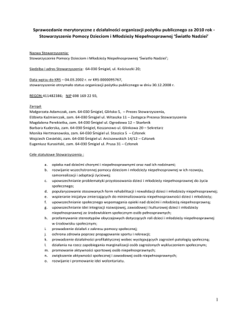 Sprawozdanie merytoryczne z działalności organizacji pożytku publicznego za 2010 rok Stowarzyszenie Pomocy Dzieciom i Młodzieży Niepełnosprawnej ‘Światło Nadziei’ Nazwa Stowarzyszenia: Stowarzyszenie Pomocy Dzieciom i Młodzieży Niepełnosprawnej ‘Światło Nadziei’; Siedziba i adres Stowarzyszenia: 64-030 Śmigiel, ul. Kościuszki 20; Data wpisu do KRS – 04.03.2002 r. nr KRS 0000095767, stowarzyszenie otrzymało status organizacji pożytku publicznego w dniu 30.12.2008 r. REGON 411482386; NIP 698 169 22 93, Zarząd: Małgorzata Adamczak, zam. 64-030 Śmigiel, Gliosko 5, – Prezes Stowarzyszenia, Elżbieta Kaźmierczak, zam. 64-030 Śmigiel ul. Witaszka 11 – Zastępca Prezesa Stowarzyszenia Magdalena Perekietka, zam. 64-030 Śmigiel ul. Ogrodowa 12 – Skarbnik Barbara Kuderska, zam. 64-030 Śmigiel, Koszanowo ul. Glinkowa 20 – Sekretarz Monika Hertmanowska, zam. 64-030 Śmigiel ul. Staszica 5 – Członek Wojciech Ciesielski, zam. 64-030 Śmigiel ul. Arciszewskich 14/12 – Członek Eugeniusz Kurasioski, zam. 64-030 Śmigiel ul. Prusa 31 – Członek Cele statutowe Stowarzyszenia : a. b. opieka nad dziedmi chorymi i niepełnosprawnymi oraz nad ich rodzinami; rozwijanie wszechstronnej pomocy dzieciom i młodzieży niepełnosprawnej w ich rozwoju, samorealizacji i adaptacji życiowej; c. upowszechnianie problematyki przystosowania dzieci i młodzieży niepełnosprawnej do życia społecznego; d. popularyzowanie stosowanych form rehabilitacji i rewalidacji dzieci i młodzieży niepełnosprawnej; e. wspieranie inicjatyw zmierzających do minimalizowania niepełnosprawności dzieci i młodzieży; f. upowszechnianie społecznego wspomagania opieki nad dziedmi i młodzieżą niepełnosprawną; g. upowszechnianie idei integracji rozwojowej, zawodowej i kulturowej dzieci i młodzieży niepełnosprawnej ze środowiskiem społecznym osób pełnosprawnych; h. przełamywanie stereotypów obyczajowych dotyczących roli dzieci i młodzieży niepełnosprawnej w środowisku społecznym; i. prowadzenie działao z zakresu pomocy społecznej; j. ochrona zdrowia poprzez propagowanie sportu i rekreacji; k. prowadzenie działalności profilaktycznej wobec występujących zagrożeo patologią społeczną; l. działania na rzecz zapobiegania marginalizacji osób zagrożonych wykluczeniem społecznym; m. promowanie aktywności sportowej osób niepełnosprawnych; n. zwiększenie aktywności społecznej i zawodowej osób niepełnosprawnych; o. rozwijanie i promowanie idei wolontariatu. 1 Wpływy z 1% podatku – 24.576,75 zł. Wydatki z 1% - 2.443,18 zł. koszty zatrudnienia rehabilitanta; koszty biletu wstępu do kina dla dzieci niepełnosprawnych, uczniów Zespołu Szkół Niepełnosprawnych w Kościanie; przewóz uczestników na olimpiadę bez barier; przewóz uczestników spotkania integracyjnego w Sokołowicach – dla rodziców dzieci niepełnosprawnych; pokrycie kosztów pobytu osób niepełnosprawnych na basenie; zakup artykułów na jubileusz Warsztatów Terapii Zajęciowej; koszty wydruku materiałów promocyjnych Stowarzyszenia; zakup artykułów na spotkanie mikołajkowe, uczestników WTZ; Działalnośd statutowa Stowarzyszenia: 1. Przez cały 2010 r. Stowarzyszenie prowadziło Warsztat Terapii Zajęciowej, który jest placówką pobytu dziennego, którego celem jest zwiększenie aktywności społecznej i zawodowej osób niepełnosprawnych; Warsztat prowadzimy w oparciu o Porozumienie z Powiatem Kościaoskim, Miastem Kościan i Stowarzyszeniem, z dnia 25.01.2008r. Na podstawie aneksu nr 1/10 do umowy z Powiatem Kościaoskim z dnia 14.02.2008. o dofinansowanie WTZ otrzymaliśmy dofinansowanie na działalnośd w wys. 522.000 zł. Warsztat realizuje zadania z zakresu rehabilitacji społecznej i zawodowej. Podstawą zajęd stanowi indywidualny program rehabilitacji i terapii dla każdego uczestnika przygotowany przez Radę Programową Warsztatu. Program zawiera formy i metody, zakres prowadzonej rehabilitacji oraz formy współpracy z rodziną lub opiekunem uczestnika. Na zajęcia uczęszcza 30 osób z niepełnosprawnością intelektualną z powiatu kościaoskiego oraz wolsztyoskiego. Zadania realizowane są w 6 pracowniach terapii : - gospodarstwa domowego - stolarskiej - plastycznej - krawieckiej - multimedialnej - ceramicznej Oprócz pracy w pracowniach realizowane są zadania zmierzające do ogólnego rozwoju poprzez kształtowanie umiejętności poza pracowniami: korzystanie z okolicznych punktów usługowych, gmachów użyteczności publicznej, zachowania się w miejscach publicznych, uczestnictwa w życiu kulturalnym i społecznym. WTZ współpracują też z wieloma instytucjami działającymi na rzecz osób niepełnosprawnych, uczestniczą w różnych konkursach, zawodach, imprezach dla osób niepełnosprawnych. WTZ organizują spotkania integracyjne dla uczestników oraz ich rodziców. W WTZ prowadzona jest również aktywizacja zawodowa osób niepełnosprawnych. 2. Przez cały 2010 r. na sali rehabilitacyjnej w Nietążkowie prowadzone były zajęcia z fizjoterapii. Zajęcia prowadzono nieodpłatnie, koszty zatrudnienia oraz zakupu sprzętu rehabilitacyjnego finansowane były z dotacji Burmistrza Śmigla, zgodnie z umową Nr 4/2010 z dnia 26 stycznia 2010 r. Zajęcia z fizjoterapii prowadziła Pani Irmina Łabęda – łącznie 339 godzin. Całkowity koszt zadania wynosił 6.938 zł. Z terapii skorzystało 10 osób. 2 Cele statutowe: popularyzowanie stosowanych form rehabilitacji i rewalidacji dzieci i młodzieży niepełnosprawnej oraz wspieranie inicjatyw zmierzających do minimalizowania niepełnosprawności dzieci i młodzieży. 3. Współpracujemy z Ośrodkiem Pomocy Społecznej w celu przekazywania z Banku Żywności pomocy żywnościowej dla osób znajdujących się w trudnej sytuacji życiowej. Sprowadzono 25,3 tony żywności o wartości 87.934 zł. dla 115 rodzin, w których było 457 osób. Cele statutowe - prowadzenie działao z zakresu pomocy społecznej; 4. W