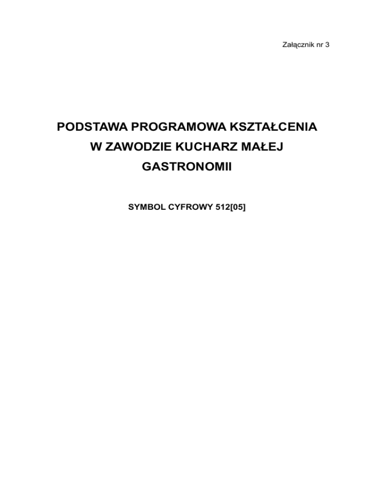 Załącznik nr 3 PODSTAWA PROGRAMOWA KSZTAŁCENIA W ZAWODZIE KUCHARZ MAŁEJ GASTRONOMII SYMBOL CYFROWY 512[05] I. OPIS ZAWODU 1. W wyniku kształcenia w zawodzie absolwent powinien umieć: 1) stosować zasady racjonalnego żywienia; 2) dokonywać jakościowej oceny surowców, półproduktów i potraw; 3) dobierać surowce do produkcji potraw i napojów; 4) przechowywać surowce, półprodukty i gotowe potrawy; 5) prowadzić racjonalną gospodarkę surowcami; 6) przygotowywać półprodukty potraw do sprzedaży w punktach małej gastronomii; 7) sporządzać potrawy i napoje oferowane do sprzedaży w przedsiębiorstwach i punktach małej gastronomii; 8) stosować różne techniki sporządzania potraw i napojów; 9) zestawiać potrawy i napoje w dania oraz posiłki; 10) opracowywać ofertę kulinarną dla małych przedsiębiorstw i punktów gastronomicznych; 11) przeprowadzać kalkulację cenową potraw i napojów; 12) użytkować narzędzia, maszyny i urządzenia stosowane w produkcji oraz ekspedycji potraw i napojów; 13) prowadzić bieżącą konserwację narzędzi, maszyn i urządzeń; 14) przestrzegać zasad zabezpieczania jakości zdrowotnej żywności; 15) przestrzegać przepisów sanitarnych; 16) stosować przepisy prawa dotyczące wykonywanych zadań zawodowych; 17) przestrzegać przepisów i zasad bezpieczeństwa i higieny pracy, przepisów ochrony przeciwpożarowej oraz ochrony środowiska; 18) organizować stanowisko pracy zgodnie z wymaganiami ergonomii; 19) komunikować się z uczestnikami procesu pracy; 20) stosować przepisy Kodeksu pracy dotyczące praw i obowiązków pracownika i pracodawcy; 21) udzielać pierwszej pomocy poszkodowanym w wypadkach przy pracy; 22) korzystać z różnych źródeł informacji; 23) prowadzić działalność gospodarczą. 2 Kształtowanie postaw przedsiębiorczych oraz przygotowanie do wejścia na rynek pracy powinno przebiegać zarówno w trakcie procesu kształcenia zawodowego, jak i podczas realizacji zajęć edukacyjnych “Podstawy przedsiębiorczości”. 2. Absolwent szkoły kształcącej w zawodzie kucharz małej gastronomii powinien być przygotowany do wykonywania następujących zadań zawodowych: 1) sporządzania typowych potraw i napojów; 2) przygotowywania półproduktów podstawowych potraw, napojów i innych wyrobów kulinarnych; 3) przeprowadzania obróbki cieplnej półproduktów potraw i napojów oraz ich bezpośredniej sprzedaży w punktach małej gastronomii; 4) przechowywania i magazynowania surowców, półproduktów i produktów kulinarnych. II. BLOKI PROGRAMOWE Zakres umiejętności i treści kształcenia, wynikający z opisu zawodu, zawierają następujące bloki programowe: 1) podstawy racjonalnego żywienia; 2) technologia gastronomiczna; 3) podstawy działalności zawodowej. BLOK: PODSTAWY RACJONALNEGO ŻYWIENIA 1. Cele kształcenia Uczeń (słuchacz) w wyniku kształcenia powinien umieć: 1) posługiwać się terminologią gastronomiczną; 2) określać podstawowe funkcje składników odżywczych; 3) określać wartość odżywczą i energetyczną podstawowych surowców i półproduktów stosowanych w małej gastronomii; 4) klasyfikować surowce, półprodukty i wyroby od pochodzenia i wartości odżywczej i energetycznej; 3 gotowe w zależności 5) dokonywać zamiany produktów spożywczych w grupie i między grupami; 6) układać i oceniać jadłospisy codzienne; 7) dobierać surowce i techniki wykonania potraw małej gastronomii w zależności od rodzaju diety; 8) zapobiegać niekorzystnym zmianom zachodzącym w surowcach i półproduktach podczas obróbki wstępnej i cieplnej oraz ekspedycji i przechowywania; 9) stosować zasady zabezpieczania jakości zdrowotnej żywności; 10) przestrzegać przepisów sanitarnych. 2. Treści kształcenia (działy programowe) Treści kształcenia są ujęte w następujących działach programowych: 1) podstawy żywienia; 2) wartość energetyczna i odżywcza żywności; 3) klasyfikacja surowców, półproduktów i wyrobów gotowych; 4) zasady układania jadłospisów; 5) podstawy mikrobiologii; 6) zasady żywienia dietetycznego; 7) przepisy sanitarne; 8) systemy zabezpieczania jakości zdrowotnej żywności. BLOK: TECHNOLOGIA GASTRONOMICZNA 1. Cele kształcenia Uczeń (słuchacz) w wyniku kształcenia powinien umieć: 1) oceniać produkty spożywcze pod względem towaroznawczym; 2) oceniać jakość surowców, półproduktów i innych wyrobów kulinarnych; 3) przechowywać surowce, półprodukty i wyroby gotowe; 4) dokonywać wstępnej i cieplnej obróbki surowców; 5) dobierać surowce i półprodukty do produkcji wyrobów małej gastronomii; 6) przygotowywać półprodukty potraw i napojów do wykończenia i bezpośredniej sprzedaży w punktach małej gastronomii; 7) sporządzać podstawowy asortyment potraw z warzyw, owoców i grzybów; 4 8) sporządzać podstawowy asortyment potraw z jaj, mleka i jego przetworów; 9) sporządzać podstawowy asortyment potraw i wyrobów kulinarnych z mąki i kaszy; 10) sporządzać podstawowy asortyment potraw z mięsa zwierząt rzeźnych, drobiu i ryb; 11) porcjować, wykończać i dekorować potrawy; 12) przygotowywać proste potrawy dietetyczne; 13) przygotowywać typowe potrawy kuchni staropolskiej i kuchni regionalnej; 14) przestrzegać zasad racjonalnego wykorzystywania surowców spożywczych; 15) dokonywać organoleptycznej oceny produktów spożywczych, potraw i napojów; 16) wdrażać systemy zarządzania jakością w produkcji żywności; 17) dobierać narzędzia, naczynia i sprzęt kuchenny do operacji technologicznych oraz ekspedycji wyrobów małej gastronomii; 18) dobierać maszyny i urządzenia do rodzaju i wielkości produkcji; 19) posługiwać się narzędziami do obróbki technologicznej oraz ekspedycji potraw i napojów; 20) użytkować maszyny i urządzenia gastronomiczne; 21) dokonywać konserwacji sprzętu kuchennego, maszyn i urządzeń stosowanych w produkcji i ekspedycji potraw i napojów; 22) organizować i wykony