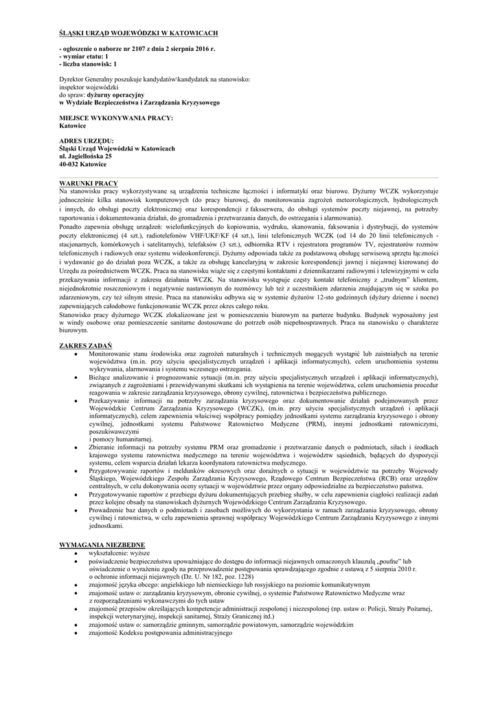 ŚLĄSKI URZĄD WOJEWÓDZKI W KATOWICACH - ogłoszenie o naborze nr 2107 z dnia 2 sierpnia 2016 r. - wymiar etatu: 1 - liczba stanowisk: 1 Dyrektor Generalny poszukuje kandydatów\kandydatek na stanowisko: inspektor wojewódzki do spraw: dyżurny operacyjny w Wydziale Bezpieczeństwa i Zarządzania Kryzysowego MIEJSCE WYKONYWANIA PRACY: Katowice ADRES URZĘDU: Śląski Urząd Wojewódzki w Katowicach ul. Jagiellońska 25 40-032 Katowice WARUNKI PRACY Na stanowisku pracy wykorzystywane są urządzenia techniczne łączności i informatyki oraz biurowe. Dyżurny WCZK wykorzystuje jednocześnie kilka stanowisk komputerowych (do pracy biurowej, do monitorowania zagrożeń meteorologicznych, hydrologicznych i innych, do obsługi poczty elektronicznej oraz korespondencji z faksserwera, do obsługi systemów poczty niejawnej, na potrzeby raportowania i dokumentowania działań, do gromadzenia i przetwarzania danych, do ostrzegania i alarmowania). Ponadto zapewnia obsługę urządzeń: wielofunkcyjnych do kopiowania, wydruku, skanowania, faksowania i dystrybucji, do systemów poczty elektronicznej (4 szt.), radiotelefonów VHF/UKF/KF (4 szt.), linii telefonicznych WCZK (od 14 do 20 linii telefonicznych stacjonarnych, komórkowych i satelitarnych), telefaksów (3 szt.), odbiornika RTV i rejestratora programów TV, rejestratorów rozmów telefonicznych i radiowych oraz systemu wideokonferencji. Dyżurny odpowiada także za podstawową obsługę serwisową sprzętu łączności i wydawanie go do działań poza WCZK, a także za obsługę kancelaryjną w zakresie korespondencji jawnej i niejawnej kierowanej do Urzędu za pośrednictwem WCZK. Praca na stanowisku wiąże się z częstymi kontaktami z dziennikarzami radiowymi i telewizyjnymi w celu przekazywania informacji z zakresu działania WCZK. Na stanowisku występuje częsty kontakt telefoniczny z „trudnym” klientem, niejednokrotnie roszczeniowym i negatywnie nastawionym do rozmówcy lub też z uczestnikiem zdarzenia znajdującym się w szoku po zdarzeniowym, czy też silnym stresie. Praca na stanowisku odbywa się w systemie dyżurów 12-sto godzinnych (dyżury dzienne i nocne) zapewniających całodobowe funkcjonowanie WCZK przez okres całego roku. Stanowisko pracy dyżurnego WCZK zlokalizowane jest w pomieszczeniu biurowym na parterze budynku. Budynek wyposażony jest w windy osobowe oraz pomieszczenie sanitarne dostosowane do potrzeb osób niepełnosprawnych. Praca na stanowisku o charakterze biurowym. ZAKRES ZADAŃ Monitorowanie stanu środowiska oraz zagrożeń naturalnych i technicznych mogących wystąpić lub zaistniałych na terenie województwa (m.in. przy użyciu specjalistycznych urządzeń i aplikacji informatycznych), celem uruchomienia systemu wykrywania, alarmowania i systemu wczesnego ostrzegania. Bieżące analizowanie i prognozowanie sytuacji (m.in. przy użyciu specjalistycznych urządzeń i aplikacji informatycznych), związanych z zagrożeniami i przewidywanymi skutkami ich wystąpienia na terenie województwa, celem uruchomienia procedur reagowania w zakresie zarządzania kryzysowego, obrony cywilnej, ratownictwa i bezpieczeństwa publicznego. Przekazywanie informacji na potrzeby zarządzania kryzysowego oraz dokumentowanie działań podejmowanych przez Wojewódzkie Centrum Zarządzania Kryzysowego (WCZK), (m.in. przy użyciu specjalistycznych urządzeń i aplikacji informatycznych), celem zapewnienia właściwej współpracy pomiędzy jednostkami systemu zarządzania kryzysowego i obrony cywilnej, jednostkami systemu Państwowe Ratownictwo Medyczne (PRM), innymi jednostkami ratowniczymi, poszukiwawczymi i pomocy humanitarnej. Zbieranie informacji na potrzeby systemu PRM oraz gromadzenie i przetwarzanie danych o podmiotach, siłach i środkach krajowego systemu ratownictwa medycznego na terenie województwa i województw sąsiednich, będących do dyspozycji systemu, celem wsparcia działań lekarza koordynatora ratownictwa medycznego. Przygotowywanie raportów i meldunków okresowych oraz doraźnych o sytuacji w województwie na potrzeby Wojewody Śląskiego, Wojewódzkiego Zespołu Zarządzania Kryzysowego, Rządowego Centrum Bezpieczeństwa (RCB) oraz urzędów centralnych, w celu dokonywania oceny sytuacji w województwie przez organy odpowiedzialne za bezpieczeństwo państwa. Przygotowywanie raportów z przebiegu dyżuru dokumentujących przebieg służby, w celu zapewnienia ciągłości realizacji zadań przez kolejne obsady na stanowiskach dyżurnych Wojewódzkiego Centrum Zarządzania Kryzysowego. Prowadzenie baz danych o podmiotach i zasobach możliwych do wykorzystania w ramach zarządzania kryzysowego, obrony cywilnej i ratownictwa, w celu zapewnienia sprawnej współpracy Wojewódzkiego Centrum Zarządzania Kryzysowego z innymi jednostkami. WYMAGANIA NIEZBĘDNE wykształcenie: wyższe poświadczenie bezpieczeństwa upoważniające do dostępu do informacji niejawnych oznaczonych klauzulą „poufne” lub oświadczenie o wyrażeniu zgody na przeprowadzenie postępowania sprawdzającego zgodnie z ustawą z 5 sierpnia 2010 r. o ochronie informacji niejawnych (Dz. U. Nr 182, poz. 1228) znajomość języka obcego: angielskiego lub niemieckiego lub rosyjskiego na poziomie komunikatywnym znajomość ustaw o: zarządzaniu kryzysowym, obronie cywilnej, o systemie Państwowe Ratownictwo Medyczne wraz z rozporządzeniami wykonawczymi do tych ustaw znajomość przepisów określających kompetencje administracji zespolonej i niezespolonej (np. ustaw o: Policji, Straży Pożarnej, inspekcji weterynaryjnej, inspekcji sanitarnej, Straży Granicznej itd.) znajomość ustaw o: samorządzie gminnym, samorządzie powiatowym, samorządzie wojewódzkim znajomość Kodeksu postępowania administracyjnego znajomość topografii województwa śląskiego znajomość ustaw o: służbie cywilnej, wojewodzie i administracji rządowej w województwie znajomość zarządzenia PRM ws. wytycznych w zakresie przestrzegania zasad służ