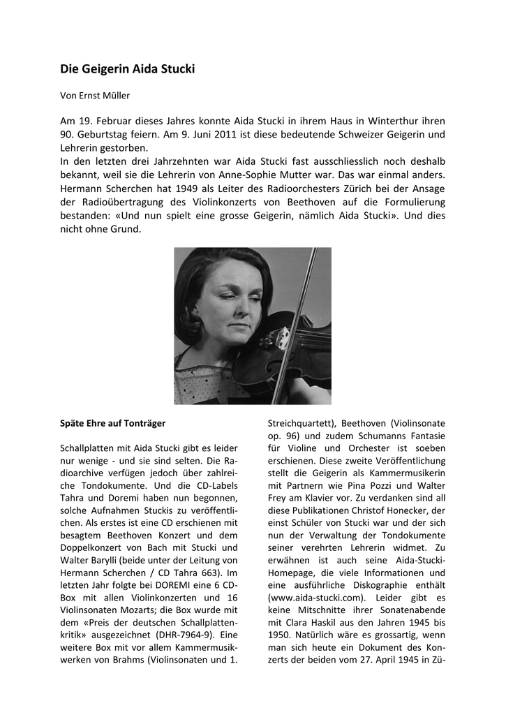 Die Geigerin Aida Stucki Von Ernst Müller Am 19. Februar dieses Jahres konnte Aida Stucki in ihrem Haus in Winterthur ihren 90. Geburtstag feiern. Am 9. Juni 2011 ist diese bedeutende Schweizer Geigerin und Lehrerin gestorben. In den letzten drei Jahrzehnten war Aida Stucki fast ausschliesslich noch deshalb bekannt, weil sie die Lehrerin von Anne-Sophie Mutter war. Das war einmal anders. Hermann Scherchen hat 1949 als Leiter des Radioorchesters Zürich bei der Ansage der Radioübertragung des Violinkonzerts von Beethoven auf die Formulierung bestanden: «Und nun spielt eine grosse Geigerin, nämlich Aida Stucki». Und dies nicht ohne Grund. Späte Ehre auf Tonträger Schallplatten mit Aida Stucki gibt es leider nur wenige - und sie sind selten. Die Radioarchive verfügen jedoch über zahlreiche Tondokumente. Und die CD-Labels Tahra und Doremi haben nun begonnen, solche Aufnahmen Stuckis zu veröffentlichen. Als erstes ist eine CD erschienen mit besagtem Beethoven Konzert und dem Doppelkonzert von Bach mit Stucki und Walter Barylli (beide unter der Leitung von Hermann Scherchen / CD Tahra 663). Im letzten Jahr folgte bei DOREMI eine 6 CDBox mit allen Violinkonzerten und 16 Violinsonaten Mozarts; die Box wurde mit dem «Preis der deutschen Schallplattenkritik» ausgezeichnet (DHR-7964-9). Eine weitere Box mit vor allem Kammermusikwerken von Brahms (Violinsonaten und 1. Streichquartett), Beethoven (Violinsonate op. 96) und zudem Schumanns Fantasie für Violine und Orchester ist soeben erschienen. Diese zweite Veröffentlichung stellt die Geigerin als Kammermusikerin mit Partnern wie Pina Pozzi und Walter Frey am Klavier vor. Zu verdanken sind all diese Publikationen Christof Honecker, der einst Schüler von Stucki war und der sich nun der Verwaltung der Tondokumente seiner verehrten Lehrerin widmet. Zu erwähnen ist auch seine Aida-StuckiHomepage, die viele Informationen und eine ausführliche Diskographie enthält (www.aida-stucki.com). Leider gibt es keine Mitschnitte ihrer Sonatenabende mit Clara Haskil aus den Jahren 1945 bis 1950. Natürlich wäre es grossartig, wenn man sich heute ein Dokument des Konzerts der beiden vom 27. April 1945 in Zü- rich mit Mozarts Violinsonate KV 376, Beethovens op. 30 Nr. 3 und der dritten Brahms-Sonate (op. 108) anhören könnte. Schon zu Beginn der 40er Jahre hatte Haskil geschrieben: «Man wird noch von der jungen Aida Stucki sprechen, die mir gestern im Radio aufgefallen ist und bei deren Spiel ich heisse Tränen vergossen habe.» Das Cover der CD Tahra 663 Biographisches Aida Stucki wurde am 19. 2. 1921 in Kairo als Tochter eines Winterthurer Unternehmers und einer italienischen Mutter (Clothilde Lazzaro, eine Sängerin, die bedingt durch eine fragile Gesundheit jung starb) geboren. Nach ersten Studien bei Walter Wolters in Winterthur und einem Debut als 15-Jährige mit dem Winterthurer Stadtorchester (mit einem Violinkonzert Mozarts) studierte sie von 1941 bis 1943 bei Stefi Geyer, der Muse Bartoks und Schoecks, in Zürich, und später bis zu dessen Tod im Jahre 1945 beim legendären Carl Flesch in Luzern. Bereits zuvor, nämlich als Neunzehnjährige, hatte sie 1940 den 1. Preis am Internationalen Musikwettbewerb in Genf gewonnen. 1945 heiratete sie den Florentiner Geiger Giuseppe Piraccini (1908-1991), der nacheinander in Florenz, Winterthur und Zürich als Konzertmeister wirkte. Mit Piraccini, sowie dem Bratschisten Hermann Friedrich und dem Cellisten Walter Haefeli bildete sie das Piraccini-Stucki-Quartett, das grosses internationales Ansehen genoss. Aida Stucki war eine begeisterte Kammermusikerin; sie spielte Violinsonaten mit Pina Pozzi, Clara Haskil und Elly Ney und bildete mit der Pianistin Pina Pozzi und der Cellistin Esther Nyffenegger einige Zeit ein Klaviertrio. Ihre Karriere als Interpretin endete unvermittelt im Jahre 1983, als sie bei einem Sturz zuhause den Bruch beider Handgelenke erlitt. In der Folge konzentrierte sich die Geigerin ganz auf das Unterrichten; 1992 wurde für die damals 71-Jährige am Winterthurer Konservatorium eine Meisterklasse geschaffen. Anne-Sophie Mutter war in den 70er Jahren Schülerin von Aida Stucki. Zudem haben – um einzelne bekannte Namen zu nennen – Rahel Cunz, die Schwestern Mirjam und Sibylle Tschopp, sowie Matthias Enderle und Susanne Frank (die Geiger des Carmina Quartetts) bei Stucki studiert. Anne-Sophie Mutter lässt bis heute kaum eine Gelegenheit ungenutzt, um in Interviews ihre tiefe Verehrung für ihre Lehrerin auszudrücken, mit der sie bis in die letzten Tage in ständigem telefonischem Kontakt stand. Die «Anne-SophieMutter-Stiftung» verlieh im April dieses Jahres erstmals den «Aida-Stucki-Preis». Um diesem Ereignis angemessen Gewicht zu verleihen, fand die Preisübergabe anlässlich eines Rezitals in New York statt, in dem Mutter gemeinsam mit dem Preisträger, dem Kontrabassisten Roman Patkoló, zwei Werke für Violine und Kontrabass uraufführte: Wolfgang Rihms «Dyade» und Krzystof Pendereckis «Duo concertante», beides Auftragswerke der MutterStiftung. (Der 1982 in der Slowakei geborene Roman Patkoló unterrichtet übrigens seit 2009 in Basel.) Ein breites Repertoire Aida Stucki verfügte über ein breites Repertoire. Ihre Konzertkarriere begann nach dem Zweiten Weltkrieg. Gemeinsam mit ihrem Mann Giuseppe Piraccini spielte sie häufig Werke für zwei Violinen und ging mit dem Piraccini-Stucki Quartett in Europa auf Tournee. Mehrmals spielte das Quartett auf vier Stradivari-Instrumenten, die Otto von Habisreuter zur Verfügung gestellt hatte. Es fällt auf, dass das Quartett neben herkömmlichen Quartettwerken auch viel Zeitgenössisches im Repertoire hatte, so etwa Streichquartette von Luc Balmer, Racine Fricker, Arthur Honegger, Rolf Looser, Gian Francesco Malipiero. Auffallend ist zudem die Häufigkeit von Aufführungen mit Werken für Singstimme und Streichquartett. Hier gilt es etwa Werke von Niklos Skalkotta, Othmar Schoeck und Armin Schibler zu nennen. Das gleiche Bi