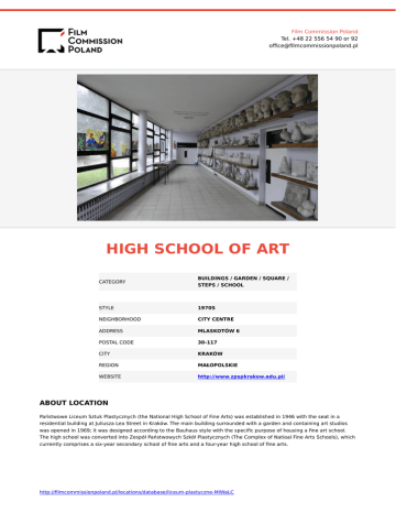 Film Commission Poland Tel. +48 22 556 54 90 or 92 office@filmcommissionpoland.pl HIGH SCHOOL OF ART CATEGORY BUILDINGS / GARDEN / SQUARE / STEPS / SCHOOL STYLE 1970S NEIGHBORHOOD CITY CENTRE ADDRESS MLASKOTÓW 6 POSTAL CODE 30-117 CITY KRAKÓW REGION MAŁOPOLSKIE WEBSITE http://www.zpspkrakow.edu.pl/ ABOUT LOCATION Państwowe Liceum Sztuk Plastycznych (the National High School of Fine Arts) was established in 1946 with the seat in a residential building at Juliusza Lea Street in Kraków. The main building surrounded with a garden and containing art studios was opened in 1969; it was designed according to the Bauhaus style with the specific purpose of housing a fine art school. The high school was converted into Zespół Państwowych Szkół Plastycznych (The Complex of Natioal Fine Arts Schools), which currently comprises a six-year secondary school of fine arts and a four-year high school of fine arts. http://filmcommissionpoland.pl/locations/database/liceum-plastyczne-MIWaLC