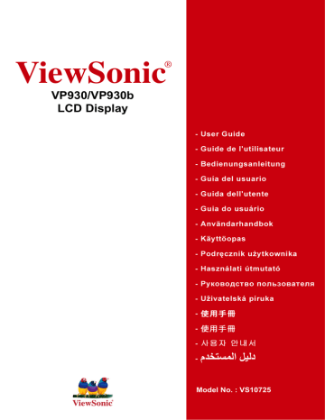 ® ViewSonic VP930/VP930b LCD Display Model No. : VS10725 Spis treúci TCO informacja ................................................................................................ i Oświadczenia o zgodności z przepisami ........................................................1 Ważne instrukcje bezpieczeństwa...................................................................2 Prawo autorskie informacja .............................................................................3 Rejestracja produktu........................................................................................3 Wprowadzenie Zawartość opakowania ...................................................................................4 Środki ostrożności ..........................................................................................4 Szybka instalacja ............................................................................................5 Tryby widoku/Poziomy i pionowy ....................................................................6 Podnoszenie i opuszczanie ekranu ................................................................6 Przygotowanie do montażu na ścianie (Opcja) ..............................................7 Korzystanie z monitora LCD Display Ustawianie trybu synchronizacji .....................................................................8 Ustawienia blokady menu ekranowego OSD i przycisku zasilania ................8 Regulacja obrazu ............................................................................................9 Elementy sterujące menu głównego ............................................................. 11 Inne informacje Dane techniczne ...........................................................................................15 Rozwiązywanie problemów ..........................................................................16 Pomoc techniczna klienta .............................................................................17 Czyszczenie monitora LCD Display .............................................................18 Limited Warranty ..........................................................................................19 ViewSonic VP930/VP930b TCO informacja Congratulations! The display you have just purchased carries the TCO’03 Displays label. This means that your display is designed, manufactured and tested according to some of the strictest quality and environmental requirements in the world. This makes for a high performance product, designed with the user in focus that also minimizes the impact on our natural environment. Some of the features of the TCO’03 Display requirements: Ergonomics Good visual ergonomics and image quality in order to improve the working environment for the user and to reduce sight and strain problems. Important parameters are luminance, contrast, resolution, reflectance, colour rendition and image stability. Energy • Energy-saving mode after a certain time - beneficial both for the user and the environment • Electrical safety Emissions • Electromagnetic fields • Noise emissions Ecology • The product must be prepared for recycling and the manufacturer must have a certified environmental management system such as EMAS or ISO 14000 • Restrictions on a. chlorinated and brominated flame retardants and polymers b. heavy metals such as cadmium, mercury and lead. The requirements included in this label have been developed by TCO Development in cooperation with scientists, experts, users as well as manufacturers all over the world. Since the end of the 1980s TCO has been involved in influencing the development of IT equipment in a more user-friendly direction. Our labelling system started with displays in 1992 and is now requested by users and IT-manufacturers all over the world. For more information, please visit www.tcodevelopment.com ViewSonic VP930/VP930b i Oświadczenia o zgodności z przepisami For U.S.A. This equipment has been tested and found to comply with the limits for a Class B digital device, pursuant to part 15 of the FCC Rules. These limits are designed to provide reasonable protection against harmful interference in a residential installation. This equipment generates, uses, and can radiate radio frequency energy, and if not installed and used in accordance with the instructions, may cause harmful interference to radio communications. However, there is no guarantee that interference will not occur in a particular installation. If this equipment does cause harmful interference to radio or television reception, which can be determined by turning the equipment off and on, the user is encouraged to try to correct the interference by one or more of the following measures: • Reorient or relocate the receiving antenna. • Increase the separation between the equipment and receiver. • Connect the equipment into an outlet on a circuit different from that to which the receiver is connected. • Consult the dealer or an experienced radio/TV technician for help. FCC Warning To assure continued FCC compliance, the user must use grounded power supply cord and the cables which are included with the equipment or specified. Also, any unauthorized changes or modifications not expressly approved by the party responsible for compliance could void the user's authority to operate this device. For Canada This Class B digital apparatus complies with Canadian ICES-003. Cet appareil numérique de la classe B est conforme à la norme NMB-003 du Canada. For European Countries CE Conformity The device complies with the requirements of the EEC directive 89/336/EEC as amended by 92/31/EEC and 93/68/EEC Art.5 with regard to “Electromagnetic compatibility,” and 73/23/EEC as amended by 93/68/EEC Art.13 with regard to “Safety.” User Information for all Countries Notice: Use the cables which are included with the unit or specified. ViewSonic VP930/VP930b 1 Ważne instrukcje bezpieczeństwa 1. Przeczytaj nin
